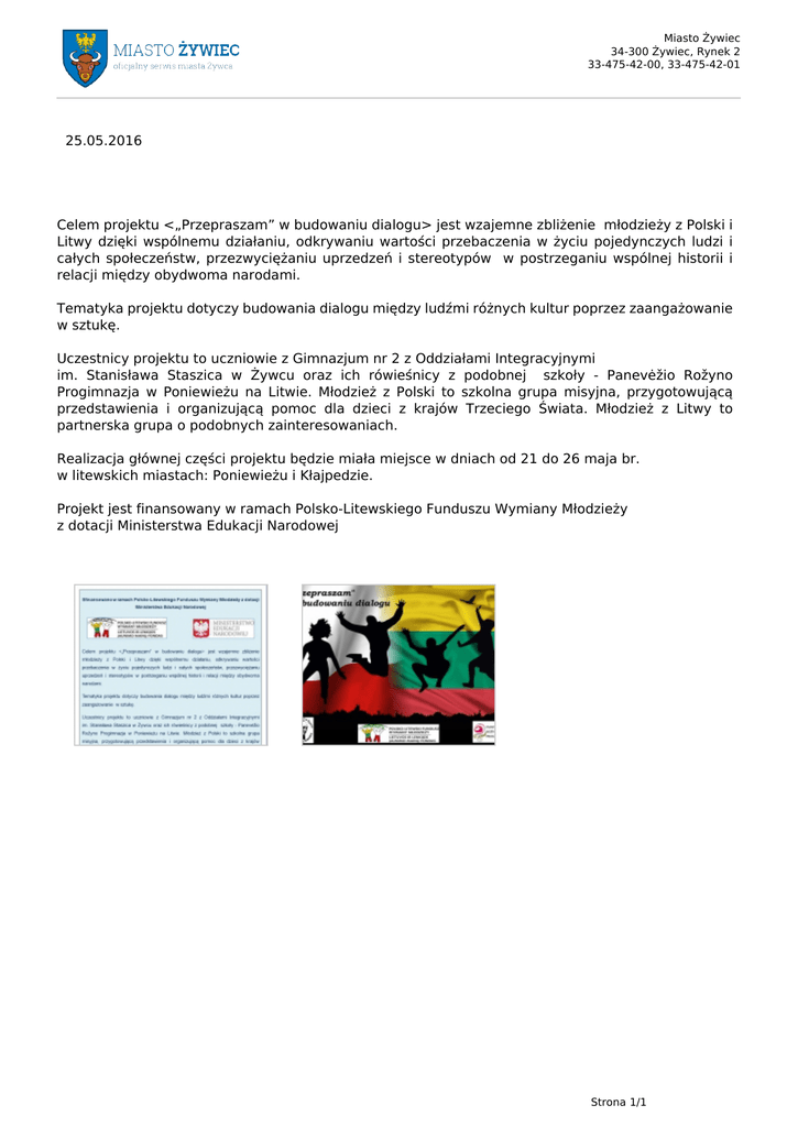Miasto Żywiec 34-300 Żywiec, Rynek 2 33-475-42-00, 33-475-42-01 25.05.2016 Celem projektu <„Przepraszam” w budowaniu dialogu> jest wzajemne zbliżenie młodzieży z Polski i Litwy dzięki wspólnemu działaniu, odkrywaniu wartości przebaczenia w życiu pojedynczych ludzi i całych społeczeństw, przezwyciężaniu uprzedzeń i stereotypów w postrzeganiu wspólnej historii i relacji między obydwoma narodami. Tematyka projektu dotyczy budowania dialogu między ludźmi różnych kultur poprzez zaangażowanie w sztukę. Uczestnicy projektu to uczniowie z Gimnazjum nr 2 z Oddziałami Integracyjnymi im. Stanisława Staszica w Żywcu oraz ich rówieśnicy z podobnej szkoły - Panevėžio Rožyno Progimnazja w Poniewieżu na Litwie. Młodzież z Polski to szkolna grupa misyjna, przygotowującą przedstawienia i organizującą pomoc dla dzieci z krajów Trzeciego Świata. Młodzież z Litwy to partnerska grupa o podobnych zainteresowaniach. Realizacja głównej części projektu będzie miała miejsce w dniach od 21 do 26 maja br. w litewskich miastach: Poniewieżu i Kłajpedzie. Projekt jest finansowany w ramach Polsko-Litewskiego Funduszu Wymiany Młodzieży z dotacji Ministerstwa Edukacji Narodowej Strona 1/1 Powered by TCPDF (www.tcpdf.org)