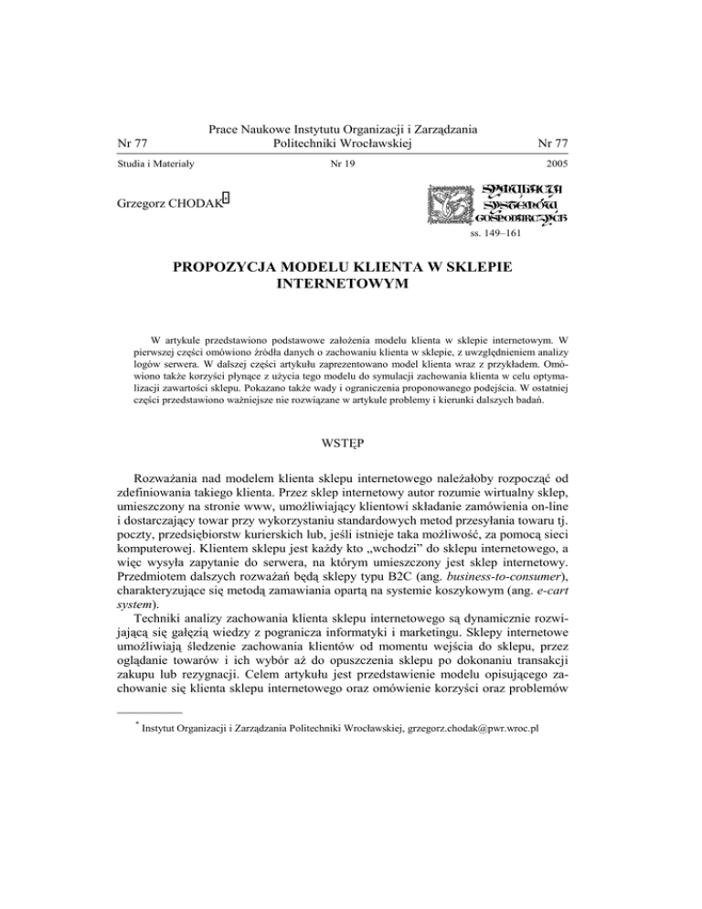 Prace Naukowe Instytutu Organizacji i Zarządzania Politechniki Wrocławskiej Nr 77 Studia i Materiały Nr 77 Nr 19 2005 Grzegorz CHODAK* ss. 149–161 PROPOZYCJA MODELU KLIENTA W SKLEPIE INTERNETOWYM W artykule przedstawiono podstawowe założenia modelu klienta w sklepie internetowym. W pierwszej części omówiono źródła danych o zachowaniu klienta w sklepie, z uwzględnieniem analizy logów serwera. W dalszej części artykułu zaprezentowano model klienta wraz z przykładem. Omówiono także korzyści płynące z użycia tego modelu do symulacji zachowania klienta w celu optymalizacji zawartości sklepu. Pokazano także wady i ograniczenia proponowanego podejścia. W ostatniej części przedstawiono ważniejsze nie rozwiązane w artykule problemy i kierunki dalszych badań. WSTĘP Rozważania nad modelem klienta sklepu internetowego należałoby rozpocząć od zdefiniowania takiego klienta. Przez sklep internetowy autor rozumie wirtualny sklep, umieszczony na stronie www, umożliwiający klientowi składanie zamówienia on-line i dostarczający towar przy wykorzystaniu standardowych metod przesyłania towaru tj. poczty, przedsiębiorstw kurierskich lub, jeśli istnieje taka możliwość, za pomocą sieci komputerowej. Klientem sklepu jest każdy kto „wchodzi” do sklepu internetowego, a więc wysyła zapytanie do serwera, na którym umieszczony jest sklep internetowy. Przedmiotem dalszych rozważań będą sklepy typu B2C (ang. business-to-consumer), charakteryzujące się metodą zamawiania opartą na systemie koszykowym (ang. e-cart system). Techniki analizy zachowania klienta sklepu internetowego są dynamicznie rozwijającą się gałęzią wiedzy z pogranicza informatyki i marketingu. Sklepy internetowe umożliwiają śledzenie zachowania klientów od momentu wejścia do sklepu, przez oglądanie towarów i ich wybór aż do opuszczenia sklepu po dokonaniu transakcji zakupu lub rezygnacji. Celem artykułu jest przedstawienie modelu opisującego zachowanie się klienta sklepu internetowego oraz omówienie korzyści oraz problemów __________ * Instytut Organizacji i Zarządzania Politechniki Wrocławskiej, [email protected] 150 Grzegorz Chodak jakie wiążą się z praktycznym wykorzystaniem tego modelu. W pierwszej części artykułu przedstawiono źródła danych o zachowaniu się klienta w sklepie internetowym jako podstawową bazę informacyjną dla zaprezentowanego modelu. 1. ŹRÓDŁA DANYCH O ZACHOWANIU KLIENTA W SKLEPIE INTERNETOWYM Aby możliwe było zbudowanie modelu klienta, konieczne jest zgromadzenie danych na temat jego zachowania w sklepie internetowym. Dane te są gromadzone standardowo w dwóch miejscach: są to logi serwera www oraz bazy danych sklepu. Handel internetowy ma pewne cechy specyficzne, umożliwiające śledzenie zachowania klienta w sklepie. Rejestrację akcji podejmowanych przez klienta w sklepie internetowym można porównać do nagrywania filmu przy pomocy kamery video podczas robienia zakupów w tradycyjnym supermarkecie. Chodząc po sklepie i wrzucając produkty do koszyka klient supermarketu jest anonimowy, a jego identyfikacja odbywa się przy kasie podczas płacenia kartą kredytową. Podobnie klient sklepu internetowego jest częściowo anonimowy podczas przeglądania zawartości sklepu i wybierania produktów, a jego pełna identyfikacja odbywa się po zalogowaniu się lub rejestracji w sklepie najczęściej „przy kasie”, czyli podczas finalizacji transakcji. Zachowanie klienta jest rejestrowane zarówno w pliku logów serwera jak i w bazach danych sklepu. Dane do analizy można podzielić więc na dwie grupy: dane transakcyjne (ang. transaction-based data) oraz dane związane z konkretnym id klienta (ang. consumer-based data) [Theusinger 2000]. Obecnie na rynku dostępnych jest wiele programów do analizy logów serwera takich jak np. Awstats (www.awstats.org), Webalizer (www.webalizer.org), Analog (www.analog.cx), Report-Magic (www.reportmagic.org). Analiza danych zawartych w logu serwera www, określana w literaturze jako web mining analysis, jest gałęzią dziedziny wiedzy zwanej eksploracją danych (data mining). Analiza logów serwera ma jednak swoją specyfikę, która wynika głównie z charakteru danych i sposobu ich gromadzenia. Zapisy w logach serwera zawierają między innymi adres IP komputera, z którego nastąpiło odwołanie, nazwę pliku, jego wielkość i etykietę czasową. Techniki eksploracji danych wykrywają powtarzające się wzorce w ramach transakcji lub sekwencji transakcji użytkowników. W analizie logów serwera stosuje się takie techniki eksploracji danych, jak odkrywanie częstych ścieżek nawigacji (ang. path traversal patterns) oraz techniki ogólnego przeznaczenia tj. odkrywanie reguł asocjacyjnych (ang. association rules) i wzorców sekwencji (ang. sequential patterns) oraz klasyfikację (ang. classification) i grupowanie (ang. clustering) [Wojciechowski 1999]. Akcje podejmowane przez klienta mogą być także rejestrowane w specjalnie do tego celu skonstruowanej bazie danych. Standardowo w bazie danych zapisywana jest Propozycja modelu klienta w sklepie internetowym 151 całość nawigacji dotyczących zamówień oraz wyświetlanych stron. Najczęściej małe i średnie sklepy wykorzystują relacyjne bazy danych oparte na serwerze MySQL, natomiast oprogramowanie dla dużych sklepów oparte jest na zaawansowanych serwerach baz danych Oracle czy Sybase. Informacje zawarte w bazach danych powiązanych z analizatorem odwiedzin sklepu umożliwiają uzyskanie informacji na temat: • oglądalności danego towaru – liczba otwartych stron zawierających informacje o danym towarze, • liczby „wrzuceń” danego towaru do koszyka – liczba ta nie jest równa liczbie zamówień danego towaru, ponieważ klient może zrezygnować ze sfinalizowania zamówienia, bądź wyrzucić dany produkt z koszyka, • liczby klientów wchodzących na stronę sklepu i rejestrujących się, • liczby klientów 
