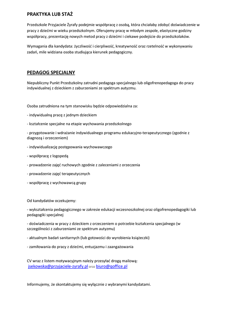 PRAKTYKA LUB STAŻ Przedszkole Przyjaciele Żyrafy podejmie współpracę z osobą, która chciałaby zdobyć doświadczenie w pracy z dziećmi w wieku przedszkolnym. Oferujemy pracę w młodym zespole, elastyczne godziny współpracy, prezentację nowych metod pracy z dziećmi i ciekawe podejście do przedszkolaków. Wymagania dla kandydata: życzliwość i cierpliwość, kreatywność oraz rzetelność w wykonywaniu zadań, mile widziana osoba studiująca kierunek pedagogiczny. PEDAGOG SPECJALNY Niepubliczny Punkt Przedszkolny zatrudni pedagoga specjalnego lub oligofrenopedagoga do pracy indywidualnej z dzieckiem z zaburzeniami ze spektrum autyzmu. Osoba zatrudniona na tym stanowisku będzie odpowiedzialna za: - indywidualną pracę z jednym dzieckiem - kształcenie specjalne na etapie wychowania przedszkolnego - przygotowanie i wdrażanie indywidualnego programu edukacyjno-terapeutycznego (zgodnie z diagnozą i orzeczeniem) - indywidualizację postępowania wychowawczego - współpracę z logopedą - prowadzenie zajęć ruchowych zgodnie z zaleceniami z orzeczenia - prowadzenie zajęć terapeutycznych - współpracę z wychowawcą grupy Od kandydatów oczekujemy: - wykształcenia pedagogicznego w zakresie edukacji wczesnoszkolnej oraz oligofrenopedagogiki lub pedagogiki specjalnej - doświadczenia w pracy z dzieckiem z orzeczeniem o potrzebie kształcenia specjalnego (w szczególności z zaburzeniami ze spektrum autyzmu) - aktualnym badań sanitarnych (lub gotowości do wyrobienia książeczki) - zamiłowania do pracy z dziećmi, entuzjazmu i zaangażowania CV wraz z listem motywacyjnym należy przesyłać drogą mailową: [email protected] oraz [email protected] Informujemy, że skontaktujemy się wyłącznie z wybranymi kandydatami.