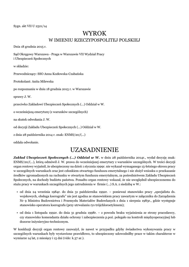 Sygn. akt VII U 2521/14 WYROK W IMIENIU RZECZYPOSPOLITEJ POLSKIEJ Dnia 18 grudnia 2015 r. Sąd Okręgowy Warszawa - Praga w Warszawie VII Wydział Pracy i Ubezpieczeń Społecznych w składzie: Przewodniczący: SSO Anna Kozłowska-Czabańska Protokolant: Anita Milewska po rozpoznaniu w dniu 18 grudnia 2015 r. w Warszawie sprawy J. W. przeciwko Zakładowi Ubezpieczeń Społecznych (...) Oddział w W. o wcześniejszą emeryturę (z warunków szczególnych) na skutek odwołania J. W. od decyzji Zakładu Ubezpieczeń Społecznych (...) Oddział w W. z dnia 28 października 2014 r. znak: ENMS/20/(...) oddala odwołanie. UZASADNIENIE Zakład Ubezpieczeń Społecznych (...) Oddział w W. w dniu 28 października 2014r., wydał decyzję znak: ENMS/20/(...), którą odmówił J. W. prawa do wcześniejszej emerytury z warunków szczególnych. W treści decyzji organ rentowy wyjaśnił, że ubezpieczony na dzień 1 stycznia 1999r. nie wykazał wymaganego 15-letniego okresu pracy w szczególnych warunkach oraz jest członkiem otwartego funduszu emerytalnego i nie złożył wniosku o przekazanie środków zgromadzonych na rachunku w otwartym funduszu emerytalnym, za pośrednictwem Zakładu Ubezpieczeń Społecznych, na dochody budżetu państwa. Ponadto organ rentowy wskazał, że nie uwzględnił ubezpieczonemu do stażu pracy w warunkach szczególnych jego zatrudnienia w firmie (...) S.A. z siedzibą w W.: • od dnia 24 września 1984r. do dnia 31 października 1992r. – ponieważ stanowisko pracy „specjalista ds. wojskowych, obsługa kserografu” nie jest zgodna ze stanowiskiem pracy zawartym w załączniku do Zarządzenia Nr 9 Ministra Budownictwa i Przemysłu Materiałów Budowlanych z dnia 1 sierpnia 1983r., gdzie występuje stanowisko operatora kserografu (przy utrwalaniu rys trójchloroetylenem); • od dnia 1 listopada 1992r. do dnia 31 grudnia 1998r. – z powodu braku wyjaśnienia ze strony pracodawcy, czy stanowisko komendanta działu ochrony i zabezpieczenia p.poż. polegało na kontroli międzyoperacyjnej lub dozorze inżynieryjno-technicznym. W konkluzji decyzji organ rentowy zauważył, że nawet w przypadku gdyby świadectwa wykonywania pracy w szczególnych warunkach były wystawione prawidłowo, to ubezpieczony udowodniłby prace w takim charakterze w wymiarze 14 lat, 2 miesięcy i 15 dni (vide: k.37 ar.). Ubezpieczony J. W., w dniu 3 grudnia 2014r., odwołał się od decyzji z dnia 28 października 2014r. podważając dokonane przez ZUS ustalenia. Wnioskodawca w treści odwołania podniósł między innymi, że organ rentowy niezasadnie nie uwzględnił mu do stażu pracy w warunkach szczególnych okresu jego zatrudnienia w firmie (...) S.A. z siedzibą w W. od dnia 24 września 1984r. do dnia 31 października 1992r. oraz w okresie od dnia 1 listopad 1992r. do dnia 31 grudnia 1998r. Nadto ubezpieczony zauważył, że organ rentowy w ogóle nie wziął pod rozwagę – jako pracy w warunkach szczególnych - jego zatrudnienia w okresie od 1972r. do 1980r. tj. zatrudnienia w (...) Ośrodków (...) w W.. Jednocześnie wnioskodawca wskazał, że w dniu 27 listopada 2014r. (już po wydaniu decyzji przez ZUS) złożył za pośrednictwem organu rentowego wniosek o przekazanie środków zgromadzonych na rachunku w otwartym funduszu emerytalnym na dochody budżetu państwa (vide: k.2-5 as.). Zakład Ubezpieczeń Społecznych (...) Oddział w W., w odpowiedzi na odwołanie z dnia 29 grudnia 2014r., wniósł o oddalenie odwołania na podstawie art.47714 § 1 k.p.c. Organ rentowy w uzasadnieniu odpowiedzi na odwołanie podtrzymał swoje dotychczasowe stanowisko zaprezentowane w decyzji z dnia 28 października 2014r. i ponownie podniósł, że ubezpieczony nie spełnił (na dzień 1 stycznia 1999r.) wymogu legitymowania się 15 latami pracy w szczególnych warunkach. Dodatkowo organ rentowy odniósł się do kwestii niezaliczenia do stażu pracy w warunkach szczególnych okresu zatrudnienia ubezpieczonego od dnia 5 lipca 1972r. do dnia 6 lipca 1980r. w (...) Ośrodku (...) i wskazał, że w ramach postępowania administracyjnego ZUS nie miał możliwości do uwzględniania tych okresów w oparciu o zeznania świadków. Nadto organ rentowy przyznał, że w dniu 27 listopada 2014r. otrzymał wniosek ubezpieczonego o przekazanie środków zgromadzonych na rachunku w OFE na dochody budżetu państwa (vide: k.12-13 as.). Zaakcentowania wymaga, iż do zamknięcia rozprawy, w dniu 18 grudnia 2015r., strony postępowania co do zasady nie modyfikowały zgłoszonych stanowisk i wywodziły jak dotychczas (vide: k.89-90 as.). Sąd Okręgowy ustalił następujący stan faktyczny: Ubezpieczony J. W. – urodzony w dniu (...) - w dniu 5 sierpnia 2014r. złożył do Zakładu Ubezpieczeń Społecznych (...) Oddział w W. wniosek o wcześniejszą emeryturę (vide: k. 1-3 ar.). Do wniosku ubezpieczony dołączył kwestionariusz dotyczący okresów składkowych i nieskładkowych (vide: k.4-5 ar.), wraz z dokumentacją potwierdzającą jego dotychczasowe zatrudnienie (vide: k.6-31 ar.). Powyższe skutkowało zainicjowaniem postępowania wyjaśniającego przed ZUS, po przeprowadzeniu którego organ rentowy ustalił, że ubezpieczony na dzień 1 stycznia 1999r. legitymuje się łącznym stażem pracy w wymiarze 26 lat i 3 miesięcy. Organ rentowy na podstawie dokumentów dołączonych do wniosku ustalił też, że ubezpieczony legitymuje się hipotetycznym stażem pracy w warunkach szczególnych w wymiarze 14 lat, 2 miesięcy i 15 dni - przy uwzględnieniu okresu od dnia 24 września 1984r. do dnia 31 października 1992r.; od dnia 1 listopada 1992r. do dnia 31 grudnia 1998r.; od dnia 27 kwietnia 1998r. do dnia 30 kwietnia 1998r.; od dnia 8 czerwca 1998r. do dnia 25 czerwca 1998r. Przy czym organ rentowy, w ramach postępowania administracyjnego nie uwzględnił wnioskodawcy do stażu pracy w warunkach szczególnych jego zatrudnienia w firmie (...) S.A. z siedzibą w W.: 1) od dnia 24 września 1984r. do dnia 31 p