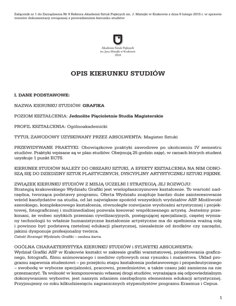 Załącznik nr 1 do Zarządzenia Nr 9 Rektora Akademii Sztuk Pięknych im. J. Matejki w Krakowie z dnia 9 lutego 2015 r. w sprawie wzorów dokumentacji związanej z prowadzeniem kierunku studiów OPIS KIERUNKU STUDIÓW I. DANE PODSTAWOWE: NAZWA KIERUNKU STUDIÓW: GRAFIKA POZIOM KSZTAŁCENIA: Jednolite Pięcioletnie Studia Magisterskie PROFIL KSZTAŁCENIA: Ogólnoakademicki TYTUŁ ZAWODOWY UZYSKIWANY PRZEZ ABSOLWENTA: Magister Sztuki PRZEWIDYWANE PRAKTYKI: Obowiązkowe praktyki zawodowe po ukończeniu IV semestru studiów. Praktyki wpisane są w plan studiów. Obejmują 25 godzin zajęć, w ramach których student uzyskuje 1 punkt ECTS. KIERUNEK STUDIÓW NALEŻY DO OBSZARU SZTUKI, A EFEKTY KSZTAŁCENIA NA NIM ODNOSZĄ SIĘ DO DZIEDZINY SZTUK PLASTYCZNYCH, DYSCYPLINY ARTYSTYCZNEJ SZTUKI PIĘKNE. ZWIĄZEK KIERUNKU STUDIÓW Z MISJĄ UCZELNI I STRATEGIĄ JEJ ROZWOJU: Strategią krakowskiego Wydziału Grafiki jest wielopłaszczyznowe kształcenie. To wartość nadrzędna, tworząca podstawy programu. Oferta Wydziału znajduje bardzo duże zainteresowanie wśród kandydatów na studia, od lat największe spośród wszystkich wydziałów ASP. Możliwość szerokiego, kompleksowego kształcenia, równoległe rozwijanie wyobraźni artystycznej i projektowej, fotograficznej i multimedialnej pozwala kreować współczesnego artystę. Jesteśmy przekonani, że wobec szybkich przemian cywilizacyjnych, postępującej specjalizacji, częstej wymiany technologii to właśnie humanistyczne kształcenie artystyczne ma do spełnienia ważną rolę i powinno być podstawą rzetelnej edukacji plastycznej, niezależnie od środków czy narzędzi, jakimi dysponuje profesjonalny twórca. Całość Strategii Wydziału Grafiki – osobna karta. OGÓLNA CHARAKTERYSTYKA KIERUNKU STUDIÓW i SYLWETKI ABSOLWENTA: Wydział Grafiki ASP w Krakowie kształci w zakresie grafiki warsztatowej, projektowania graficznego, fotografii, filmu animowanego i mediów cyfrowych oraz rysunku i malarstwa. Układ programu zapewnia studentowi – po przejściu etapu kształcenia podstawowego i propedeutycznego – swobodę w wyborze specjalności, pracowni, przedmiotów, a także czasu jaki zamierza na nie przeznaczyć. Ta wolność w komponowaniu własnej drogi studiów, wyrażająca się odpowiedzialnym dokonywaniem wyborów, jest naszym zdaniem niezbędnym elementem edukacji artystycznej. Przyjmujemy co roku kilkudziesięciu zagranicznych stypendystów programu Erasmus i Cepus. 1 Załącznik nr 1 do Zarządzenia Nr 9 Rektora Akademii Sztuk Pięknych im. J. Matejki w Krakowie z dnia 9 lutego 2015 r. w sprawie wzorów dokumentacji związanej z prowadzeniem kierunku studiów Uzyskane kwalifikacje powinny pozwalać absolwentowi na kreatywne podejmowanie wyzwań współczesnej sztuki w zakresie grafiki warsztatowej, grafiki cyfrowej, projektowania graficznego, rysunku, fotografii, filmu animowanego czy działań multimedialnych. Absolwent jest przygotowany do podjęcia samodzielnej i profesjonalnej działalności artystycznej i projektowej. Posiada kompetencje pozwalające na rozpoczęcie studiów doktoranckich. Nabyte na studiach doświadczenie warsztatowe, szerokie wykształcenie plastyczne, pozyskana wiedza humanistyczna – wysoka dojrzałość artystyczna w poszczególnych dziedzinach otwierają wiele terytoriów aktywności po ukończeniu studiów. Kształcenie skonstruowane jest na tyle komplementarnie, że pozwala wykorzystywać ten potencjał często alternatywnie, co w praktyczny sposób wspomaga czystą twórczość artystyczną a w sferę projektową wnosi ceniony w agencjach projektowych element swobodnej, odważnej kreacji artystycznej. ANALIZA ZGODNOŚCI ZAKŁADANYCH EFEKTÓW KSZTAŁCENIA Z POTRZEBAMI RYNKU PRACY: Monitorowanie kariery zawodowej absolwentów odbywa się w oparciu o działalność Biura Karier Akademii Sztuk Pięknych w Krakowie, które jest wiodącą wśród polskich uczelni artystycznych jednostką tego typu. Od grudnia 2013 roku Biuro Karier realizuje na zlecenie MKiDN konkursowy, ogólnopolski projekt monitorowania kariery zawodowej absolwentów. Dodatkowym źródłem pozyskiwania danych niezbędnych do prowadzenia w/w analizy są ankiety przekazywane absolwentom w chwili ukończenia studiów. Należy tu jednak zaznaczyć, że przekazywanie ich zawartości Wydziałowi odbywa się na zasadzie dobrowolności. Zgodność zakładanych efektów kształcenia z potrzebami rynku pracy jest stale weryfikowana w oparciu o doświadczenie wynikające z praktycznej aktywności zawodowej pedagogów na rynku sztuki i polu działalności artystycznej, projektowej, wydawniczej etc. REKRUTACJA: Do odbywania studiów na Wydziale Grafiki Akademii Sztuk Pięknych im. Jana Matejki w Krakowie może być dopuszczona osoba, która posiada świadectwo dojrzałości uzyskane w Polsce lub za granicą, oraz przystąpi do egzaminu wstępnego, w ramach którego uzyska wymaganą liczbę punktów rankingowych. Egzamin wstępny na Pięcioletnie Jednolite Studia Magisterskie składa się z trzech etapów: I. Przegląd i ocena prac – kandydaci prezentują prace własne, które winny szeroko reprezentować ich możliwości, przygotowanie i charakter zainteresowań. II. Egzamin praktyczny – seria zadań rysunkowych i malarskich z natury, oraz kompozycje z wyobraźni. III. Egzamin teoretyczny – sprawdzian wiedzy z zakresu kultury, oraz związanej ze specyfiką kierunku studiów. Ocenie podlegają wszystkie etapy/zadania egzaminu wstępnego, w etapie II wszystkie zadania egzaminu praktycznego. Zasady konkursu eliminują po każdym etapie kolejną grupę kandydatów, którzy nie uzyskali wymaganego minimum punktów. Po każdym etapie publikowane są listy dopuszczonych do kolejnego etapu, wyniki punktowe egzaminu podawane są po zakończeniu procesu rekrutacji. Na studia zostaną przyjęci kandydaci, którzy: zostali dopuszczeni do wszystkich etapów/zadań egzaminu wstępnego, uzyskali odpowiednią liczbę punktów za obowiązujące zadani
