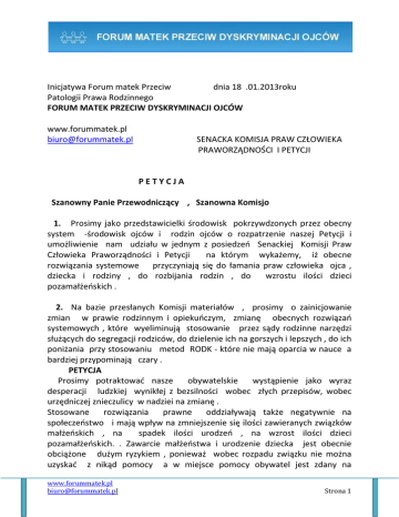 Inicjatywa Forum matek Przeciw dnia 18 .01.2013roku Patologii Prawa Rodzinnego FORUM MATEK PRZECIW DYSKRYMINACJI OJCÓW www.forummatek.pl [email protected] SENACKA KOMISJA PRAW CZŁOWIEKA PRAWORZĄDNOŚCI I PETYCJI PETYCJA Szanowny Panie Przewodniczący , Szanowna Komisjo 1. Prosimy jako przedstawicielki środowisk pokrzywdzonych przez obecny system -środowisk ojców i rodzin ojców o rozpatrzenie naszej Petycji i umożliwienie nam udziału w jednym z posiedzeń Senackiej Komisji Praw Człowieka Praworządności i Petycji na którym wykażemy, iż obecne rozwiązania systemowe przyczyniają się do łamania praw człowieka ojca , dziecka i rodziny , do rozbijania rodzin , do wzrostu ilości dzieci pozamałżeńskich . 2. Na bazie przesłanych Komisji materiałów , prosimy o zainicjowanie zmian w prawie rodzinnym i opiekuńczym, zmianę obecnych rozwiązań systemowych , które wyeliminują stosowanie przez sądy rodzinne narzędzi służących do segregacji rodziców, do dzielenie ich na gorszych i lepszych , do ich poniżania przy stosowaniu metod RODK - które nie mają oparcia w nauce a bardziej przypominają czary . PETYCJA Prosimy potraktować nasze obywatelskie wystąpienie jako wyraz desperacji ludzkiej wynikłej z bezsilności wobec złych przepisów, wobec urzędniczej znieczulicy w nadziei na zmianę . Stosowane rozwiązania prawne oddziaływają także negatywnie na społeczeństwo i mają wpływ na zmniejszenie się ilości zawieranych związków małżeńskich , na spadek ilości urodzeń , na wzrost ilości dzieci pozamałżeńskich. . Zawarcie małżeństwa i urodzenie dziecka jest obecnie obciążone dużym ryzykiem , ponieważ wobec rozpadu związku nie można uzyskać z nikąd pomocy a w miejsce pomocy obywatel jest zdany na www.forummatek.pl [email protected] Strona 1 przechodzenie przez piekło ocen i badań RODK przez ograniczanie mu bez powodu praw a tylko dlatego ,że się stara pomóc dziecku . Jak wynika w danych GUS za 2011 r. co piąte dziecko rodzi się jako nieślubne , w niektórych województwach ( warmińsko- pomorskim ) ten wskaźnik wynosi 38% . Młodzi ludzie opowiadają się przeciw wchodzeniom w związki z obawy przed problemami wynikającymi z systemu . Na obecnych systemowych rozwiązaniach cierpią dzieci , bo się ich czyni półsierotami społecznymi zabierając im systemowo ojców , cierpią ojcowie których system odsuwa od ich własnych dzieci i cierpimy my rodziny , którym zabrania się spotykać wnuków , cierpi całe społeczeństwo . Zarzucamy państwu zbyt daleko idącą ingerencje w rodzinę tymi wszelkimi ograniczeniami i ocenami człowieka ,odsuwania go od własnego dziecka , bez jednoczesnego brania odpowiedzialności za następstwa takich unormowań systemowych . W licznym pismach podajemy dane statystyczne o ilości półsierot w kraju których system wyprodukował - milion pięćset jedenaście tysięcy- (według wskazań GUS za 2007 rok sierot ) .Tylko 4 % ojców ma powierzaną przez sądy pieczę nad dzieckiem . Nie jest prawdą, że ojcowie nie garną się do wychowywania swoich dzieci jak się to kłamliwie usiłuje przedstawić , jest prawdą że system prawa rodzinnego i opinie RODK im to uniemożliwiają. Wprowadzone w 2008 r. zmiany do kodeksu rodzinnego i opiekuńczego , do art. 58 i 107 spowodowały drastyczne pogorszenie sytuacji dzieci , ojców i rodzin . Przywieziono ze Stanów Zjednoczonych rozwiązanie w postaci planu wychowawczego i wkomponowano je do naszych rodzimych uprzedzeń do ojców , co spowodowało iż zadziałał system który pozbawia dzieci ojców . Poprzez kult matki nie widzi się żadnej roli ojca w procesie wychowawczym dziecka . Uzależnia się pozostawienie władzy rodzicielskiej obojgu rodzicom od zawarcia porozumienia zwanego planem wychowawczym , brak porozumienia skutkuje ograniczeniem władzy drugiemu rodzicowi co nie trudno zgadnąć któremu . OJCU! To ojciec jest ofiarą tych unormowań , to ojcowie są traktowani jako ci jedynie do płacenia alimentów , to ojcowie są alienowani od swoich dzieci dzięki przyzwoleniom systemu –bezkarnego alienowania dziecka zwykle przez matki , Dzieci acz nader często są wychowywane w duchu wrogości do drugiego www.forummatek.pl [email protected] Strona 2 rodzica a to się wiąże przyzwoleniem państwa na takie stosowanie przemocy emocjonalnej wobec dziecka . Szkodliwość zjawiska alienacji rodzicielskiej została dostrzeżone przez inne kraje , które wypowiedziały walkę z nim nawet w formie uchwaleń spec ustaw( przykład Brazylia ). W polskich systemie działa system ,który to zjawisko tworzy i utrwala. Wprowadzono do systemu instytucje tzw. „biegłych” zatrudnionych w RODK- , którzy biegłymi sądowymi nie są . Wyposażono ich w instrumenty do szkodzenia ludziom za pomocą wydanych przez Ministerstwo Sprawiedliwości standardów ocen człowieka . To szowinistyczne praktyki , które sortują ludzi i dzielą ich według tabelek i wzorów na gorszych i lepszych . Wypracowuje się zatem wzór człowieka, który może albo nie może być ojcem i to w sytuacji gdy dziecko jest już na świecie . Prowadzone są bezprawnie badania także w oparciu o badanie jego podświadomość , intencję i czy intuicję . Nikomu ta grupa segregatorów ludzi zatrudnionych w RODK w ilości około 1000 osób merytorycznie nie podlega, choć państwo na ich utrzymanie wydaje ponad 50 milionów złotych rocznie . Skarga złożona na taką osobę do Komisji Nadzoru Pedagogicznego przy Prezesie Sądu Okręgowego rozpatruje ona sama albo otrzymuje pismo skarżący z Ministerstwa Sprawiedliwości ,że ci tzw. biegli „dokonują ustaleń w wewnętrznym myślowym procesie przetwarzania danych , nie wymagającym protokołowania ”. Ta grupa osób działa -wydaje opinię w sytuacji konfliktu interesów , bo z racji zatrudnienia w resorcie wykonuje zadana w formie podanych im przez pracodawcę standardów . Gdzie tu zatem są zachowane zasady obiektywizmu jakimi powi