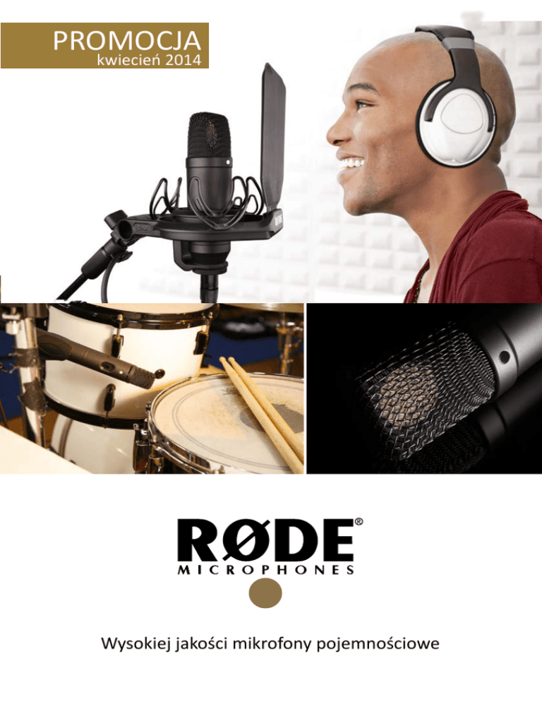 PROMOCJA kwiecień 2014 Wysokiej jakości mikrofony pojemnościowe Røde M3 Uniwersalny mikrofon pojemnościowy Pierwszy mikrofon z serii produktów zaprojektowanych dla szerokiego grona odbiorców. Gwarantuje bardzo wysoką jakość nagrania. Świetnie sprawdzi się zarówno podczas koncertów na żywo, jak też w studiu. Cena promocyjna 299,00 zł Standardowa cena 349,00 zł Røde M5 Pair Kompaktowe mikrofony pojemnościowe Niewielkie mikrofony pojemnościowe z ½ – calową kapsułą o charakterystyce kardioidalnej. Cechują się niskim poziomem szumów i świetnym przenoszeniem w pełnym paśmie. Doskonałe do rejestracji wszelkiego typu instrumentów akustycznych, chórów lub innych źródeł dźwięku. Mogą być stosowane pojedynczo lub w parze stereo. Cena promocyjna 649,00 zł Standardowa cena 799,00 zł Sugerowane ceny detaliczne brutto. Røde NT 1 Mikrofon pojemnościowy Charakter brzmienia nawiązuje do słynnych mikrofonów z przeszłości: detaliczny przekaz w paśmie środkowym, jedwabiste brzmienie tonów najwyższych oraz ciepły i okrągły bas. Wyposażony jest w membranę 1-calową, prezentujące jednocześnie ekstremalnie niski poziom szumu. Cena promocyjna 699,00 zł Standardowa cena 899,00 zł Røde NT 1 Kit Zestaw: mikrofon pojemnościowy NT I, uchwyt elastyczny SMR, metalowy pop-filtr [osłona przeciwpodmuchowa] Nowego typu uchwyt SMR posiada unikalny, podwójny system zawieszenia Lyre zapewniający jeszcze lepsze tłumienie drgań. Cena promocyjna 839,00 zł Standardowa cena 1099,00 zł Sugerowane ceny detaliczne brutto. Røde NT 1- A Kit Mikrofon pojemnościowy Najcichszy pojemnościowy mikrofon studyjny na świecie. Szumy własne tylko na poziomie 5 dBA. Mikrofon ten stał się standardowym wyposażeniem studiów nagrań dając ciepłe brzmienie, szeroki zakres dynamiki, klarowność oraz odporność na duże poziomy ciśnienia akustycznego. Cena promocyjna 739,00 zł Standardowa cena 849,00 zł Sugerowane ceny detaliczne brutto. Wszystkie produkty Røde biorą udział w Konkursie Audiostacja TOP TEN Zostań uczestnikiem Konkursu rejestrując się na: www.audiostacja.pl/konkurs Dystrybucja: Audiostacja s.c. ul. Główna 20A, 31-113 Warszawa, tel. 22 616 13 86, fax 22 616 13 94 Audiostacja. Źródło Twojego dźwięku Współpracujemy ze znanymi i cenionymi na świecie dostawcami rozwiązań do branży pro audio. Dostarczamy pełną gamę sprzętu dla profesjonalnych i domowych studiów nagrań, muzyków, instytucji i firm, teatrów, oper, radia i telewizji. W naszej ofercie znajduje się szereg zaawansowanych urządzeń, takich jak interfejsy i systemy audio, mikrofony studyjne, radiowe i estradowe, monitory studyjne, syntezatory, klawiatury MIDI, samplery, beat maszyny, gitary, procesory wokalowe, oprogramowanie oraz biblioteki sampli.