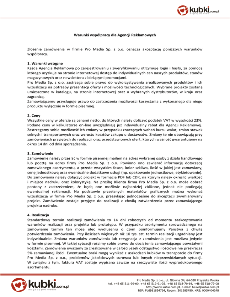 Warunki współpracy dla Agencji Reklamowych Złożenie zamówienia w firmie Pro Media Sp. z o.o. oznacza akceptację poniższych warunków współpracy. 1. Warunki wstępne Każda Agencja Reklamowa po zarejestrowaniu i zweryfikowaniu otrzymuje login i hasło, za pomocą którego uzyskuje na stronie internetowej dostęp do indywidualnych cen naszych produktów, stanów magazynowych oraz newslettera z bieżącymi promocjami. Pro Media Sp. z o.o. zastrzega sobie prawo do wykorzystywania zrealizowanych produktów i ich wizualizacji na potrzeby prezentacji oferty i możliwości technologicznych. Wybrane projekty zostaną umieszczone w katalogu, na stronie internetowej oraz u wybranych dystrybutorów, w kraju oraz zagranicą. Zamawiającemu przysługuje prawo do zastrzeżenia możliwości korzystania z wykonanego dla niego produktu wyłącznie w formie pisemnej. 2. Ceny Wszystkie ceny w ofercie są cenami netto, do których należy doliczyć podatek VAT w wysokości 23%. Podane ceny w kalkulatorze on-line uwzględniają już indywidualny rabat dla Agencji Reklamowej. Zastrzegamy sobie możliwość ich zmiany w przypadku znaczących wahań kursu walut, zmian stawek celnych i transportowych oraz wzrostu kosztów zakupu u dostawców. Zmiany te nie obowiązują przy zamówieniach przyjętych do realizacji oraz przedstawionych ofert, których ważność gwarantujemy na okres 14 dni od dnia sporządzenia. 3. Zamówienie Zamówienie należy przesłać w formie pisemnej mailem na adres wybranej osoby z działu handlowego lub pocztą na adres firmy Pro Media Sp. z o.o. Powinno ono zawierać informację dotyczącą zamawianego asortymentu, a przede wszystkim fason, kolor szkliwa, ilość w jakiej jest zamawiany, cenę jednostkową oraz ewentualne dodatkowe usługi (np. opakowanie jednostkowe, etykietowanie). Do zamówienia należy dołączyć projekt w formacie PDF lub CDR, na którym należy określić wielkość i miejsce nadruku oraz kolorystykę. Na prośbę Klienta firma Pro Media Sp. z o.o. może dobrać pantony z zastrzeżeniem, że będą one możliwie najbardziej zbliżone, jednak nie podlegają ewentualnej reklamacji. Na podstawie przesłanych materiałów graficznych można wykonać wizualizację w firmie Pro Media Sp. z o.o. przesyłając jednocześnie do akceptacji zwymiarowany projekt. Zamówienie zostaje przyjęte do realizacji z chwilą zatwierdzenia przez zamawiającego projektu nadruku. 4. Realizacja Standardowy termin realizacji zamówienia to 14 dni roboczych od momentu zaakceptowania warunków realizacji oraz projektu lub prototypu. W przypadku asortymentu sprowadzanego na zamówienie termin ten może ulec wydłużeniu o czym poinformujemy Państwa z chwilą potwierdzenia zamówienia. Przy ilościach większych niż 10 tys. szt. termin realizacji uzgadniany jest indywidualnie. Zmiana warunków zamówienia lub rezygnacja z zamówienia jest możliwa jedynie w formie pisemnej. W takiej sytuacji rościmy sobie prawo do obciążenia zamawiającego powstałymi kosztami. Zamówienie uważamy za zrealizowane w całości jeżeli odstępstwo ilościowe nie przekracza 5% zamawianej ilości. Ewentualne braki mogą wynikać z uszkodzeń kubków w transporcie do firmy Pro Media Sp. z o.o., problemów jakościowych surowca lub innych nieprzewidzianych sytuacji. W związku z tym, faktura VAT zostaje wypisana zawsze na rzeczywiste ilości wyprodukowanego asortymentu. 5. Dostawa Zamówiony towar klient odbiera bezpośrednio w siedzibie firmy Pro Media Sp. z o.o. lub za pośrednictwem firmy spedycyjnej. Termin odbioru powinien zostać uzgodniony z co najmniej 1 dniowym wyprzedzeniem. Transport towaru może również zostać zorganizowany przez firmę Pro Media Sp. z o.o. W takim przypadku koszty transportu oraz inne koszty związane z opóźnieniami lub odmową odbioru towaru ponosi zamawiający. Transport towaru organizowany przez firmę Pro Media Sp. z o.o. jest zawsze ubezpieczony do rzeczywistej wartości. Warunkiem uzyskania odszkodowania za uszkodzony towar jest sporządzenie w momencie odbierania dostawy protokołu uszkodzeń. 6. Warunki płatności Każda Agencja Reklamowa zaczynająca z nami współpracę ma możliwość zakupienia towaru na odroczony termin płatności. Warunkiem uzyskania takiej formy płatności jest zapłata za dwa pierwsze zamówienia z góry lub najpóźniej w dniu odbioru towaru. Na każde kolejne zamówienie Agencja Reklamowa otrzymuje 14 dniowy termin płatności i limit kupiecki do kwoty 25 tys zł / brutto. Jeżeli faktury z odroczonym terminem płatności będą regulowane z dużym opóźnieniem, wówczas kolejne dwa zamówienia ponownie płatne są najpóźniej w dniu odbioru towaru. Przekroczenie limitu 25 tys zł / brutto jest możliwe wyłącznie na drodze indywidualnych negocjacji. 7. Reklamacje Zamawiający zobowiązany jest do sprawdzenia pod względem ilościowym i jakościowym zamówionego towaru w dniu odbioru. W przypadku reklamacji zamawiający zobowiązany jest zgłosić ten fakt w formie pisemnej w terminie 3 dni od odebrania towaru pod rygorem utraty prawa dochodzenia roszczeń z tytułu wad lub braków ilościowych. Reklamacji podlega jedynie towar uszkodzony lub niezgodny z zamówieniem. Nie odpowiadamy za uszkodzenia wynikające z transportu firmą spedycyjną. Koszty dostarczenia reklamowanego towaru do firmy Pro Media Sp. z o.o. ponosi zamawiający. Reklamacją nie są objęte niewielkie odstępstwa kolorystyczne oraz minimalne różnice w rozmiarach produktów. Jest to związane z możliwością niewielkich odstępstw pomiędzy różnymi partiami porcelany, ograniczoną paletą farb ceramicznych, wysoką temperaturą wypalania oraz rodzajem i kolorem szkliwa, na którym wykonany jest nadruk. Reklamacje będą rozpatrywane w terminie 7 dni od momentu otrzymania reklamowanego towaru. Po uznaniu reklamacji towar zostanie wymieniony na wolny od wad w najkrótszym możliwym terminie. Firma Pro Media Sp. z o.o. ponosi odpowiedzialność wyłącznie
