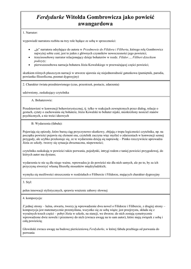 Ferdydurke Witolda Gombrowicza jako powieść awangardowa 1. Narrator: wypowiedź narratora rozbita na trzy role będące ze sobą w sprzeczności: „ja” narratora odsyłające do autora w Przedmowie do Filidora i Filiberta, którego rolę Gombrowicz najwyżej sobie ceni; jest to jeden z głównych czynników nowoczesności jego powieści; trzecioosobowy narrator relacjonujący dzieje bohaterów w rozdz. Filidor…, Filibert dzieckiem podszyty; pierwszoosobowa narracja bohatera Józia Kowalskiego w przeważającej części powieści; skutkiem różnych płaszczyzn narracji w utworze ujawnia się niejednorodność gatunkowa (pamiętnik, parodia, powiastka filozoficzna, poemat dygresyjny) 2. Charakter świata przedstawionego (czas, przestrzeń, postacie, zdarzenia) udziwniony, zaskakujący czytelnika A. Bohaterowie: Przedstawieni w konwencji behawiorystycznej, tj. tylko w reakcjach zewnętrznych przez dialog, relacje o gestach, cytaty o zachowaniu się bohatera; Józio Kowalski to bohater nijaki, nieokreślony nosiciel stanów psychicznych, a nie treści ideowych B. Wydarzenia (fabuła): Pojawiają się epizody, które burzą ciąg przyczynowo-skutkowy, zbijają z tropu logiczności czytelnika, np. na początku powieści pojawia się element snu, czytelnik zaczyna więc myśleć o zdarzeniach w konwencji sennej przygody, ale szybko przekonuje się, ze te wydarzenia dzieją się naprawdę – Pimko rzeczywiście uprowadza Józia ze szkoły. tworzy się sytuacja dwuznaczna, niepewności; czytelnika zaskakują w powieści także porwania, pojedynki, intrygi rodem z taniej powieści przygodowej, do których autor ma dystans; wydarzenia te nie są dla niego ważne, wprowadza je do powieści nie dla nich samych, ale po to, by za ich przyczyną stworzyć własną filozofię stosunków międzyludzkich; wymyka się możliwości streszczenia w rozdziałach o Filibercie i Filidorze, mających charakter dygresyjny 3. Styl: pełen innowacji stylistycznych, sprawia wrażenie zabawy słownej 4. kompozycja: Z jednej strony – luźna, otwarta, tworzy ją wprowadzenie dwu nowel o Filidorze i Filibercie, z drugiej strony – kompozycja jest matematycznie przemyślana, wszystko się ze sobą wiąże; jest przejrzysta, składa się z wyraźnych trzech części – pobyt Józia w szkole, na stancji, we dworze; do nich zostają symetrycznie wprowadzone dwie nowele i przemowy do nich (zwraca uwagę na to sam autor), które mają związek z sobą i całą powieścią; Głowiński zwraca uwagę na budowę pierścieniową Ferdydurke, w której fabuła przebiega od porwania do porwania