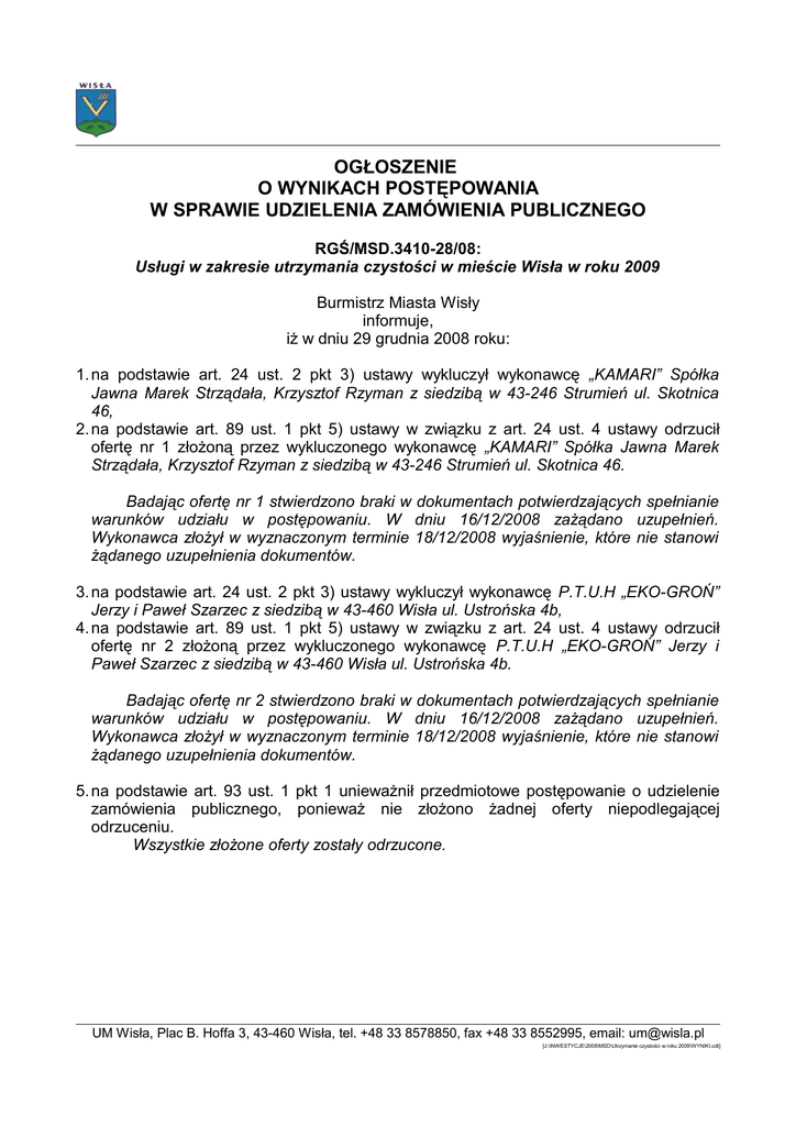 OGŁOSZENIE O WYNIKACH POSTĘPOWANIA W SPRAWIE UDZIELENIA ZAMÓWIENIA PUBLICZNEGO RGŚ/MSD.3410-28/08: Usługi w zakresie utrzymania czystości w mieście Wisła w roku 2009 Burmistrz Miasta Wisły informuje, iż w dniu 29 grudnia 2008 roku: 1. na podstawie art. 24 ust. 2 pkt 3) ustawy wykluczył wykonawcę „KAMARI” Spółka Jawna Marek Strządała, Krzysztof Rzyman z siedzibą w 43-246 Strumień ul. Skotnica 46, 2. na podstawie art. 89 ust. 1 pkt 5) ustawy w związku z art. 24 ust. 4 ustawy odrzucił ofertę nr 1 złożoną przez wykluczonego wykonawcę „KAMARI” Spółka Jawna Marek Strządała, Krzysztof Rzyman z siedzibą w 43-246 Strumień ul. Skotnica 46. Badając ofertę nr 1 stwierdzono braki w dokumentach potwierdzających spełnianie warunków udziału w postępowaniu. W dniu 16/12/2008 zażądano uzupełnień. Wykonawca złożył w wyznaczonym terminie 18/12/2008 wyjaśnienie, które nie stanowi żądanego uzupełnienia dokumentów. 3. na podstawie art. 24 ust. 2 pkt 3) ustawy wykluczył wykonawcę P.T.U.H „EKO-GROŃ” Jerzy i Paweł Szarzec z siedzibą w 43-460 Wisła ul. Ustrońska 4b, 4. na podstawie art. 89 ust. 1 pkt 5) ustawy w związku z art. 24 ust. 4 ustawy odrzucił ofertę nr 2 złożoną przez wykluczonego wykonawcę P.T.U.H „EKO-GROŃ” Jerzy i Paweł Szarzec z siedzibą w 43-460 Wisła ul. Ustrońska 4b. Badając ofertę nr 2 stwierdzono braki w dokumentach potwierdzających spełnianie warunków udziału w postępowaniu. W dniu 16/12/2008 zażądano uzupełnień. Wykonawca złożył w wyznaczonym terminie 18/12/2008 wyjaśnienie, które nie stanowi żądanego uzupełnienia dokumentów. 5. na podstawie art. 93 ust. 1 pkt 1 unieważnił przedmiotowe postępowanie o udzielenie zamówienia publicznego, ponieważ nie złożono żadnej oferty niepodlegającej odrzuceniu. Wszystkie złożone oferty zostały odrzucone. UM Wisła, Plac B. Hoffa 3, 43-460 Wisła, tel. +48 33 8578850, fax +48 33 8552995, email: [email protected] [J:\INWESTYCJE\2008\MSD\Utrzymanie czystości w roku 2009\WYNIKI.odt]