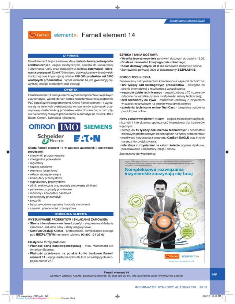 farnell.automatykab2b.pl Farnell element 14 Zapraszamy do współpracy! Bogata oferta Farnell element14 obejmująca produkty od komputerów przemysłowych do zabezpieczeń maszyn zapewnia realizację wszystkich Państwa projektów w dziedzinie sterowania procesami i automatyki. LI S CJA TYCZ N PE H YC S Kompleksowe rozwiązania inżynierskie zaczynają się tutaj Ó C Y W BR AW A PRODUK T ST NŻ Y P O MO C TE Oferta Farnell element 14 w zakresie automatyki i sterowania procesami: sterowniki programowalne inteligentne przekaźniki regulatory liczniki panelowe elementy łączeniowe układy zabezpieczające komputery przemysłowe sygnalizatory przemysłowe silniki elektryczne oraz moduły sterowania silnikami panelowe przyrządy pomiarowe monitory i komputery panelowe podzespoły pneumatyki styczniki bezprzewodowe systemy i moduły sterowania czujniki i przetworniki przemysłowe Nowy portal www.element14.com – bogate źródło informacji technicznych i interaktywna społeczność internetowa dla inżynierów w jednym: dostęp do 15 tysięcy dokumentów technicznych i schematów blokowych pochodzących od wiodących na rynku producentów; możliwość korzystania z programu CadSoft EAGLE oraz innych narzędzi do projektowania; interakcja z inżynierami na całym świecie poprzez dyskusje, pozostawianie komentarzy, zdjęć i filmów. 0 Farnell element 14 oferuje szeroki wybór komponentów związanych z automatyką, wśród których licznie reprezentowane są sterowniki PLC i przekaźniki programowalne. Oferta Farnell element 14 wyróżnia się na tle innych dystrybutorów komponentów automatyki przemysłowej dostępnością produktów wielu dostawców, w tym pięciu najbardziej znanych producentów automatyki na świecie: IMO, Eaton, Omron, Schneider i Siemens. 5 00 OFERTA POMOC TECHNICZNA Zapewniamy naszym klientom kompleksowe wsparcie techniczne: 420 tysięcy kart katalogowych producentów – dostępne na stronie internetowej z możliwością wyszukiwania; wsparcie działu technicznego – zespół złożony z 70 inżynierów odpowie na wszelkie pytania i wątpliwości natury technicznej; czat techniczny na żywo – możliwość rozmowy z inżynierami w czasie rzeczywistym na stronie www.farnell.com/pl; szkolenia techniczne online TechCast – bezpłatne szkolenia produktowe online. O D Ą CY D O WI Farnell element 14 jest światowej klasy dystrybutorem podzespołów elektronicznych, części elektrycznych, sprzętu do konserwacji i utrzymania ruchu oraz produktów z zakresu automatyki i sterowania procesami. Dzięki 70-letniemu doświadczeniu w branży elektronicznej oraz imponującej ofercie 450 000 produktów od 3500 wiodących producentów, Farnell element 14 jest gwarancją najwyższej jakości produktów oraz obsługi. SZYBKA I TANIA DOSTAWA Wysyłka tego samego dnia zamówień złożonych do godziny 16.00; Dostawa zamówień kolejnego dnia roboczego; Koszt dostawy jedyne 20 zł dla zamówień złożonych online; Zamówienia powyżej 2000 zł dostarczamy BEZPŁATNIE! W O FIRMIE CH DOSTAWA PÓ ŁP R START WS B RO O C Z E GO Elastyczne formy płatności: Płatność kartą bankową/kredytową – Visa, Mastercard lub American Express; Płatność przelewem na polskie konto bankowe Farnell element 14 – opcja dostępna tylko dla firm posiadających europejski numer VAT. N A A C A ON LI NE NE GO D TĘP NI AS WYSZUKIWANIE PRODUKTÓW I SKŁADANIE ZAMÓWIEŃ: Strona internetowa www.farnell.com/pl – ekspresowe składanie zamówień, aktualne ceny i stany magazynowe; Centrum Obsługi Klienta – profesjonalna, kompleksowa obsługa pod BEZPŁATNYM numerem telefonu 00 800 121 29 67. NICZNA OBSŁUGA KLIENTA farnell.com/farnellelement14 Farnell element 14 Centrum Obsługi Klienta, bezpłatna infolinia: 00 800 121 29 67, [email protected], www.farnell.com/pl I N F O R M AT O R R Y N KO W Y AU T O M AT Y K I 121_prezentacje_2013.indd 149 Process CyanProcess MagentaProcess YellowProcess Black 149 2013 8/31/12 12:59 AM
