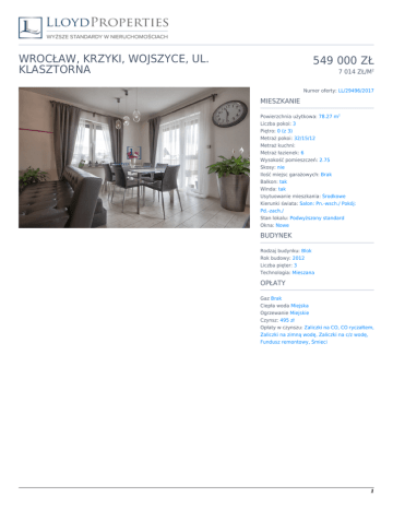 WROCŁAW, KRZYKI, WOJSZYCE, UL. KLASZTORNA 549 000 ZŁ 7 014 ZŁ/M2 Numer oferty: LL/29496/2017 MIESZKANIE Powierzchnia użytkowa: 78.27 m2 Liczba pokoi: 3 Piętro: 0 (z 3) Metraż pokoi: 32/15/12 Metraż kuchni: Metraż łazienek: 6 Wysokość pomieszczeń: 2.75 Skosy: nie Ilość miejsc garażowych: Brak Balkon: tak Winda: tak Usytuowanie mieszkania: Środkowe Kierunki świata: Salon: Pn.-wsch./ Pokój: Pd.-zach./ Stan lokalu: Podwyższony standard Okna: Nowe BUDYNEK Rodzaj budynku: Blok Rok budowy: 2012 Liczba pięter: 3 Technologia: Mieszana OPŁATY Gaz Brak Ciepła woda Miejska Ogrzewanie Miejskie Czynsz: 495 zł Opłaty w czynszu: Zaliczki na CO, CO ryczałtem, Zaliczki na zimną wodę, Zaliczki na c/z wodę, Fundusz remontowy, Śmieci 1 Michał Stanisz Junior Property Advisor +48 533 340 502 [email protected] OPIS Nowoczesne, wykończone ze smakiem 3-pokojowe mieszkanie o powierzchni użytkowej 78 m2. Prezentowane mieszkanie ma funkcjonalny układ, zlokalizowane jest na wysokim parterze 3-kondygnacyjnego budynku z 2012 r. na południu Wrocławia, w dzielnicy Wojszyce. Składa się z: - pokoju dziennego połączonego z aneksem kuchennym ( 32m2), - głównej sypialni (15 m2), - sypialni/pokoju dziecka (12m2), - łazienki (6m2), - przestronnego przedpokoju (13m2) z zabudowaną garderobą (ok 3m2), Do mieszkania należy duży taras wielkości 40m2. Mieszkanie dobrze doświetlone, słoneczne, salon z aneksem kuchennym mają południowo zachodnią ekspozycję. Mieszkanie narożne, z oknami wychodzącymi na osiedlową uliczkę. Wykończone z dbałością o każdy detal, spójna stylistyka całego wnętrza, stonowana kolorystyka. Kuchnia w pełni umeblowana, wykonana na wymiar, zastosowano w niej wysokiej klasy sprzęt AGD do zabudowy marki Siemens oraz Bosh, szafki wyposażone w osprzęt Blum, system Cargo w szafach. Na podłodze gres imitujący deskę podłogową. Podświetlane szafki kuchenne. Podłogi w pokojach wyłożone wysokiej klasy panelami o najwyższej klasie ścieralności. Na ścianach gładzie. Możliwość sterowania oświetleniem we wnętrzach - liczne halogeny w sufitach podwieszanych jak również stylowe oprawy oświetleniowe. Drzwi wewnętrzne Porta z mleczną szybą. W sypialni duża szafa/garderoba w zabudowie. W oknach zamontowano zewnętrzne rolety antywłamaniowe. Do lokalu przynależy miejsce parkingowe w garażu podziemnym w cenie 20 000 zł oraz komórka lokatorska (ok 6m2) w cenie 15 000 zł nierozłącznie związane z zakupem mieszkania. Mieszkanie nadaje się do wprowadzenia. Polecam, idealne dla pary lub rodziny. Na osiedlu monitoring. Budynek przystosowany dla osób niepełnosprawnych. Do bloku mieszkalnego przynależy: plac zabaw, parking zawnętrzny oraz wózkarnia. Liczne punkty usługowe: apteka, bankomat, sklepy, restauracja, salon kosmetyczny, gabinety lekarskie. Budynek z 2012 roku, 3-kondygnacyjny. Brama z domofonem. Wokół zagospodarowana zieleń. 2