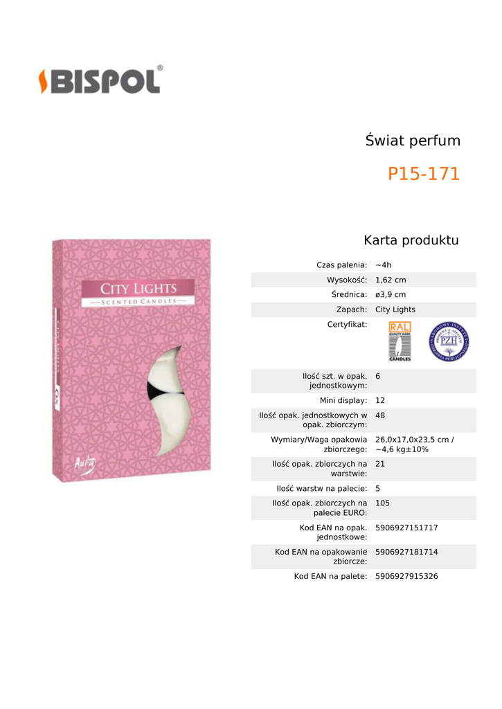 Świat perfum P15-171 Karta produktu Czas palenia: ~4h Wysokość: 1,62 cm Średnica: ø3,9 cm Zapach: City Lights Certyfikat: Ilość szt. w opak. jednostkowym: Mini display: 12 Ilość opak. jednostkowych w opak. zbiorczym: 48 Wymiary/Waga opakowia zbiorczego: 26,0x17,0x23,5 cm / ~4,6 kg±10% Ilość opak. zbiorczych na warstwie: 21 Ilość warstw na palecie: Ilość opak. zbiorczych na palecie EURO: Powered by TCPDF (www.tcpdf.org) 6 5 105 Kod EAN na opak. jednostkowe: 5906927151717 Kod EAN na opakowanie zbiorcze: 5906927181714 Kod EAN na palete: 5906927915326