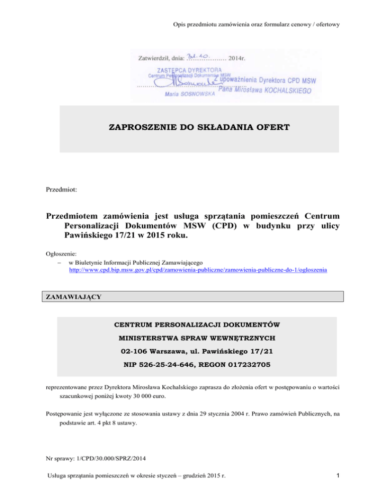 Opis przedmiotu zamówienia oraz formularz cenowy / ofertowy Zatwierdził, dnia: …………….… 2014r. ………………………………….…………….. ZAPROSZENIE DO SKŁADANIA OFERT Przedmiot: Przedmiotem zamówienia jest usługa sprzątania pomieszczeń Centrum Personalizacji Dokumentów MSW (CPD) w budynku przy ulicy Pawińskiego 17/21 w 2015 roku. Ogłoszenie: − w Biuletynie Informacji Publicznej Zamawiającego http://www.cpd.bip.msw.gov.pl/cpd/zamowienia-publiczne/zamowienia-publiczne-do-1/ogloszenia ZAMAWIAJĄCY CENTRUM PERSONALIZACJI DOKUMENTÓW MINISTERSTWA SPRAW WEWNĘTRZNYCH 02-106 Warszawa, ul. Pawińskiego 17/21 NIP 526-25-24-646, REGON 017232705 reprezentowane przez Dyrektora Mirosława Kochalskiego zaprasza do złożenia ofert w postępowaniu o wartości szacunkowej poniżej kwoty 30 000 euro. Postępowanie jest wyłączone ze stosowania ustawy z dnia 29 stycznia 2004 r. Prawo zamówień Publicznych, na podstawie art. 4 pkt 8 ustawy. Nr sprawy: 1/CPD/30.000/SPRZ/2014 Usługa sprzątania pomieszczeń w okresie styczeń – grudzień 2015 r. 1 Opis przedmiotu zamówienia oraz formularz cenowy / ofertowy I. OPIS PRZEDMIOTU ZAMÓWIENIA Przedmiotem zamówienia jest usługa sprzątania pomieszczeń Centrum Personalizacji Dokumentów MSW (CPD) w budynku przy ulicy Pawińskiego 17/21. Wymagania: 1. Powierzchnia pomieszczeń do sprzątania: 1) powierzchnia biurowa 2) powierzchnia produkcji 3) powierzchnia stołówki 4) powierzchnia toalet 5) powierzchnia korytarzy 6) powierzchnia magazynów 7) powierzchnia szatni 8) powierzchnia techniczna Całkowita powierzchnia pomieszczeń CPD do sprzątania 2. - 1 290,98 m² - 576,27 m² 23,00 m² 86,98 m² - 189,77 m² - 309,44 m² 61,60 m² 44,36 m² - 2 581,98 m² Zakres oraz sposób wykonywania prac porządkowych: 1) w pomieszczeniach biurowych należy wykonać następujące prace: a) 5 razy w tygodniu: − mycie zbiorniczka spływowego kratki w urządzeniach grzewczo - chłodzących wody, (jeżeli jest w pomieszczeniu), − odkurzanie chodników i wykładzin dywanowych odkurzaczami z filtrem wodnym, − wycieranie kurzu z mebli i polerowanie blatów biurek, parapetów i sprzętu biurowego (z wyłączeniem sprzętu komputerowego), − opróżnienie i mycie koszy na śmieci, wymiana i wyniesienie zawartości plastikowych worków, − opróżnianie i wyniesienie zawartości z pojemników niszczarek, b) 2 razy w tygodniu, wycieranie kurzu z regałów, nadstawek i szaf, c) 1 raz w tygodniu: − dokładne czyszczenie mebli i pokrycie ich odpowiednim preparatem do konserwacji mebli, − czyszczenie aparatów telefonicznych, − mycie drzwi wejściowych, d) 1 raz w miesiącu: − usuwanie kurzu z lamp, obrazów, elementów dekoracyjnych, symboli, − odkurzanie mebli tapicerowanych (krzeseł, foteli); 2) w toaletach należy wykonać następujące czynności: a) 5 razy w tygodniu: − uzupełnienie zawartości pojemników na mydło, − uzupełnienie papieru toaletowego w pojemnikach, − uzupełnienie środków zapachowo-dezynfekujących umieszczonych w WC, posiadających atest PZH, o przyjemnym zapachu, preferowane krążki, paski żelowe umieszczane w muszli, kostki toaletowe umieszczane w spłuczce toaletowej, − opróżnienie i mycie koszy na śmieci, wymiana i wyniesienie zawartości plastikowych worków, − mycie i odkażanie urządzeń sanitarnych i armatury, − mycie parapetów, pulpitów, luster i innych elementów toalet, mycie podłóg, b) 1 raz w tygodniu: − mycie glazury, c) na bieżąco: − usuwanie niedrożności w urządzeniach sanitarnych, − usuwanie plam ze ścian, ścianek działowych i drzwi; 3) w pomieszczeniach magazynowych, należy wykonać następujące prace: a) 5 razy w tygodniu: − wycieranie powierzchni stołów, szaf, − opróżnienie i mycie koszy na śmieci, wymiana i wyniesienie zawartości plastikowych worków, b) 1 raz w tygodniu: − mycie podłóg, zgodnie z potrzebami, − mycie okien od wewnątrz; 4) w hali produkcyjnej należy wykonać następujące prace: a) 5 razy w tygodniu, codziennie rano przed przyjściem pracowników tj. o godz. 5.00 oraz po zakończeniu ich pracy tj. o godz. 15.00 mycie podłóg (metodą półsuchą), Usługa sprzątania pomieszczeń w okresie styczeń – grudzień 2015 r. 2 Opis przedmiotu zamówienia oraz formularz cenowy / ofertowy 5) 6) 7) 8) b) 1 raz w tygodniu: − ręczne odkurzanie szafek laserowych i usuwanie zanieczyszczeń pomiędzy stołem grawerki a szafką laserową, − odkurzanie górnych powierzchni szaf i sprzętu w serwerowi, − ręcznie oraz przy pomocy odkurzacza z filtrem wodnym oraz okrągłą ssawką szczotkową precyzyjne czyszczenie dostępnych powierzchni blatów i szaf, urządzeń i maszyn specjalistycznych, powierzchni biurek i stołów stanowisk kierowniczych i dyspozytorów, powierzchni stołów stanowisk kontroli OCR i stanowisk personalizacji elektronicznej dokumentów, powierzchni szaf metalowych, − opróżnienie i mycie koszy na śmieci, wymiana i wyniesienie zawartości plastikowych worków, c) 1 raz w miesiącu, w uzgodnionym terminie, odkurzanie podłogi przy wylotach kratek nawiewnych; w pomieszczeniu stołówki należy wykonać następujące prace: b) 5 razy w tygodniu: − uzupełnienie zawartości pojemników na ręczniki papierowe (typu MERIDA), − opróżnienie i mycie koszy na śmieci, wymiana i wyniesienie zawartości plastikowych worków, − uzupełnianie płynu do zmywania naczyń, − mycie podłogi (metodą półsuchą), − wycieranie powierzchni parapetów, lodówki, szafek, − mycie kuchni gazowo-elektrycznej, urządzeń sanitarnych i armatury, c) 1 raz w tygodniu: − opróżnianie i mycie pojemnika PW-26 z klapą do segregacji odpadów (papier / plastik / szkło), wymiana i wyniesienie zawartości plastikowych worków, d) na bieżąco – wycieranie powierzchni stołów, e) 1 raz w miesiącu, mycie wnętrza lodówki, po wcześniejszym uzgodnieniu terminu; na korytarzach i w szatniach należy codzie