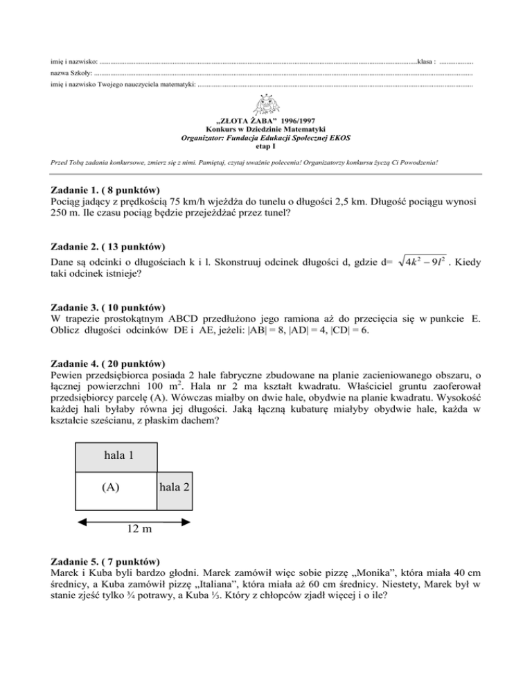 imię i nazwisko: ..................................................................................................................................................................................klasa : ................... nazwa Szkoły: .................................................................................................................................................................................................................... imię i nazwisko Twojego nauczyciela matematyki: .......................................................................................................................................................... „ZŁOTA ŻABA” 1996/1997 Konkurs w Dziedzinie Matematyki Organizator: Fundacja Edukacji Społecznej EKOS etap I Przed Tobą zadania konkursowe, zmierz się z nimi. Pamiętaj, czytaj uważnie polecenia! Organizatorzy konkursu życzą Ci Powodzenia! Zadanie 1. ( 8 punktów) Pociąg jadący z prędkością 75 km/h wjeżdża do tunelu o długości 2,5 km. Długość pociągu wynosi 250 m. Ile czasu pociąg będzie przejeżdżać przez tunel? Zadanie 2. ( 13 punktów) Dane są odcinki o długościach k i l. Skonstruuj odcinek długości d, gdzie d= taki odcinek istnieje? 4 k 2 9 l 2 . Kiedy Zadanie 3. ( 10 punktów) W trapezie prostokątnym ABCD przedłużono jego ramiona aż do przecięcia się w punkcie E. Oblicz długości odcinków DE i AE, jeżeli: |AB| = 8, |AD| = 4, |CD| = 6. Zadanie 4. ( 20 punktów) Pewien przedsiębiorca posiada 2 hale fabryczne zbudowane na planie zacieniowanego obszaru, o łącznej powierzchni 100 m2. Hala nr 2 ma kształt kwadratu. Właściciel gruntu zaoferował przedsiębiorcy parcelę (A). Wówczas miałby on dwie hale, obydwie na planie kwadratu. Wysokość każdej hali byłaby równa jej długości. Jaką łączną kubaturę miałyby obydwie hale, każda w kształcie sześcianu, z płaskim dachem? hala 1 (A) hala 2 12 m Zadanie 5. ( 7 punktów) Marek i Kuba byli bardzo głodni. Marek zamówił więc sobie pizzę „Monika”, która miała 40 cm średnicy, a Kuba zamówił pizzę „Italiana”, która miała aż 60 cm średnicy. Niestety, Marek był w stanie zjeść tylko ¾ potrawy, a Kuba ⅓. Który z chłopców zjadł więcej i o ile? Zadanie 6. ( 10 punktów) 5 jest liczbą niewymierną. Jej przedstawienie w postaci ułamka dziesiętnego jest nieskończone i nieokresowe. Z dokładnością do sześciu miejsc po przecinku jest ono równe 2,236068. Znajdź 3 przybliżoną wartość bez kalkulatora (z dokładnością do trzech miejsc po przecinku). 5 Zadanie 7. ( 13 punktów) Dana jest prosta l i punkt M nie należący do niej. Uzupełnij rysunek jednym punktem P w ten sposób, aby figura złożona z prostej i dwóch punktów miała środek symetrii. Jaką figurę tworzą wszystkie punkty P spełniające dany warunek? Odpowiedź uzasadnij. Zadanie 8. ( 8 punktów) Dla jakich wartości x i y punkty: A = (2x-3y+1; y-x+3) i A1 = (4y-5x+2; 2x-y) są symetryczne względem osi OY? Zadanie 9. ( 11 punktów) Na poniższym rysunku proste a, b są równoległe, natomiast prosta d zawiera dwusieczną kąta utworzonego przez proste c, b. Wiadomo, że prosta a tworzy z prostą c kąt o mierze 50. Jaką miarę ma kąt x? Odpowiedź uzasadnij.