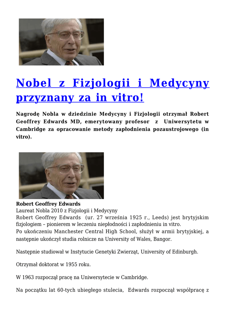 Nobel z Fizjologii i Medycyny przyznany za in vitro! Nagrodę Nobla w dziedzinie Medycyny i Fizjologii otrzymał Robert Geoffrey Edwards MD, emerytowany profesor z Uniwersytetu w Cambridge za opracowanie metody zapłodnienia pozaustrojowego (in vitro). Robert Geoffrey Edwards Laureat Nobla 2010 z Fizjologii i Medycyny Robert Geoffrey Edwards (ur. 27 września 1925 r., Leeds) jest brytyjskim fizjologiem – pionierem w leczeniu niepłodności i zapłodnieniu in vitro. Po ukończeniu Manchester Central High School, służył w armii brytyjskiej, a następnie ukończył studia rolnicze na University of Wales, Bangor. Następnie studiował w Instytucie Genetyki Zwierząt, University of Edinburgh. Otrzymał doktorat w 1955 roku. W 1963 rozpoczął pracę na Uniwersytecie w Cambridge. Na początku lat 60-tych ubiegłego stulecia, Edwards rozpoczął współpracę z Patrickiem Steptoe, chirurgiem ginekologicznym z Oldham nad projektem zapłodnienia pozaustrojowego u człowieka. W wyniku tego projektu 25 lipca 1978 w Oldham General Hospital urodziło się pierwsze „dziecko z probówki” . W roku 2007, Edwards zajął 26-te miejsce na liście The Daily Telegraph „100 największych żyjących obecnie geniuszy”. W dniu 4 października 2010, Edwards otrzymał Nagrodę Nobla w dziedzinie Fizjologii i Medycyny za wkład w rozwój metody zodnienia in vitro. Uzasadnienie możecie przeczytać tutaj. Robert Geoffrey Edwards oprócz pamiątkowego medalu, otrzyma 10 mln szwedzkich koron (1,49 mln dolarów). Fundacja Nobla, która przyznaje Nagrody powstała 110 lat temu. W 1901 r., cztery lata po śmierci Nobla, wręczono po raz pierwszy nagrody jego imienia. Zgodnie z tradycją są one wręczane laureatom w kolejne rocznice śmierci fundatora – 10 grudnia, a ogłaszane około dwa miesiące wcześniej. Data publikacji: 04.10.2010r.
