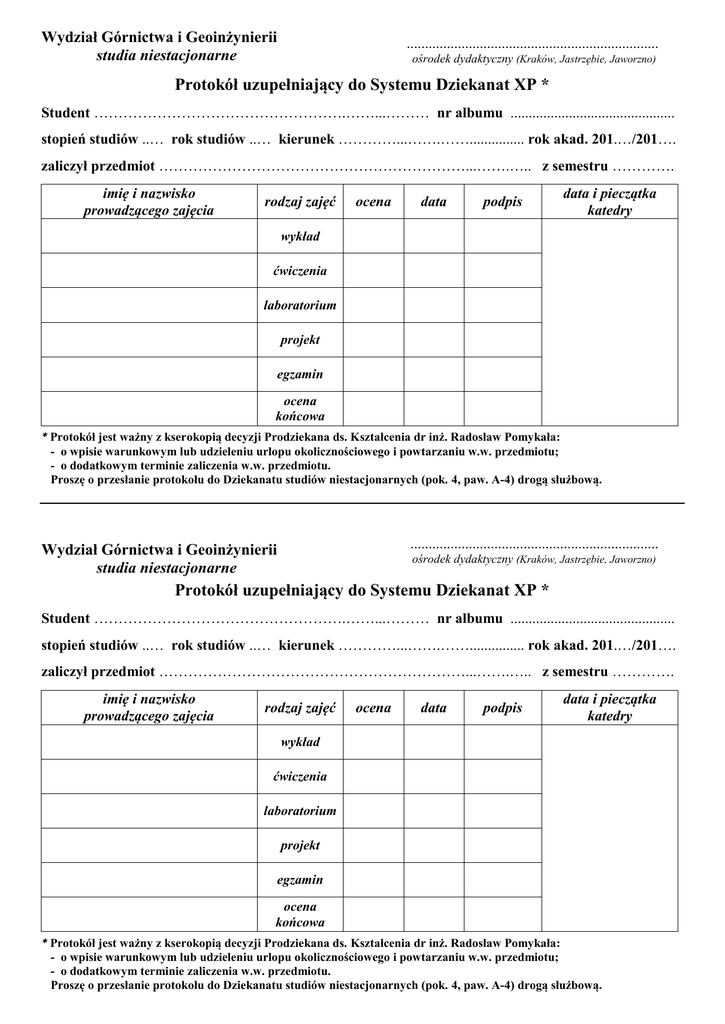 Wydział Górnictwa i Geoinżynierii studia niestacjonarne ..................................................................... ośrodek dydaktyczny (Kraków, Jastrzębie, Jaworzno) Protokół uzupełniający do Systemu Dziekanat XP * Student …………………………………………….……...……… nr albumu ............................................. stopień studiów ..… rok studiów ..… kierunek …………...…….……............... rok akad. 201.…/201…. zaliczył przedmiot ………………………………………………………...…….….. z semestru …………. imię i nazwisko prowadzącego zajęcia rodzaj zajęć ocena data podpis data i pieczątka katedry wykład ćwiczenia laboratorium projekt egzamin ocena końcowa * Protokół jest ważny z kserokopią decyzji Prodziekana ds. Kształcenia dr inż. Radosław Pomykała: - o wpisie warunkowym lub udzieleniu urlopu okolicznościowego i powtarzaniu w.w. przedmiotu; - o dodatkowym terminie zaliczenia w.w. przedmiotu. Proszę o przesłanie protokołu do Dziekanatu studiów niestacjonarnych (pok. 4, paw. A-4) drogą służbową. .................................................................... Wydział Górnictwa i Geoinżynierii studia niestacjonarne ośrodek dydaktyczny (Kraków, Jastrzębie, Jaworzno) Protokół uzupełniający do Systemu Dziekanat XP * Student …………………………………………….……...……… nr albumu ............................................. stopień studiów ..… rok studiów ..… kierunek …………...…….……............... rok akad. 201.…/201…. zaliczył przedmiot ………………………………………………………...…….….. z semestru …………. imię i nazwisko prowadzącego zajęcia rodzaj zajęć ocena data podpis data i pieczątka katedry wykład ćwiczenia laboratorium projekt egzamin ocena końcowa * Protokół jest ważny z kserokopią decyzji Prodziekana ds. Kształcenia dr inż. Radosław Pomykała: - o wpisie warunkowym lub udzieleniu urlopu okolicznościowego i powtarzaniu w.w. przedmiotu; - o dodatkowym terminie zaliczenia w.w. przedmiotu. Proszę o przesłanie protokołu do Dziekanatu studiów niestacjonarnych (pok. 4, paw. A-4) drogą służbową.