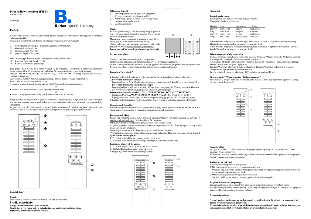 + + Trzy grupy (A, B, C) , po 8 kanałów każdy do włączania, ściemniania i sterowania żaluzjami. Oznacza to możliwość sterowania indywidualnie 24 kanałami zdalnie, poprzez falę radiowe. Przyciski WŁĄCZ WSZYSTKO lub WYŁĄCZ WSZYSTKO mogą włączać lub wyłączać całkowite obciążenie. Pilot radiowy komfort pozwala na zapamiętanie I przywołanie do 5 scen świetlnych . Scena świetlna posiada następujące cechy: • ustawia poziom ściemnienia oświetlenia (do 70 % oświetlenia maksymalnego), lub • ustawia stan załączenia obciążania (np załączona oprawa) lub • ustawia pozycję otwarcia żaluzji (np. Żaluzja spuszczona do końca) Sceny świetlne są zachowane w pamięci odbiornika. Zachowywanie i wywoływanie scen świetlnych jest możliwe poprzez zastosowanie pilota ręcznego, nadajnika radiowego na ścianie, po odpowiednim „nauczeniu”. Za pomocą przycisku “ściemnianie grupowe” pilota radiowego można zwiększać lub zmniejszać natężenie światła scen świetlnych lub sterować natężeniem wszystkich opraw jednocześnie. oświetlenie załacz zał/jaśn wyłącz wyłacz/ciem. żaluzja ruch.listw. całk.odsł ruch.listw. całk.zasł. Gdy odbiornik załączając wzmacniacz jest załączony na stałe przez 2 godziny, zaprogramowany klawisz kanałowy /\ musi być naduszony co najmniej 1 sek. Gdy odbiornik załączając wzmacniacz nie przyjmuje transmisji telegramów z nadajnika , klawisz kanału \/ musi być naduszony co najmniej 1 sek. Aby było możliwe rozumienie przez telegramów emitowanych z nadajnika odbiornik musi nauczyć się tych radiotelegramów. Liczba kanałów odbiornika, która może być przypisana do nadajnika jest praktycznie nieograniczona. Uczenie powoduje, że informacje zostają zachowane w pamięci odbiornika. Procedura “uczenia się” 1. Przełącz odbiornik k radiowy w tryb „uczenia” (spójrz w instrukcję działania odbiornika). 2. Procedura uczenia dla kanału: Przyciśnij klawisz /\ / \/ r dla programowanego kanału (grupa C, kanał 6) przez co najmniej 1 s. Procedura uczenia dla klawisza scenowego: Przyciśnij odpowiedni klawisz scenowy (np. 1) na co najmniej 3 s. Zaprogramowanie klawisza jest potwierdzane przez mrugającą diodę LED, w wybranej grupie . Procedura uczenia dla klawiszy „ZAŁĄCZ WSZYSTKO I WYŁĄCZ WSZYSTKO”: Przyciśnij ZAŁĄCZ WSZYSTKO lub WYŁĄCZ WSZYSTKO nie krócej niż 10 s. Zaprogramowanie klawisza jest potwierdzane przez mrugającą diodę LED w wybranej grupie . 3. Przełącz odbiornik radiowy w tryb normalnej pracy (spójrz w instrukcję działania odbiornika). Włącz wszystko / Wyłącz wszystko Podczas programowania kanału radiowego klawisze Wszystko Włącz I Wszystko Wyłącz są „uczone” automatycznie. (wyjątek: radiowy sterownik żaluzjowy). Aby uniknąć błędnych operacji naciśnij właściwy klawisz na co najmniej 1 sek. , aktywując funkcje Wszystko włączone/ wszystko wyłączone. Przycisk Wszystko włączone załącza obciążenie Przycisk Wszystko wyłączone wyłącza obciążenie w zaprogramowanych odbiornikach. W celu potwierdzenia wszystkie grupy LED zapalają się na około 12 sek. Wymazywanie " Włącz wszystko / Wyłącz wszystko ” Jeśli funkcja ta nie jest określona w odbiorniku to funkcja ta musi być wymazana z pamięci (czytaj “wymazywanie kanałów”). Wymazywanie kanałów Ponowne programowanie kanałów, scen świetlnych, przycisków grupowych WŁĄCZ/WYŁACZ dla pilota radiowego powoduje wymazanie z pamięci zapisanych informacji. A B 1 C A B 1 2 2 3 3 4 4 5 6 5 6 7 Przypisywanie Grup Kanały są podzielone na 3(A, B, C) grupy dla lepszej czytelności (np. pomieszczenie A, B, C) po 8 możliwych kanałów każdy (3x 8 kanałów = 24 kanałów). Jedna grupa może być załączana 8 przyciskami w tym samym czasie. Aktywna grupa jest sygnalizowana poprzez krótkie migotanie diod LED (n.p.grupa A), kiedy żadny z klawiszy nie jest włączony. Grupa A jest automatycznie aktywowana po włożeniu baterii do pilota. Przełączenie do następnej grupy odbywa się poprzez naduszenie klawisza grupowego , np grupa B. Tymczasowa zmiana grupy 1. Przyciśnij krótko klawisz grupowy (krócej niż 4 sek.). 2. Przyciśnij krótko klawisz określonego kanału przez czas krótszy niż 4 sek. B C 1 2 6 7 5 Permanent change of the group 1. Przyciśnij długo klawisz grupowy (4 sek - 1 min.). 2. Dioda LED określonej grupy miga ok. 4 sek. 3. Przyciśnij krótko klawisz określonego kanału 6 7 8 8 1 2 3 A B 1 C A B C 1 2 2 3 3 4 4 5 7 6 7 8 Środki ostrożności Uwaga: Baterie trzymać z dala od dzieci. Wymieniaj wyczerpane baterie natychmiast, nie zanieczyszczaj środowiska. Wymieniaj baterie tylko na taki sam typ. 3 1 5 2 4 > > 4 Baterie Pilot radiowy zawiera 4 alkaliczne baterie (LR 03). dla zasilania. 3 5 Zmiana sceny świetlnej 1. Nastaw określoną wartość oświetlenia. 2. Naciśnij przycisk scenowy(1...5) na co najmniej 3 sek. Ważne: Stara zachowana scena zostanie przywołana najpierw (przytrzymaj przycisk) i wtedy nowa scena zostanie aktywowana po 3 sek. 3. Odpowiednia grupa LED mruga dla potwierdzenia. Słychać krótki sygnał akustyczny w przypadku aktorów listwowych. 8 2 < 1 5 6 Początek Pracy 2 4 5 > 4 8 1 Scena świetlna Okrągłe przyciski(1...5) są używane (długa operacja co najmniej 3 s.) i wywoływania (krótka operacja) 5 scen świetlnych. Zanim scena zostanie zapamiętana lub wywołana musi zostać odpowiednio zaprogramowany przycisk (spójrz "Uczenie przycisku scenowego") < 4 5 3 5 < 4 > 3 < 3 7 8 > A > < 2 < C < B 1 > A > C < + Tryb uczenia pilota Pilot radiowy typu Komfort spełnia następujące funkcje dodatkowe: Klawisze Scen świetlnych (1…5) Klawisz ściemniania grupowego szas max. 1 sec. min. 1 sec. max. 1 sec. min. 1 sec. < Grupy przycisków (A,B,C) z diodami sygnalizacyjnymi LED , klawisze kanałów (1...8) przycisk Załącz Wszystko przycisk Wyłącz Wszystko klawisz prawy /\ lewy /\ prawy \/ lewy \/ > Ręczny pilot radi