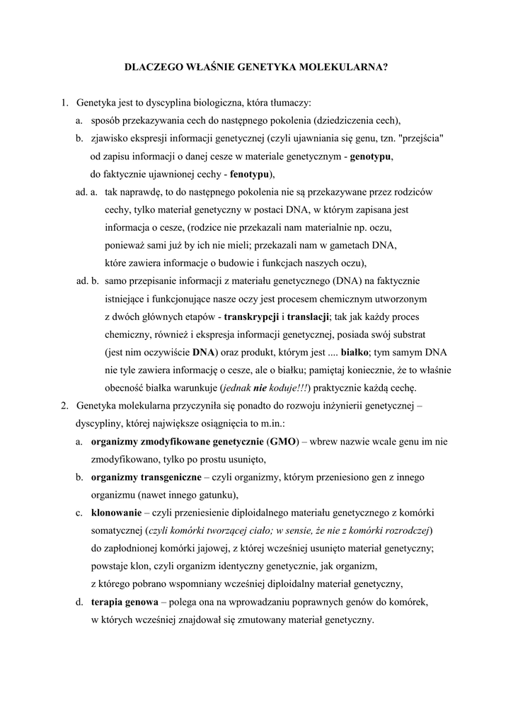 DLACZEGO WŁAŚNIE GENETYKA MOLEKULARNA? 1. Genetyka jest to dyscyplina biologiczna, która tłumaczy: a. sposób przekazywania cech do następnego pokolenia (dziedziczenia cech), b. zjawisko ekspresji informacji genetycznej (czyli ujawniania się genu, tzn. "przejścia" od zapisu informacji o danej cesze w materiale genetycznym - genotypu, do faktycznie ujawnionej cechy - fenotypu), ad. a. tak naprawdę, to do następnego pokolenia nie są przekazywane przez rodziców cechy, tylko materiał genetyczny w postaci DNA, w którym zapisana jest informacja o cesze, (rodzice nie przekazali nam materialnie np. oczu, ponieważ sami już by ich nie mieli; przekazali nam w gametach DNA, które zawiera informacje o budowie i funkcjach naszych oczu), ad. b. samo przepisanie informacji z materiału genetycznego (DNA) na faktycznie istniejące i funkcjonujące nasze oczy jest procesem chemicznym utworzonym z dwóch głównych etapów - transkrypcji i translacji; tak jak każdy proces chemiczny, również i ekspresja informacji genetycznej, posiada swój substrat (jest nim oczywiście DNA) oraz produkt, którym jest .... białko; tym samym DNA nie tyle zawiera informację o cesze, ale o białku; pamiętaj koniecznie, że to właśnie obecność białka warunkuje (jednak nie koduje!!!) praktycznie każdą cechę. 2. Genetyka molekularna przyczyniła się ponadto do rozwoju inżynierii genetycznej – dyscypliny, której największe osiągnięcia to m.in.: a. organizmy zmodyfikowane genetycznie (GMO) – wbrew nazwie wcale genu im nie zmodyfikowano, tylko po prostu usunięto, b. organizmy transgeniczne – czyli organizmy, którym przeniesiono gen z innego organizmu (nawet innego gatunku), c. klonowanie – czyli przeniesienie diploidalnego materiału genetycznego z komórki somatycznej (czyli komórki tworzącej ciało; w sensie, że nie z komórki rozrodczej) do zapłodnionej komórki jajowej, z której wcześniej usunięto materiał genetyczny; powstaje klon, czyli organizm identyczny genetycznie, jak organizm, z którego pobrano wspomniany wcześniej diploidalny materiał genetyczny, d. terapia genowa – polega ona na wprowadzaniu poprawnych genów do komórek, w których wcześniej znajdował się zmutowany materiał genetyczny.