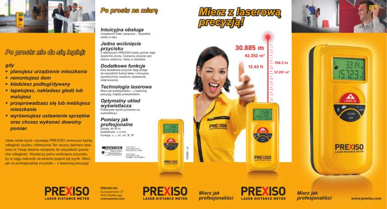 Mierz z laserową precyzją! Po prostu na miarę Intuicyjna obsługa Urządzenie małe i poręczne – wszystkie zalety w ręku. gdy • planujesz urządzenie mieszkania • remontujesz dom • kładziesz podłogi/dywany • tapetujesz, nakładasz gładź lub malujesz • przeprowadzasz się lub meblujesz mieszkanie • wyrównujesz ustawienie sprzętów oraz chcesz wykonać dowolny pomiar. 30.885 m Z dalmierzem PREXISO każdy pomiar staje dziecinnie prosty. Czerwony przycisk jest dobrze widoczny i łatwy w obsłudze. 42.252 m2 Dodatkowe funkcje 12.43 ft Dwa dodatkowe przyciski dają dostęp do wszystkich funkcji łatwo i intuicyjnie (powierzchnia, kubatura, dodawanie, odejmowanie). 156.3 in 57.291 m3 Technologia laserowa Mierz jak profesjonaliści – z laserową precyzją, między przeszkodami. Optymalny układ wyświetlacza Przejrzyste wyniki pomiarów na wyświetlaczu. Pomiary jak profesjonalne Zasięg: do 40 m Dokładność: ± 3 mm Funkcje: +, –, m2, m3, ft2, ft3 Ułatw sobie życie: używając PREXISO zmierzysz każdą odległość szybko i efektywnie.Ten ręczny dalmierz lase rowy to Twoje idealne narzędzie do wszystkich pomia rów odległości. Wystarczy jedno wciśnięcie przycisku by w ciągu sekundy na ekranie pojawił się wynik. Mierz jak na profesjonalistę przystało – z laserową precyzją! Laser class II in accordance with FDA 21CFR Ch.1 § 1040 Laser class 2 in accordance with IEC 60825-1 and EN 60825-1 PREXISO AG Europastrasse 27 8152 Glattbrugg www.prexiso.com 759880 – pl Po prostu nie da się lepiej: Jedno wciśnięcie przycisku Mierz jak profesjonaliści Mierz jak profesjonaliści www.prexiso.com Mierz z laserową precyzją! 12.43 ft 57.291 m3 42.252 m2 Zalety lasera: porównanie się opłaca! 30.885 m 156.3 in Włącz, wyceluj, zmierz – praca wykonana! Używaj dalmierza PREXISO gdy chcesz sobie uprościć prace. Wysoka jakość emitowanego lasera daje Ci bardzo wiele: nawet w przypadku dużych odległości dalmierz zapewni najwyższą dokładność pomiaru. PREXISO to pełny profesjo nalizm w połączeniu z łatwością obsługi. Laser Miejsca niedostępne Przykładowo: stosując PREXISO wyznaczysz wysokość obiektu za pomocą jednego przycisku. Podczas remontów wszystko pod ręką Nie potrzebujesz żadnej pomocy: dzięki PREXISO wyznaczasz wszelkie powierzchnie czy domiary działając zupełnie sam. Idealne rozplanowanie i meblowanie mieszkania Z PREXISO w ręku wyznaczysz kążdą powierzchnię oraz wymiary pomieszczenia. Zaprojektowane by oszczędzać pieniądze Dzięki dokładnym pomiarom możesz precyzyjnie określić ilość potrzebnego materiału, np. w trak cie tapetowania czy murowania. Ultradźwięki Dokładność ± 3mm ok. ± 50 mm Pomiary do 40 m ok. 15 m Pomiary od 0.10 m ok. 1 m Pomiary w różnych temperaturach od 0° do +40° C: zawsze dokładne niedokładne w przypadku zmiany temperatur Pomiary bezpośrednie nawet w niedostępnych miejscach tylko wówczas gdy celowej nie przesła niają żadne obiekty (problem rozprasza nia wiązki) Pomiary do pochyłych ścian zawsze dokładne – do miejsca padania wiązki lasera niedokładne z powodu rozpraszania wiązki Pomiary wzdłuż ścian zawsze dokładne – do miejsca padania wiązki lasera niedokładne z powodu rozpraszania wiązki bardzo dobry słaby Dalmierze laserowe wykonują pomiary precyzyjne i punktowe przy zastosowaniu wiązki lasera. Dzięki temu wiesz dokładnie gdzie znajduje się cel, do ktorego mierzysz. Możesz zatem w pełni polegać na otrzymanym wyniku. Dalmierze ultradźwiękowe natomiast mierzą przy użyciu fal akustycznych, które rozprzestrzeniają się stożkowo począwszy od miejsca ich emisji. Jest to głównym powodem występowania niedokładności pomiarów.Ultradźwięki odbijają się od różnych przedmiotów oraz przeszkód co prowadzi do powstawania błędów. Metrówka lub taśma sprawdzają się tylko przy krótkich odległościach. Powyżej 1 metra pomiary się komplikują: są wprawdzie możliwe aczkolwiek bardzo niedokładne. Od dziś mierz już łatwo i szybko za pomocą PREXISO! Mierz jak profesjonaliści
