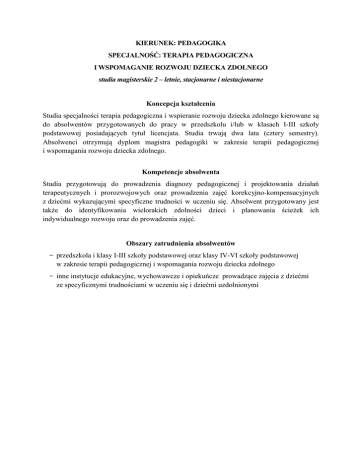 KIERUNEK: PEDAGOGIKA SPECJALNOŚĆ: TERAPIA PEDAGOGICZNA I WSPOMAGANIE ROZWOJU DZIECKA ZDOLNEGO studia magisterskie 2 – letnie, stacjonarne i niestacjonarne Koncepcja kształcenia Studia specjalności terapia pedagogiczna i wspieranie rozwoju dziecka zdolnego kierowane są do absolwentów przygotowanych do pracy w przedszkolu i/lub w klasach I-III szkoły podstawowej posiadających tytuł licencjata. Studia trwają dwa lata (cztery semestry). Absolwenci otrzymują dyplom magistra pedagogiki w zakresie terapii pedagogicznej i wspomagania rozwoju dziecka zdolnego. Kompetencje absolwenta Studia przygotowują do prowadzenia diagnozy pedagogicznej i projektowania działań terapeutycznych i prorozwojowych oraz prowadzenia zajęć korekcyjno-kompensacyjnych z dziećmi wykazującymi specyficzne trudności w uczeniu się. Absolwent przygotowany jest także do identyfikowania wielorakich zdolności dzieci i planowania ścieżek ich indywidualnego rozwoju oraz do prowadzenia zajęć. Obszary zatrudnienia absolwentów ̶ przedszkola i klasy I-III szkoły podstawowej oraz klasy IV-VI szkoły podstawowej w zakresie terapii pedagogicznej i wspomagania rozwoju dziecka zdolnego ̶ inne instytucje edukacyjne, wychowawcze i opiekuńcze prowadzące zajęcia z dziećmi ze specyficznymi trudnościami w uczeniu się i dziećmi uzdolnionymi