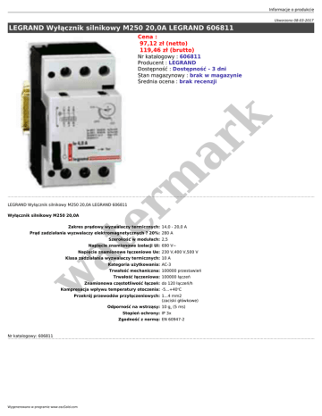Informacje o produkcie Utworzono 08-03-2017 LEGRAND Wyłącznik silnikowy M250 20,0A LEGRAND 606811 Cena : 97,12 zł (netto) 119,46 zł (brutto) er m ar k Nr katalogowy : 606811 Producent : LEGRAND Dostępność : Dostępność - 3 dni Stan magazynowy : brak w magazynie Średnia ocena : brak recenzji LEGRAND Wyłącznik silnikowy M250 20,0A LEGRAND 606811 Wyłącznik silnikowy M250 20,0A Zakres prądowy wyzwalaczy termicznych: 14,0 - 20,0 A Prąd zadziałania wyzwalaczy elektromagnetycznych ? 20%: 280 A at Szerokość w modułach: 2,5 Napięcie znamionowe izolacji Ui: 690 V~ Napięcie znamionowe łączeniowe Ue: 230 V,400 V,500 V Klasa zadziałania wyzwalaczy termicznych: 10 A Kategoria użytkowania: AC-3 w Trwałość mechaniczna: 100000 przestawień Trwałość łączeniowa: 100000 łączeń Znamionowa częstotliwość łączeń: do 120 łączeń/h Kompresacja wpływu temperatury otoczenia: -5...+40oC Przekrój przewodów przyłączeniowych: 1...4 mm2 (zaciski główkowe) Odporność na wstrząsy: 10 gn (5 ms) Stopień ochrony: IP 3x Zgodność z normą: EN 60947-2 Nr katalogowy: 606811 Wygenerowano w programie www.oscGold.com