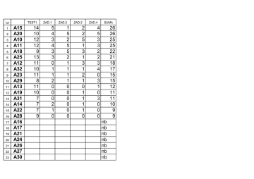 Lp 1 2 3 4 5 6 7 8 9 10 11 12 13 14 15 16 17 18 19 20 21 22 23 TEST1 A15 A20 A10 A11 A18 A25 A12 A32 A23 A29 A13 A19 A31 A14 A22 A28 A16 A17 A21 A24 A26 A27 A30 14 10 12 12 9 13 11 10 11 8 11 10 7 7 7 9 ZAD.1 5 4 3 4 3 3 0 1 1 2 0 0 0 2 1 0 ZAD.2 1 5 2 5 5 2 1 1 1 1 0 0 0 0 0 0 ZAD.3 2 2 5 1 3 1 3 1 2 1 0 1 1 1 1 0 ZAD.4 SUMA 4 5 3 3 2 2 3 4 0 3 1 0 3 0 0 0 26 26 25 25 22 21 18 17 15 15 12 11 11 10 9 9 nb nb nb nb nb nb nb