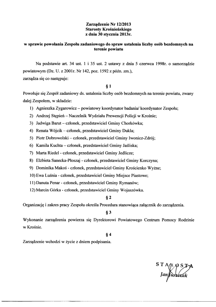 Zarządzenie Nr 12/2013 Starosty Krośnieńskiego z dnia 30 stycznia