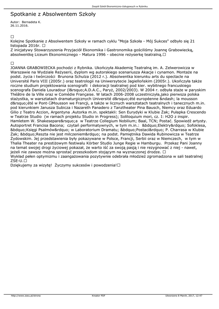 Zespół Szkół Ekonomiczno-Usługowych w Rybniku Spotkanie z Absolwentem Szkoły Autor: Bernadeta K. 26.11.2016. Kolejne Spotkanie z Absolwentem Szkoły w ramach cyklu "Moja Szkoła - Mój Sukces" odbyło się 21 listopada 2016r. Z inicjatywy Stowarzyszenia Przyjaciół Ekonomika i Gastronomika gościliśmy Joannę Grabowiecką, absolwentkę Liceum Ekonomicznego - Matura 1996 - obecnie reżyserkę teatralną. JOANNA GRABOWIECKA pochodzi z Rybnika. Ukończyła Akademię Teatralną im. A. Zelwerowicza w Warszawie na Wydziale Reżyserii, dyplom wg autorskiego scenariusza Akacje i cynamon. Montaże na podst. życia i twórczości Brunona Schulza (2012 r.). Absolwentka kierunku arts du spectacle na Université Paris VIII (2005r.) oraz teatrologii na Uniwersytecie Jagiellońskim (2005r.). Ukończyła także roczne studium projektowania scenografii i dekoracji teatralnej pod kier. wybitnego francuskiego scenografa Daniela Louradour (l’A.D.A.C., Paryż, 2002/2003). W 2004 r. odbyła staże w paryskim Théâtre de la Ville oraz w Comédie Française. W latach 2006-2008 uczestniczyła,jako pierwsza polska stażystka, w warsztatach dramaturgicznych Université d’été européenne – la mousson d’été w Pont-à-Mousson we Francji, a także w licznych warsztatach teatralnych i tanecznych m.in. pod kierunkiem Janusza Subicza i Nazareth Panadero z Tanztheater Pina Bausch, Niemcy oraz Eduardo Gilio z Teatro Accion, Argentyna .Autorka m.in. spektakli: Sen Eurydyki w Klubie Żak; Pułapka Crescendo w Teatrze Studio (w ramach projektu Studio in Progress); Soliloquium mori, cz. I: H2O z inspir. Hamletem W. Shakesepare’a w Teatrze Collegium Nobilium; Baal, TCN; Postać. Spowiedź artysty. Autoportret Francisa Bacona; czytań performatywnych, w tym m.in.: „Elektry” Sofoklesa, „Księgi Psalmów” w Laboratorium Dramatu; „Postaci” P. Charrasa w Klubie Żak; „Reszta nie jest milczeniem” na podst. Pamiętnika Dawida Rubinowicza w Teatrze Żydowskim. Jej przedstawienia były pokazywane w Polsce, Francji, Serbii oraz w Niemczech, w tym w Thalia Theater na prestiżowym festiwalu Körber Studio Junge Regie w Hamburgu. Przekaz Pani Joanny na temat swojej drogi życiowej pokazał, że warto iść za swoją pasją i nie rezygnować z niej - nawet, jeżeli nie zawsze można sprostać przeszkodom stojącym na wyznaczonej drodze. Wykład pełen optymizmu i zaangażowania pozytywnie odebrała młodzież zgromadzona w sali teatralnej ZSE-U. Dziękujemy za wizytę! Życzymy sukcesów i powodzenia! http://www.zseu.pl/strona Kreator PDF Utworzono 8 March, 2017, 12:47