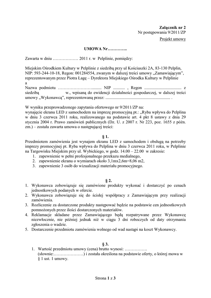 Załącznik nr 2 Nr postępowania 9/2011/ZP Projekt umowy UMOWA Nr………….. Zawarta w dniu ……………… 2011 r. w Pelplinie, pomiędzy: Miejskim Ośrodkiem Kultury w Pelplinie z siedzibą przy ul Kościuszki 2A, 83-130 Pelplin, NIP: 593-244-10-18, Regon: 001284554, zwanym w dalszej treści umowy „Zamawiającym”, reprezentowanym przez Piotra Łagę – Dyrektora Miejskiego Ośrodka Kultury w Pelplinie a Nazwa podmiotu ……………………......... NIP ........... , Regon ................................... z siedzibą w., wpisaną do ewidencji działalności gospodarczej, w dalszej treści umowy „Wykonawcą”, reprezentowaną przez: ............................................................. . W wyniku przeprowadzonego zapytania ofertowego nr 9/2011/ZP na: wynajęcie ekranu LED z samochodem na imprezę promocyjną pt.: „Ryba wpływa do Pelplina w dniu 3 czerwca 2011 roku, realizowanego na podstawie art. 4 pkt 8 ustawy z dnia 29 stycznia 2004 r. Prawo zamówień publicznych (Dz. U. z 2007 r. Nr 223, poz. 1655 z późn. zm.) – została zawarta umowa o następującej treści: § 1. Przedmiotem zamówienia jest wynajem ekranu LED z samochodem i obsługą na potrzeby imprezy promocyjnej pt. Ryba wpływa do Pelplina w dniu 3 czerwca 2011 roku, w Pelplinie na Targowisku Miejskim przy ul. Wybickiego, w godz. 14.00 – 22.00 w zakresie: 1. zapewnienie w pełni profesjonalnego przekazu medialnego, 2. zapewnienie ekranu o wymiarach około 3,1mx2,6m=8,06 m2, 3. zapewnienie 3 osób do wizualizacji materiału promocyjnego. § 2. 1. Wykonawca zobowiązuje się zamówione produkty wykonać i dostarczyć po cenach jednostkowych podanych w ofercie. 2. Wykonawca zobowiązuje się do ścisłej współpracy z Zamawiającym przy realizacji zamówienia. 3. Rozliczenie za dostarczone produkty następować będzie na podstawie cen jednostkowych pomnożonych przez ilości dostarczonych materiałów. 4. Reklamacje składane przez Zamawiającego będą rozpatrywane przez Wykonawcę niezwłocznie, nie później jednak niż w ciągu 3 dni roboczych od daty otrzymania zgłoszenia o wadzie. 5. Dostarczenie przedmiotu zamówienia wolnego od wad nastąpi na koszt Wykonawcy. § 3. 1. Wartość przedmiotu umowy (cena) brutto wynosi: ……………. (słownie:…………………) i została określona na podstawie oferty, o której mowa w § 1 ust. 1 umowy. Strona 1 z 3 2. W cenie zawarte są wszystkie koszty związane z dostawą przedmiotu umowy do Pelplina – Targowisko Miejskie przy ul. Wybickiego, według zasad przyjętych w niniejszej umowie. 3. Ceny jednostkowe podane przez Wykonawcę nie ulegają zmianie przez cały okres obowiązywania umowy. §4. 1. Zmawiający zobowiązuje się do zapłaty należności przelewem, w terminie 30 dni od daty prawidłowego wystawienia faktury, na konto wskazane w treści faktury. 2. Za datę zapłaty należności uważa się datę obciążenia konta Zamawiającego. 3. W przypadku nie dokonania płatności przez Zamawiającego w wyznaczonym w umowie terminie, Wykonawca ma prawo naliczyć odsetki ustawowe za każdy dzień zwłoki. §5. 1. Wykonawca jest zobowiązany do zapłaty kar umownych: za zwłokę w dostawie przedmiotu umowy w wysokości 5% wartości, za każdą godzinę zwłoki liczone od godziny 13.00 dnia wyznaczonego na dostarczenie przedmiotu umowy. 2. Zamawiający zastrzega sobie prawo dochodzenia roszczeń uzupełniających w przypadku, gdy szkoda z tytułu nie wykonania lub nienależytego wykonania umowy przekroczy kwotę naliczonych kar umownych. § 6. 1. Wykonawca wykona przedmiot umowy zgodny z ofertą z dnia …… 2011 r. na Targowisku Miejskim w Pelplinie przy ul. Wybickiego do dnia 03.06.2011 r., godz. 14.00. 2. Zamawiającemu przysługuje prawo odstąpienia od umowy w przypadku: a) Wystąpienia istotnej zmiany okoliczności powodującej, że wykonie umowy nie leży w interesie publicznym, czego nie można było przewidzieć w chwili zawarcia umowy. Zamawiający może odstąpić od umowy w terminie 14 dni od powzięcia wiadomości o powyższych okolicznościach. W takiej sytuacji Wykonawca może żądać jedynie wynagrodzenia należytego mu z tytułu wykonania części umowy. b) Ogłoszenia upadłości lub likwidacji Wykonawcy; c) Wydania nakazu zajęcia majątku Wykonawcy. 3. Odstąpienie od umowy wymaga formy pisemnej pod rygorem nieważności oraz powinno zawierać uzasadnienie prawne i faktyczne odstąpienia. 4. Zamawiający zastrzega sobie prawo rozwiązania umowy ze skutkiem natychmiastowym w następujących okolicznościach: a) trzykrotnej reklamacji wad jakościowych przedmiotu zamówienia; b) niedostarczenia towaru do wskazanego miejsca; c) innego rodzaju rażącego nienależytego wykonania lub nie wykonania umowy, czyniącego dalsze jej realizowanie bezprzedmiotowym. § 7. 1. Wykonawca nie może przenieść wierzytelności wynikającej z umowy na rzecz osób trzecich, bez pisemnej zgody Zamawiającego. 2. Wykonawca nie może, bez pisemnej zgody Zamawiającego, powierzyć realizacji umowy innemu wykonawcy. Strona 2 z 3 3. Wszelkie zmiany postanowień niniejszej umowy wymagają dla swej ważności zgody obu stron oraz formy pisemnej (aneks) pod rygorem nieważności. 4. W sprawach nieuregulowanych przedmiotową umową zastosowanie mają przepisy Kodeksu Cywilnego. 5. Strony będą dążyły do polubownego rozstrzygania wszelkich sporów powstałych w związku z wykonaniem niniejszej umowy. W przypadku, gdy strony nie osiągną porozumienia, zaistniały spór będzie poddany rozstrzygnięciu właściwemu rzeczowo i terytorialnie sądowi powszechnemu. § 8. Umowa sporządzona została w trzech jednobrzmiących egzemplarzach, jeden dla Wykonawcy, natomiast dwa egzemplarze dla Zamawiającego. ZAMAWIAJĄCY WYKONAWCA ……………………………… ……………………………… Załączniki: 1. Oferta Wykonawcy GMINA PELPLIN Strona 3 z 3