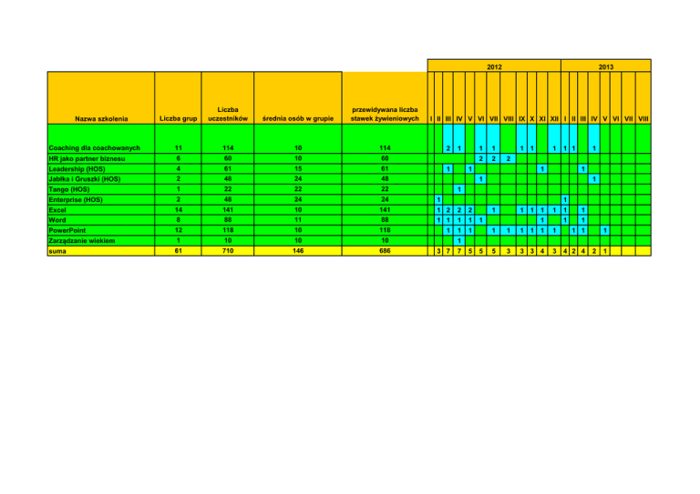 2012 Liczba grup Liczba uczestników średnia osób w grupie przewidywana liczba stawek żywieniowych Coaching dla coachowanych 11 114 10 114 HR jako partner biznesu 6 60 10 60 Leadership (HOS) 4 61 15 61 Jabłka i Gruszki (HOS) 2 48 24 48 Tango (HOS) 1 22 22 22 Nazwa szkolenia 2013 I II III IV V VI VII VIII IX X XI XII I II III IV V VI VII VIII 2 1 1 1 1 2 2 1 1 1 1 1 1 2 1 1 1 1 1 1 Enterprise (HOS) 2 48 24 24 1 Excel 14 141 10 141 1 2 Word 8 88 11 88 1 1 1 1 PowerPoint 12 118 10 118 1 1 1 Zarządzanie wiekiem 1 10 10 10 suma 61 710 146 686 1 2 2 1 1 1 1 1 1 1 1 1 1 1 1 1 1 1 1 1 1 1 5 3 3 3 4 3 4 2 4 1 1 3 7 7 5 5 2 1