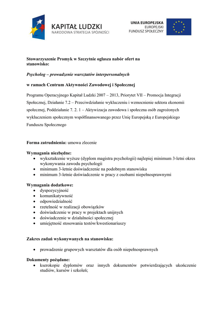 Stowarzyszenie Promyk w Szczytnie ogłasza nabór ofert na stanowisko: Psycholog – prowadzenie warsztatów interpersonalnych w ramach Centrum Aktywności Zawodowej i Społecznej Programu Operacyjnego Kapitał Ludzki 2007 – 2013, Priorytet VII – Promocja Integracji Społecznej, Działanie 7.2 – Przeciwdziałanie wykluczeniu i wzmocnienie sektora ekonomii społecznej, Poddziałanie 7. 2. 1 – Aktywizacja zawodowa i społeczna osób zagrożonych wykluczeniem społecznym współfinansowanego przez Unię Europejską z Europejskiego Funduszu Społecznego Forma zatrudnienia: umowa zlecenie Wymagania niezbędne: wykształcenie wyższe (dyplom magistra psychologii) najlepiej minimum 3-letni okres wykonywania zawodu psychologii minimum 3-letnie doświadczenie na podobnym stanowisku minimum 3-letnie doświadczenie w pracy z osobami niepełnosprawnymi Wymagania dodatkowe: dyspozycyjność komunikatywność odpowiedzialność rzetelność w realizacji obowiązków doświadczenie w pracy w projektach unijnych doświadczenie w działalności społecznej umiejętność stosowania testów/kwestionariuszy Zakres zadań wykonywanych na stanowisku: prowadzenie grupowych warsztatów dla osób niepełnosprawnych Dokumenty pożądane: kserokopie dyplomów oraz innych dokumentów potwierdzających ukończenie studiów, kursów i szkoleń; Osoby zainteresowane, prosimy o składanie wymaganych dokumentów na adres: Stowarzyszenie Promyk Ul. Pasymska 21A 12-100 Szczytno z dopiskiem: Psycholog w terminie do 15 kwietnia 2011 roku, do godz. 15.00 (data i godzina wpływu), lub osobiście do Biura projektu: Stowarzyszenie Promyk Ul. Pasymska 21A 12-100 Szczytno pok. 21. Aplikacje, które wpłyną do Stowarzyszenia „Promyk” po upływie wyżej wymienionego terminu nie będą rozpatrywane. Lista kandydatów i instytucji spełniających wymagania formalne oraz informacja o wyniku naboru zostanie zamieszczona na tablicy informacyjnej Stowarzyszenia „Promyk” w Szczytnie, na stronie internetowej www.promyk.org.pl Do wymaganych dokumentów proszę dołączyć następującą klauzulę: „Wyrażam zgodę na przetwarzanie moich danych osobowych zawartych w ofercie pracy dla potrzeb niezbędnych do realizacji procesu rekrutacji zgodnie z ustawą z dnia 29.08.1997 r. o ochronie danych osobowych (Dz. U. z 2002 r. Nr 101, poz. 926). Opublikował(a):Izabela Drozd-Giejda Data emisji ogłoszenia 11.04.2011r. .