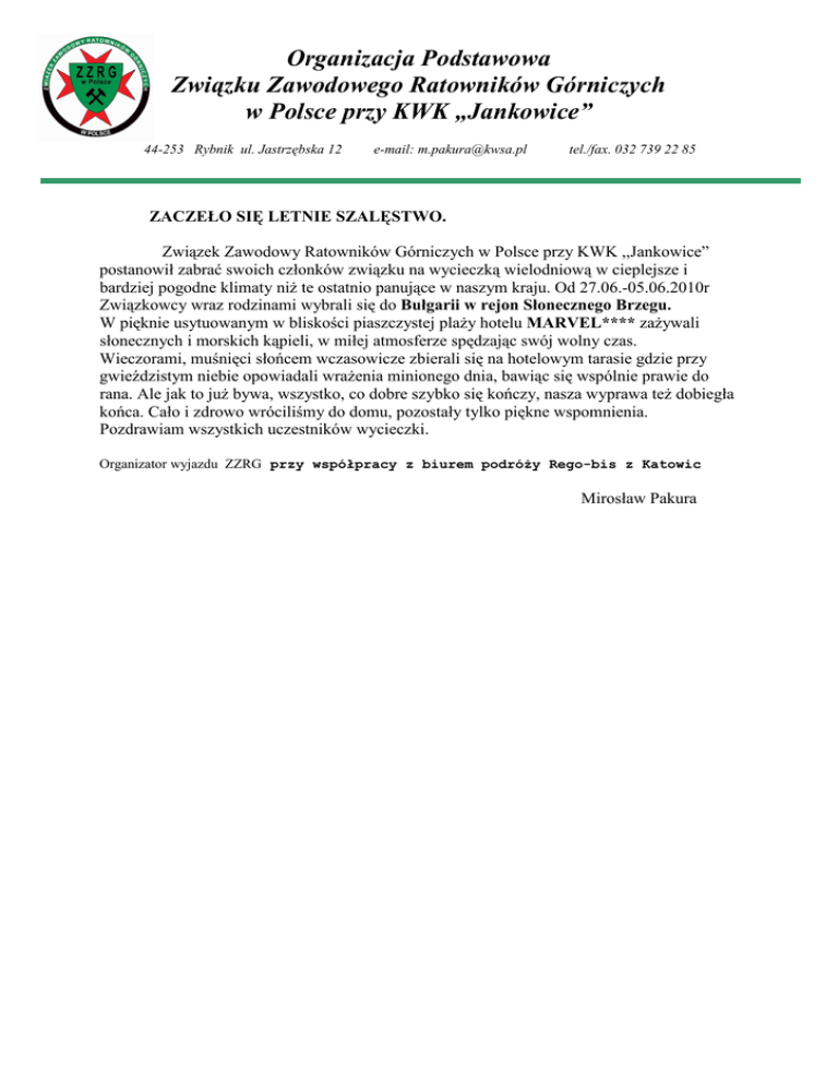 Organizacja Podstawowa Związku Zawodowego Ratowników Górniczych w Polsce przy KWK „Jankowice” 44-253 Rybnik ul. Jastrzębska 12 e-mail: [email protected] tel./fax. 032 739 22 85 ZACZEŁO SIĘ LETNIE SZALĘSTWO. Związek Zawodowy Ratowników Górniczych w Polsce przy KWK ,,Jankowice” postanowił zabrać swoich członków związku na wycieczką wielodniową w cieplejsze i bardziej pogodne klimaty niż te ostatnio panujące w naszym kraju. Od 27.06.-05.06.2010r Związkowcy wraz rodzinami wybrali się do Bułgarii w rejon Słonecznego Brzegu. W pięknie usytuowanym w bliskości piaszczystej plaży hotelu MARVEL**** zażywali słonecznych i morskich kąpieli, w miłej atmosferze spędzając swój wolny czas. Wieczorami, muśnięci słońcem wczasowicze zbierali się na hotelowym tarasie gdzie przy gwieździstym niebie opowiadali wrażenia minionego dnia, bawiąc się wspólnie prawie do rana. Ale jak to już bywa, wszystko, co dobre szybko się kończy, nasza wyprawa też dobiegła końca. Cało i zdrowo wróciliśmy do domu, pozostały tylko piękne wspomnienia. Pozdrawiam wszystkich uczestników wycieczki. Organizator wyjazdu ZZRG przy współpracy z biurem podróży Rego-bis z Katowic Mirosław Pakura