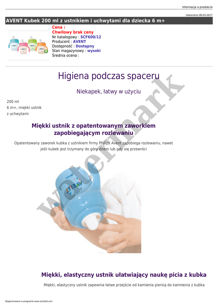 Informacje o produkcie Utworzono 08-03-2017 AVENT Kubek 200 ml z ustnikiem i uchwytami dla dziecka 6 m+ Cena : Chwilowy brak ceny Nr katalogowy : SCF600/12 Producent : AVENT Dostępność : Dostępny Stan magazynowy : wysoki Średnia ocena : er m ar k Higiena podczas spaceru Niekapek, łatwy w użyciu 200 ml 6 m+, miękki ustnik z uchwytami Miękki ustnik z opatentowanym zaworkiem zapobiegającym rozlewaniu Opatentowany zaworek kubka z ustnikiem firmy Philips Avent zapobiega rozlewaniu, nawet w at jeśli kubek jest trzymany do góry dnem lub gdy się przewróci Miękki, elastyczny ustnik ułatwiający naukę picia z kubka Miękki, elastyczny ustnik zapewnia łatwe przejście od kamienia piersią do karmienia z kubka Wygenerowano w programie www.oscGold.com er m ar k Uchwyty mają odpowiedni kształt dla małych rączek Uchwyty mają odpowiedni kształt specjalnie dla małych rączek. Można je łatwo zamocować lub zdjąć w at . Skala na kubku Skala na kubku zapewnia łatwe przygotowanie napoju dla dziecka er m ar k Informacje o produkcie Odchylana pokrywka zapewnia czysty ustnik Odchylana przykrywka zawsze zapewnia higienę i czystość ustnika zarówno w domu, jak i na w at spacerze Można go używać z innymi produktami Philips Avent Kubki, ustniki i uchwyty mogą być używane z produktami Philips Avent. Można je dołączać bezpośrednio do laktatorów lub założyć smoczek na kubek zamiast ustnika w celu nakarmienia dziecka. Miękki ustnik i uchwyty można również założyć na butelkę do karmienia Wygenerowano w programie www.oscGold.com er m ar k . w at Kubek można w całości sterylizować elementów, co ułatwia czyszczenie i Specy Kubek składa się z niewieluskładanie fikacja techni czna Kraj pochodzeni a Informacje o produkcie Anglia Etapy rozwoju Etapy 6 miesięcy + Zawartość zestawu Pokrywka Uchwyty do nauki picia w at Miękki ustnik Wygenerowano w programie www.oscGold.com 1 szt. er m ar k Kubek bez ozdób 200 ml 1 szt. 1 szt. 1 szt.