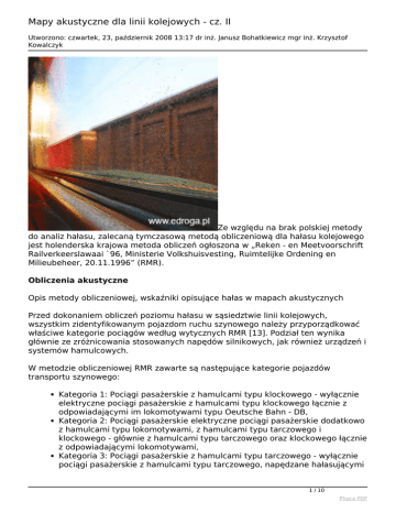 Mapy akustyczne dla linii kolejowych - cz. II Utworzono: czwartek, 23, październik 2008 13:17 dr inż. Janusz Bohatkiewicz mgr inż. Krzysztof Kowalczyk Ze względu na brak polskiej metody do analiz hałasu, zalecaną tymczasową metodą obliczeniową dla hałasu kolejowego jest holenderska krajowa metoda obliczeń ogłoszona w „Reken - en Meetvoorschrift Railverkeerslawaai `96, Ministerie Volkshuisvesting, Ruimtelijke Ordening en Milieubeheer, 20.11.1996” (RMR). Obliczenia akustyczne Opis metody obliczeniowej, wskaźniki opisujące hałas w mapach akustycznych Przed dokonaniem obliczeń poziomu hałasu w sąsiedztwie linii kolejowych, wszystkim zidentyfikowanym pojazdom ruchu szynowego należy przyporządkować właściwe kategorie pociągów według wytycznych RMR [13]. Podział ten wynika głównie ze zróżnicowania stosowanych napędów silnikowych, jak również urządzeń i systemów hamulcowych. W metodzie obliczeniowej RMR zawarte są następujące kategorie pojazdów transportu szynowego: Kategoria 1: Pociągi pasażerskie z hamulcami typu klockowego - wyłącznie elektryczne pociągi pasażerskie z hamulcami typu klockowego łącznie z odpowiadającymi im lokomotywami typu Oeutsche Bahn - DB, Kategoria 2: Pociągi pasażerskie elektryczne pociągi pasażerskie dodatkowo z hamulcami typu lokomotywami, z hamulcami typu tarczowego i klockowego - głównie z hamulcami typu tarczowego oraz klockowego łącznie z odpowiadającymi lokomotywami, Kategoria 3: Pociągi pasażerskie z hamulcami typu tarczowego - wyłącznie pociągi pasażerskie z hamulcami typu tarczowego, napędzane hałasującymi 1 / 10 Phoca PDF Mapy akustyczne dla linii kolejowych - cz. II Utworzono: czwartek, 23, październik 2008 13:17 dr inż. Janusz Bohatkiewicz mgr inż. Krzysztof Kowalczyk jednostkami napędowymi, Kategoria 4: Pociągi towarowe z hamulcami typ u klockowego – wszystkie typy pociągów towarowych z hamulcami typu klockowego, Kategoria 5: Pociągi napędzane silnikiem spalinowym (silnikiem diesela) z hamulcami typu klockowego - wyłącznie pociągi pasażerskie napędzane silnikiem spalinowo-elektrycznym z hamulcami typu klockowego, łącznie z odpowiadającymi im lokomotywami, Kategoria 6: Pociągi napędzane silnikiem spalinowym (silnikiem diesela) z hamulcami typu tarczowego - wyłącznie pociągi pasażerskie napędzane silnikiem spalinowo-hydraulicznym z hamulcami typu tarczowego, łącznie z odpowiadającymi im lokomotywami, Kategoria 7: Szybka kolej miejska (metro) i tramwaje dwusystemowe z hamulcami typu tarczowego - szybka kolej miejska oraz pojazdy szynowe komunikacji lokalnej (łączące w sobie właściwości pojazdu kolejowego i tramwaju) z hamulcami typu tarczowego, Kategoria 8: Pociągi pasażerskie InterCity z hamulcami typu tarczowego oraz pociągi typu wolnobieżnego - wyłącznie elektryczne pociągi pasażerskie z hamulcami typu tarczowego łącznie z odpowiadającymi im lokomotywami (np. InterCities ICM -I V, lRM i SM90) oraz elektryczne pociągi głównie z hamulcami typu tarczowego oraz dodatkowo z hamulcami typu klockowego łącznie z odpowiadającymi im lokomotywami typu InterCities ICM-III i DDM-2/3, Kategoria 9: Szybkobieżne pojazdy szynowe z hamulcami typu tarczowego i klockowego -elektryczne pociągi szybkobieżne z hamulcami typu tarczowego oraz dodatkowo z hamulcami typu klockowego na wagonach silnikowych np. TGV-PBA lub Thalys (HST), * Kategoria 10: Kategoria tymczasowo zarezerwowana dla pociągów szybkobieżnych typu ICE-3 (M) (HST East). W zależności od rozwiązań nawierzchni torowych metoda wyróżnia następujące typy torów kolejowych: b= 1 - tory kolejowe z zastosowaniem pojedynczych lub podwójnych podkładów blokowych (betonowych) z podsypką na podłożu, b=2 - tory kolejowe z zastosowaniem drewnianych lub naprzemian betonowych podkładów z podsypką na podłożu, b=3 - tory kolejowe z niespawanymi szynami z podsypką na podłożu oraz tory z zastosowaniem łączeń lub zwrotnic, b=4 - tory kolejowe z zastosowaniem podkładów blokowych, b=5 - tory kolejowe z zastosowaniem podkładów blokowych i podsypką na podłożu, b=6 - tory kolejowe z regulowanym przytwierdzeniem szyn, b=7 - tory kolejowe z regulowanym przytwierdzeniem szyn i podsypką na podłożu, b=8 - tory kolejowe z zastosowaną wylewką wzdłuż torów, tory kolejowe z przejazdami kolejowymi. 2 / 10 Phoca PDF Mapy akustyczne dla linii kolejowych - cz. II Utworzono: czwartek, 23, październik 2008 13:17 dr inż. Janusz Bohatkiewicz mgr inż. Krzysztof Kowalczyk Z kolei przy wyznaczaniu wartości emisji metoda RMR uwzględnia właściwości wynikające ze sposobów łączenia szyn, a mianowicie według ilości złączeń szyn, jakie występują na drodze emisji: całkowicie spawane szyny z lub bez łączonych zwrotnic lub rozjazdów (m= 1), szyny z łączeniami lub izolowane złącza szynowe (m=2), zwrotnice i rozjazdy z łączeniami, 2 na 100 m (m=3), więcej niż 2 zwrotnice na 100 m. Wartość poziomu emisji wyznaczana jest dla pięciu różnych wysokości: na poziomie szyn 0.5 m nad torami 2.0 m nad torami 4.0 m nad torami 5.0 m nad torami (LEbs), (LEas), (LE2m), (LE4m), (LE5m). Nie dla wszystkich kategorii pojazdów szynowych oblicza się emisje pochodzące od wszystkich charakterystycznych wysokości. Wysokości te mają istotne znaczenie dla większości pojazdów szynowych dużych prędkości. Dla pojazdów transportu szynowego niższych prędkości przyjmuje się w modelu obliczeniowym wartość 0 dla wyższych wysokości poziomu emisji. Zgodnie z Dyrektywą [11] jako wskaźniki opisujące wartości hałasu dla map akustycznych stosowane są średnioroczne wskaźniki LN i LDWN. Wskaźnik LN, zgodnie z art. 112 a, pkt l, lit. b. ustawy [3], jest długookresowym średnim poziomem dźwięku A wyrażonym w decybelach (dB), wyznaczonym w ciągu wszystkich pór nocy w roku (przedział czasu od godz. 22:00 do godz. 6:00). Wskaźnik LDWN jest zdefiniowany jako długookresowy śre