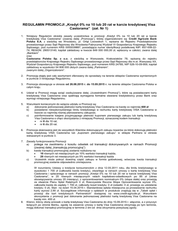 REGULAMIN PROMOCJI „Kredyt 0% na 10 lub 20 rat w karcie kredytowej Visa Castorama” (zał. Nr 1) 1. Niniejszy Regulamin określa zasady uczestnictwa w promocji „Kredyt 0% na 10 lub 20 rat w karcie kredytowej Visa Castorama” (zwanej dalej „Promocją”), której organizatorami są: Credit Agricole Bank Polska S.A. z siedzibą we Wrocławiu, pl. Orląt Lwowskich 1, wpisana do Rejestru Przedsiębiorców prowadzonego przez Sąd Rejonowy dla Wrocławia-Fabrycznej Wydział VI Gospodarczy Krajowego Rejestru Sądowego, pod numerem KRS 0000039887, posiadająca numer identyfikacji podatkowej NIP: 657-008-2274, REGON: 290513140, kapitał zakładowy w kwocie 649 000 000,00 zł, wpłacony w całości, zwana dalej „Bankiem” oraz Castorama Polska Sp. z o.o. z siedzibą w Warszawie, Krakowiaków 78, wpisaną do rejestru przedsiębiorców Krajowego Rejestru Sądowego prowadzonego przez Sąd Rejonowy dla m.st. Warszawy XX, Wydział Gospodarczy Krajowego Rejestru Sądowego, pod numerem KRS 24785, NIP 526-10-09-959, kapitał zakładowy w wysokości 54 808 000 złotych zwana dalej „Partnerem”. zwanymi dalej „Organizatorami”. 2. Promocją objęty jest cały asortyment oferowany do sprzedaży na terenie sklepów Castorama wymienionych w punkcie 3 niniejszego Regulaminu. 3. Promocja obowiązuje w okresie od 26.08.2015 r. do 15.09.2015 r. na terenie sklepów Castorama Polska w całym kraju. 4. Udział w Promocji mogą wziąć osoby(zwane dalej „Uczestnikami Promocji”), które są posiadaczami karty kredytowej Visa Castorama oraz spełniają wymagania formalne stawiane kredytobiorcy przez Bank oraz wymogi niniejszego Regulaminu. 5. Warunkami koniecznymi do wzięcia udziału w Promocji są: a) dokonanie jednorazowej płatności kartą kredytową Visa Castorama na kwotę co najmniej 400 zł b) posiadanie niewykorzystanego limitu kredytowego w rachunku karty kredytowej VISA Castorama w kwocie co najmniej równej planowanemu zakupowi, c) poinformowanie kasjera przyjmującego płatność kuponem pierwszego zakupu lub kartą kredytową Visa Castorama o chęci skorzystania z niniejszej Promocji, oznaczonej kodem transakcji: • nr 8 dla 10 rat, • nr 6 dla 20 rat. 6. Promocja skierowana jest do wszystkich Klientów dokonujących zakupu towarów za które dokonują płatności kartą kredytową VISA Castorama lub „kuponem pierwszego zakupu” w sklepie Partnera w okresie wskazanym w punkcie 3. 7. Zasady funkcjonowania Promocji: polega na zwolnieniu z kosztu odsetek od transakcji dokonywanych w ramach Promocji a) (zwanej dalej „transakcją promocyjną”) b) c) 8. kwota transakcji promocyjnej zostanie rozłożona na: • 10 równych rat miesięcznych po 10% wartości transakcji każda, • 20 równych rat miesięcznych po 5% wartości transakcji każda Uczestnik może pokryć dowolną część zakupu w formie gotówkowej, wówczas kwota transakcji promocyjnej zostanie odpowiednio zmniejszona. W rozumieniu Ustawy o kredycie konsumenckim z dnia 12.05.2011 roku, dla limitu kredytowego w wysokości 1 700 zł (całkowita kwota kredytu), otwartego w ramach umowy o kartę kredytową Visa Castorama i spłacanego w ramach promocji „Kredyt 0% na 10 lub 20 rat w karcie kredytowej Visa Castorama”, w 20 równych miesięcznych ratach kapitałowo-odsetkowych po 85 zł (okres obowiązywania umowy 20 miesięcy), z oprocentowaniem nominalnym 0% (stopa stała) oraz prowizją za otwarcie Planu Spłat Ratalnych 0 zł; Rzeczywista Roczna Stopa Oprocentowania wynosi 0%, całkowita kwota do zapłaty 1 700 zł, całkowity koszt kredytu: 0 zł (odsetki: 0 zł, prowizja za udzielenie kredytu: 0 zł). Stan na dzień 15.04.2015 r. Standardowa opłata miesięczna za prowadzenie rachunku karty wynosi 2,90 zł. Szczegółowe informacje o opłatach w produkcie znajdują się w „Tabeli opłat i prowizji dla kart kredytowych Partnerskich” dostępnej na www.credit-agricole.pl. Warunkiem skorzystania z promocji jest dokonanie jednorazowej płatności kartą kredytową Visa Castorama na kwotę min. 400 zł. Klienci, którzy złożą wniosek o kartę kredytową Visa Castorama do dnia 15.09.2015 r. włącznie, a z przyczyn leżących po stronie Banku, zgodę na zawarcie umowy o kartę Visa Castorama otrzymają po tym terminie, mogą dokonać transakcji promocyjnej w terminie 2 dni od dnia otrzymania powyższej zgody. Każdemu Uczestnikowi Promocji przysługuje prawo wniesienia reklamacji w zakresie niezgodności przeprowadzenia Promocji z niniejszym Regulaminem, która powinna być złożona w jeden z następujących sposobów: a. osobiście – w dowolnej placówce Banku, b. w formie pisemnej wysłanej listem na adres: Credit Agricole Bank Polska S.A., Plac Orląt Lwowskich 1, 53-605 Wrocław, z dopiskiem: >> Kredyt 0% na 10 lub 20 rat w karcie kredytowej Visa Castorama”<<, c. faxem na numer 71 355 30 05, d. telefonicznie pod numerami telefonów: 801 70 07 07 (koszt połączenia jak za 1 impuls połączenia lokalnego) lub +48 71 79 97 107 (z zagranicy i z telefonów komórkowych), e. poprzez formularz kontaktowy umieszczony na stronie internetowej Credit Agricole Bank Polska S.A. 10. Złożona reklamacja, wraz z opisem powodu reklamacji, powinna zawierać dane umożliwiające jednoznaczną identyfikację Uczestnika Promocji. W treści reklamacji należy podać imię i nazwisko oraz PESEL Uczestnika Promocji oraz adres do korespondencji. W przypadku pisemnych reklamacji zgłoszonych do Banku, pismo powinno być opatrzone podpisem osoby zgłaszającej reklamację. 9. 11. Reklamacje wymagające złożenia dokumentów, lub jeśli taki wymóg wynika z powszechnie obowiązujących przepisów prawa, powinny być zgłaszane wyłącznie w formie pisemnej – osobiście w dowolnej placówce Banku lub za pośrednictwem poczty. Do reklamacji należy dołączyć kopie ewentualnych dokumentów potwierdzających zasadność złożonej reklamacji. Pozostałe reklamacje mogą być zgłaszane w dowolny udostępniony przez Bank sposób, ws