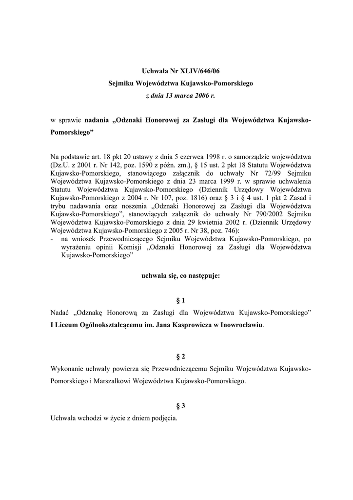 Uchwała Nr XLIV/646/06 Sejmiku Województwa Kujawsko