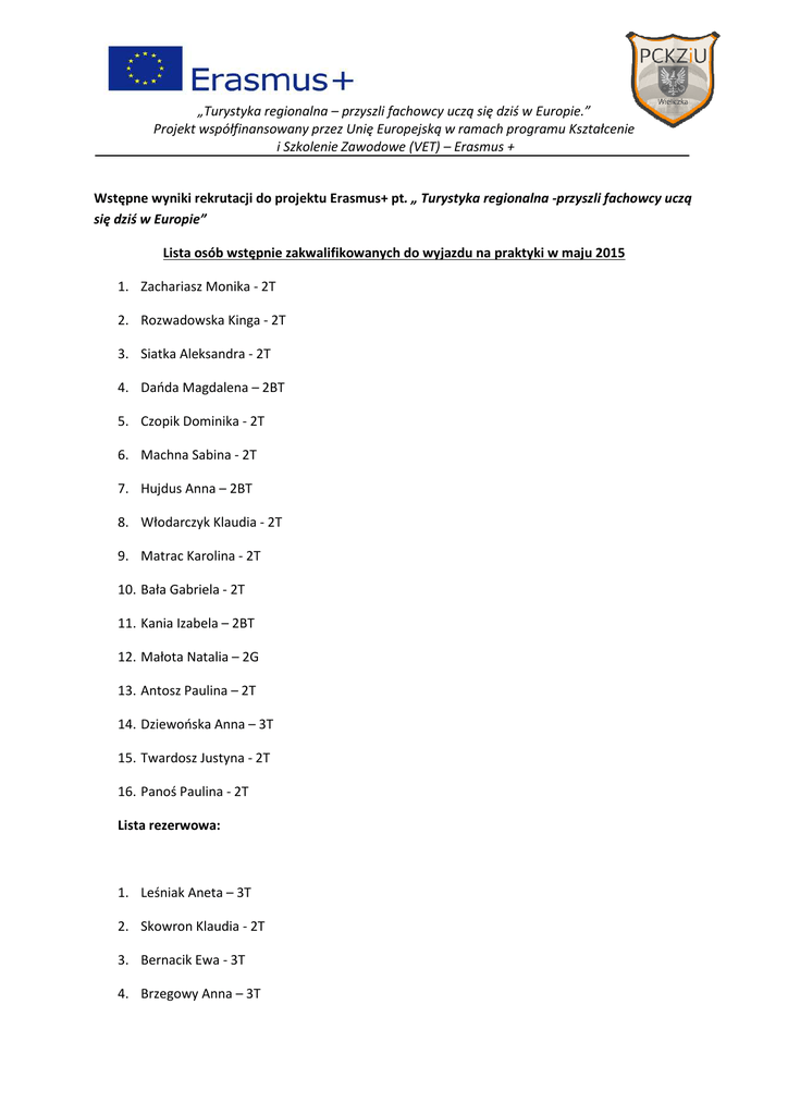 „Turystyka regionalna – przyszli fachowcy uczą się dziś w Europie.” Projekt współfinansowany przez Unię Europejską w ramach programu Kształcenie i Szkolenie Zawodowe (VET) – Erasmus + Wstępne wyniki rekrutacji do projektu Erasmus+ pt. „ Turystyka regionalna -przyszli fachowcy uczą się dziś w Europie” Lista osób wstępnie zakwalifikowanych do wyjazdu na praktyki w maju 2015 1. Zachariasz Monika - 2T 2. Rozwadowska Kinga - 2T 3. Siatka Aleksandra - 2T 4. Dańda Magdalena – 2BT 5. Czopik Dominika - 2T 6. Machna Sabina - 2T 7. Hujdus Anna – 2BT 8. Włodarczyk Klaudia - 2T 9. Matrac Karolina - 2T 10. Bała Gabriela - 2T 11. Kania Izabela – 2BT 12. Małota Natalia – 2G 13. Antosz Paulina – 2T 14. Dziewońska Anna – 3T 15. Twardosz Justyna - 2T 16. Panoś Paulina - 2T Lista rezerwowa: 1. Leśniak Aneta – 3T 2. Skowron Klaudia - 2T 3. Bernacik Ewa - 3T 4. Brzegowy Anna – 3T