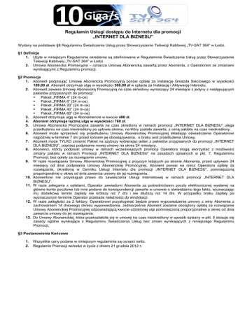 Regulamin Usługi dostępu do Internetu dla promocji „INTERNET DLA BIZNESU” Wydany na podstawie §8 Regulaminu Świadczenia Usług przez Stowarzyszenie Telewizji Kablowej „TV-SAT 364” w Łodzi. §1 Definicje 1. Użyte w niniejszym Regulaminie określenia są zdefiniowane w Regulaminie Świadczenia Usług przez Stowarzyszenie Telewizji Kablowej „TV-SAT 364” w Łodzi. 2. Umowa Abonencka Promocyjna – oznacza Umowę Abonencką zawartą przez Abonenta, z Operatorem ze zmianami wynikającymi z Regulaminu promocji. §2 Promocja 1. Abonent podpisując Umowę Abonencką Promocyjną ponosi opłatę za instalację Gniazda Sieciowego w wysokości 100,00 zł. Abonent otrzymuje ulgę w wysokości 300,00 zł w opłacie za Instalację i Aktywację Internetu. 2. Abonent zawiera Umowę Abonencką Promocyjną na czas określony wynoszący 24 miesiące z jedyny z następujących pakietów przypisanych do promocji: Pakiet „FIRMA 4” (24 m-ce) Pakiet „FIRMA 6” (24 m-ce) Pakiet „FIRMA 20” (24 m-ce) Pakiet „FIRMA 40” (24 m-ce) Pakiet „FIRMA 60” (24 m-ce) 3. Abonent otrzymuje ulgę w Abonamencie w kwocie 480 zł. 4. Abonent otrzymuje łączną ulgę w wysokości 780 zł. 5. Umowa Abonencka Promocyjna zawarta na czas określony w ramach promocji „INTERNET DLA BIZNESU” ulega przedłużeniu na czas nieokreślony po upływie okresu, na który została zawarta, z ceną pakietu na czas nieokreślony. 6. Abonent może sprzeciwić się przedłużeniu Umowy Abonenckiej Promocyjnej składając oświadczenie Operatorowi najpóźniej w terminie 7 dni przed końcem jej obowiązywania, o braku woli przedłużenia Umowy. 7. Abonent może TYLKO zmienić Pakiet na szybszy wybierając jeden z pakietów przypisanych do promocji „INTERNET DLA BIZNESU”, poprzez podpisanie nowej umowy na okres 24 miesięcy. 8. Abonenci, którzy podpisali umowy w ramach wcześniejszych promocji Operatora mogą skorzystać z możliwości zmiany pakietu w ramach Promocji „INTERNET DLA BIZNESU” na zasadach opisanych w pkt. 7. Regulaminu Promocji, bez opłaty za rozwiązanie umowy. 9. W razie rozwiązania Umowy Abonenckiej Promocyjnej z przyczyn leżących po stronie Abonenta, przed upływem 24 miesięcy od dnia podpisania Umowy Abonenckiej Promocyjnej, Abonent ponosi na rzecz Operatora opłatę za rozwiązanie, określoną w Cenniku Usługi Internetu dla promocji „INTERNET DLA BIZNESU”, pomniejszoną proporcjonalnie o okres od dnia zawarcia umowy do jej rozwiązania. 10. Abonentowi nie przysługuje prawo do zawieszania Usługi Internetowej w ramach promocji „INTERNET DLA BIZNESU”. 11. W razie zalegania z opłatami, Operator zawiadomi Abonenta za pośrednictwem poczty elektronicznej wysłanej na główne konto pocztowe lub inne podane do korespondencji zawarte w umowie o stwierdzeniu tego faktu, wyznaczając mu dodatkowy termin zapłaty nie krótszy niż 7 dni i nie dłuższy niż 14 dni. W przypadku braku zapłaty po wyznaczonym terminie Operator przekaże należności do windykacji. 12. W razie zaległości za 2 faktury, Operatorowi przysługiwać będzie prawo wypowiedzenia umowy z winy Abonenta z zachowaniem 14 dniowego okresu wypowiedzenia. Jednocześnie Abonent zostanie obciążony opłatą za rozwiązanie Umowy Abonenckiej Promocyjnej odpowiadającą kwocie udzielonej ulgi pomniejszoną proporcjonalnie o okres od dnia zawarcia umowy do jej rozwiązania. 13. Do Umowy Abonenckiej, która przekształciła się w umowę na czas nieokreślony w sposób opisany w pkt. 5 stosuje się zasady ogólne wynikające z Regulaminu Świadczenia Usług bez zmian wynikających z niniejszego Regulaminu Promocji. §3 Postanowienia Końcowe 1. 2. Wszystkie ceny podane w niniejszym regulaminie są cenami netto. Regulamin Promocji wchodzi w życie z dniem 21 grudnia 2012 r.