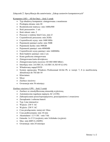 Załącznik 2. Specyfikacja dla zamówienia: „Zakup zestawów komputerowych” Komputer (AIO – All-In-One) – ilość 5 sztuk • Typ obudowy komputera: zintegrowana z monitorem • Przekątna ekranu: min 20 • Rozdzielczość matrycy: min 1600x900 • Ilość procesorów: 1 szt. • Ilość rdzeni: min. 2 • Procesor z rodziny Intel Core, min i3 • Częstotliwość procesora: min 2GHz • Częstotliwość szyny: min 1600 MHz • Pojemność pamięci cache: min 3MB • Pojemność dysku: min 500GB • Pojemność pamięci: min 4096MB • Częstotliwość szyny pamięci: min 1600MHz • Ilość banków pamięci: min 2 szt. • Krata graficzna zintegrowana • Zintegrowana karta dźwiękowa • Zintegrowana karta sieciowa 10/100/1000 Mbit/s • Interfejsy min: 2xUSB 2.0, 1xUSB 3.0, RJ-45 (LAN) • Wbudowany napęd DVD • System operacyjny Windows Professional 64-bit PL w wersji: 7, 8 (z możliwością aktualizacji do 10) lub 10 • Klawiatura • Mysz • Zasilacz sieciowy • Gwarancja min 36 miesięcy Zasilacz sieciowy UPS – ilość 5 sztuk • Zasilacz ze zmodyfikowaną sinusoidą wyjściową • Automatyczna regulacja napięcia AC (AVR) • Zabezpieczanie przeciwprzepięciowe, przeciążeniowe i zwarciowe • Zarządzanie i ochrona baterii • Typ: Line interactive • Wejście: 230 V AC • Wyjście: 230 V AC • Czas przełączania: mniej niż 10ms • Czas podtrzymania: min 10 min • Akumulator: 12 V DC / min 7Ah • Gniazda: 1x C13 (wejście), min 3xSchuko (wyjście) • Moc: min 600VA (360W) • Gwarancja: min 24 miesiące Strona 1 z 2 Informacje dodatkowe dot. Specyfikacji sprzętu: Każde dostarczone urządzenie musi być fabrycznie nowe oraz posiadać co najmniej 3 letnią gwarancję w przypadków komputerów lub 2 letnią gwarancję w przypadku zasilaczy UPS. Gwarancja na sprzęt obejmuje odbiór i dostawę serwisowanego sprzętu w siedzibie zamawiającego. Dostawca zobowiązany jest wymienić sprzęt na nowy o takich samych lub lepszych parametrach po 3 kolejnych naprawach serwisowych nie usuwających objawów awarii. Dla wyspecyfikowanych urządzeń podane parametry są wartościami progowymi (tzn. minimalnymi), każdy sprzęt o parametrach lepszych od wyspecyfikowanych spełnia tą specyfikację. Do każdego urządzenia musi być dołączony mały segregator formatu A5 zawierający wszystkie niezbędne dokumenty takie jak instrukcja obsługi, gwarancja oraz wszystkie nośniki oprogramowania i sterowników. Urządzenia wyspecyfikowane w tym dokumencie powinny ze sobą zgodne i współpracować bez zastrzeżeń. Jeśli akcesoria komputerowe (klawiatura, mysz) są bezprzewodowe, powinny być wyposażone w ogniwa zapewniające ich pracę zaraz po dostarczeniu. Strona 2 z 2