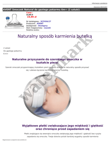 Informacje o produkcie Utworzono 08-03-2017 AVENT Smoczek Natural do gęstego pokarmu 6m+ (2 sztuki) Cena : 21,00 zł 19,99 zł Nr katalogowy : SCF656/27 Producent : AVENT Dostępność : Dostępny Stan magazynowy : wysoki Średnia ocena : er m ar k Naturalny sposób karmienia butelką 2 sztuki Do gęstego pokarmu 6 m+ Naturalne przysysanie do szerokiego smoczka w kształcie piersi Szeroki smoczek przypominający kształtem pierś pozwala dziecku w naturalny sposób przyssać w at się i ułatwia łączenie karmienia piersią i butelką. Wyjątkowe płatki zwiększające jego miękkość i giętkość oraz chroniące przed zapadaniem się Płatki znajdujące się wewnątrz smoczka zwiększają jego miękkość i giętkość bez ryzyka zapadania się smoczka. Twoje dziecko polubi bardziej wygodny sposób karmienia Wygenerowano w programie www.oscGold.com er m ar k . Zaawansowany system antykolkowy z innowacyjnym, podwójnym zaworkiem Innowacyjny, podwójny zawór zmniejsza dyskomfort i częstotliwość występowania kolki, at odprowadzając powietrze do butelki zamiast do brzuszka dziecka w . Smoczek niezawierający bisfenolu A Smoczek został wykonany z silikonu — materiału niezawierającego bisfenolu A, zgodnie z dyrektywą UE (2011/8/EU) er m ar k Informacje o produkcie Różne stopnie wypływu zapewniające najbardziej wygodne karmienie Firma Philips Avent oferuje smoczki o czterech różnych stopniach wypływu, które pozwalają zaspokoić rosnące potrzeby Twojego dziecka. Pamiętaj, że oznaczenia wieku mają charakter orientacyjny, ponieważ dzieci rozwijają się w różnym tempie. Firma Philips Avent oferuje smoczek dla noworodków z 1 dziurką (0M+), smoczek o wolnym wypływie z 2 dziurkami (1M+), smoczek o średnim wypływie z 3 dziurkami (3M+) i smoczek o szybkim wypływie z 4 dziurkami (6M+). Wszystkie smoczki są dostępne w zestawach po dwie sztuki. at Zgodność z butelką do karmienia Philips Avent Natural w Zalecamy używanie smoczków do karmienia Natural wyłącznie z butelkami Natural. Smoczek do gęstych pokarmów — Natural Korzystając ze smoczka do gęstego pokarmu możesz wprowadzać do diety dziecka coraz gęstsze pokarmy, gdy tylko zaczyna ich potrzebować. Zalecamy używanie tego smoczka do gęstszych płynów, takich jak mleko zagęszczane, mleko z ryżem dla niemowląt, mleko zmieszane z jedzeniem dla niemowląt, przeciery czy zupy... Chara kterys tyka Zaworek antykolkowyZaawansowany system zapobiegania kolkom Prędkość wypływuSzybki wypływ DziurkiSzczelina Liczba miesięcy6m+ Wygenerowano w programie www.oscGold.com Specyfikacja techniczna Kraj pochodzenia Anglia er m ar k Zawartość zestawu Miękki smoczek o regulowanym wypływie 2 szt. Miękki smoczek do gęstego pokarmu 2 szt. Smoczek Prędkość wypływu Szczelina at Dziurki Szybki wypływ Liczba miesięcy 6m+ Funkcje w Przysysanie Smoczek Zaworek antykolkowy Łatwe łączenie karmienia piersią i butelką Naturalne przysysanie Wyjątkowe płatki zapewniające wygodę Bardzko miękki i elastyczny smoczek Zaawansowany system zapobiegania kolkom Materiał Smoczek Kształt smoczka Etapy Silikon Nie zawiera bisfenolu A* Wzornictwo Smoczek w kształcie piersi Wyjątkowe płatki zapewniające wygodę Niezwykle szerokie Etapy rozwoju 6-12 miesięcy