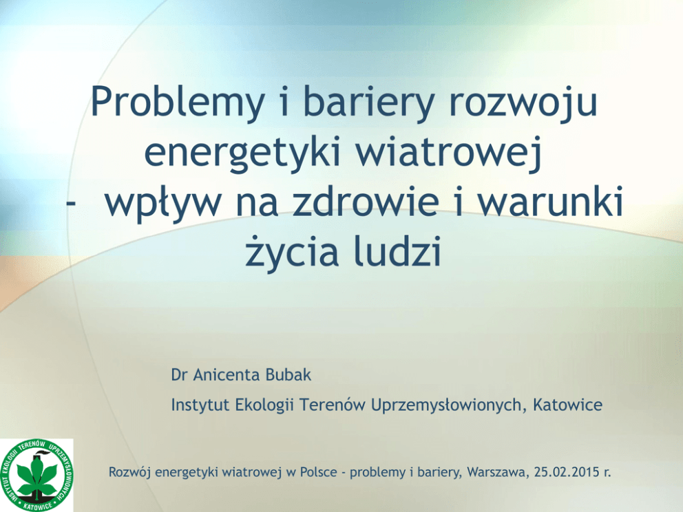 Problemy i bariery rozwoju energetyki wiatrowej - wpływ na zdrowie i warunki życia ludzi Dr Anicenta Bubak Instytut Ekologii Terenów Uprzemysłowionych, Katowice Rozwój energetyki wiatrowej w Polsce - problemy i bariery, Warszawa, 25.02.2015 r. Skomplikowany stan prawny • Ustawa z dnia 3 października 2008 r. o udostępnianiu informacji o środowisku i jego ochronie, udziale społeczeństwa w ochronie środowiska oraz o ocenach oddziaływania na środowisko (t.j. Dz. U. z 2013, poz. 1235, z późn. zm.) • Ustawa z dnia 14 marca 1985 r. o Państwowej Inspekcji Sanitarnej (Dz. U. z 2011 r. Nr 212, poz. 1263, z późn. zm.) • Ustawa z dnia 14 czerwca 1960 r. Kodeks postępowania administracyjnego (t.j. Dz. U. z 2013 r. poz. 267) • Ustawa z dnia 27 marca 2003 r. o planowaniu i zagospodarowaniu przestrzennym (t.j. Dz. U. z 2012 r. Nr 647, poz. 951, z późn. zm.) • Rozporządzenie Ministra Środowiska w sprawie opracowań ekofizjograficznych (Dz. U. z 2002 r. Nr 155, poz. 1298) • Rozporządzenie Rady Ministrów z dnia 9 listopada 2010 r. w sprawie przedsięwzięć mogących znacząco oddziaływać na środowisko (Dz. U. z 2010 r. Nr 213, poz. 1397, z późn. zm.) stan na 25 lutego 2015 r. Niedostateczne informacje o oddziaływaniu na zdrowie ludzi • definicja - ilekroć w ustawie jest mowa o oddziaływaniu na środowisko rozumie się przez to również oddziaływanie na zdrowie ludzi - art. 3, pkt. 2, • kryteria decydujące o konieczności sporządzenie prognozy oddziaływania na środowisko, m.in. prawdopodobieństwo wystąpienia ryzyka dla zdrowia ludzi - art. 49, pkt 2, lit. c, • prognoza OŚ – analiza znaczących oddziaływań na ludzi – art. 51 ust 2, pkt 2, lit. e, • bezpośredni i pośredni wpływ danego przedsięwzięcia na środowisko oraz zdrowie i warunki życia ludzi – art. 62, ust 1, pkt 1, lit. a, • usytuowanie przedsięwzięcia - art. 63, ust 1, pkt 3 - gęstość zaludnienia (lit. h) oraz uzdrowiska i obszary ochrony uzdrowiskowej (lit. j) • zasięg oddziaływania – obszar geograficzny i liczby ludności, na którą przedsięwzięcie może oddziaływać – art. 63, ust 1, pkt 3, lit. a, • uzasadnienie proponowanego wariantu, ze wskazaniem jego oddziaływania na środowisko, w szczególności na ludzi - art. 66, ust 1, pkt. 1, lit. a, • analizę możliwych konfliktów społecznych związanych z planowanym przedsięwzięciem - art. 66, ust 1, pkt. 15 Niedocenianie ustawy o planowaniu i zagospodarowaniu przestrzennym • W planowaniu i zagospodarowaniu przestrzennym uwzględnia się wymagania ochrony zdrowia oraz bezpieczeństwa ludzi i mienia, a także potrzeby osób niepełnosprawnych (art. 1 ust. 2 pkt 5) miejscowy plan zagospodarowania przestrzennego (mpzg), • W studium studium uwarunkowań i kierunków zagospodarowania przestrzennego uwzględnia się uwarunkowania wynikające z: • warunków i jakości życia mieszkańców, w tym ochrony ich zdrowia • zagrożenia bezpieczeństwa ludności i jej mienia (art. 10 ust. 1 pkt 5 i 6) • Opracowanie ekofizjograficzne: • • podstawowe, problemowe – opisujące elementy przyrodnicze, zagrożenia środowiska i zdrowia ludzi. Problemy z planowaniem przestrzennym - procedura pomysł na wprowadzenie zmian do planu od inwestora lub kilku inwestorów, inicjowanie opracowania dokumentu przez władze samorządu lokalnego, środki budżetu gminy nie przewidują opracowania dokumentu dla potrzeb prywatnego inwestora, udział inwestora odczytywany jako ingerencja w niezależny dokument prawa miejscowego, dyskusja i uchwalanie dokumentu przez radnych gminy, posiadanie tytułu prawnego do gruntu, dla którego głosowana jest zmiana planu – stronniczość. Problemy z planowaniem przestrzennym - interesariusze gmina, rada gminy, inwestor, organy opiniujące i uzgadniające, społeczeństwo, organizacje pozarządowe, architekci (firmy konsultingowe), eksperci (brak specjalistów z ocen oddziaływania na zdrowie ludzi), specjaliści z dziedziny komunikacji społecznej. Przeszkody definiowane przez mieszkańców • Informacje o wpływie na zdrowie: − − − − − niezrozumiałe, zawiłe źle przedstawione, zaciemnione przez skomplikowany raport o środowisku, powinny być wydzielone w odrębne opracowanie, • Brak wyraźnego wskazania odległości oddziaływania od siedzib ludzkich • Brak prostych informacji o różnych rodzajach dźwięków i ich wpływie na zdrowie • Duży nacisk na dowody na temat wpływu na zwierzęta gospodarskie • Obawy o utratę dochodów z rolnictwa • Niedostateczne informacje na temat ograniczeń korzystania z terenu (grunty rolne, mieszkaniowe) Dziękuję za uwagę