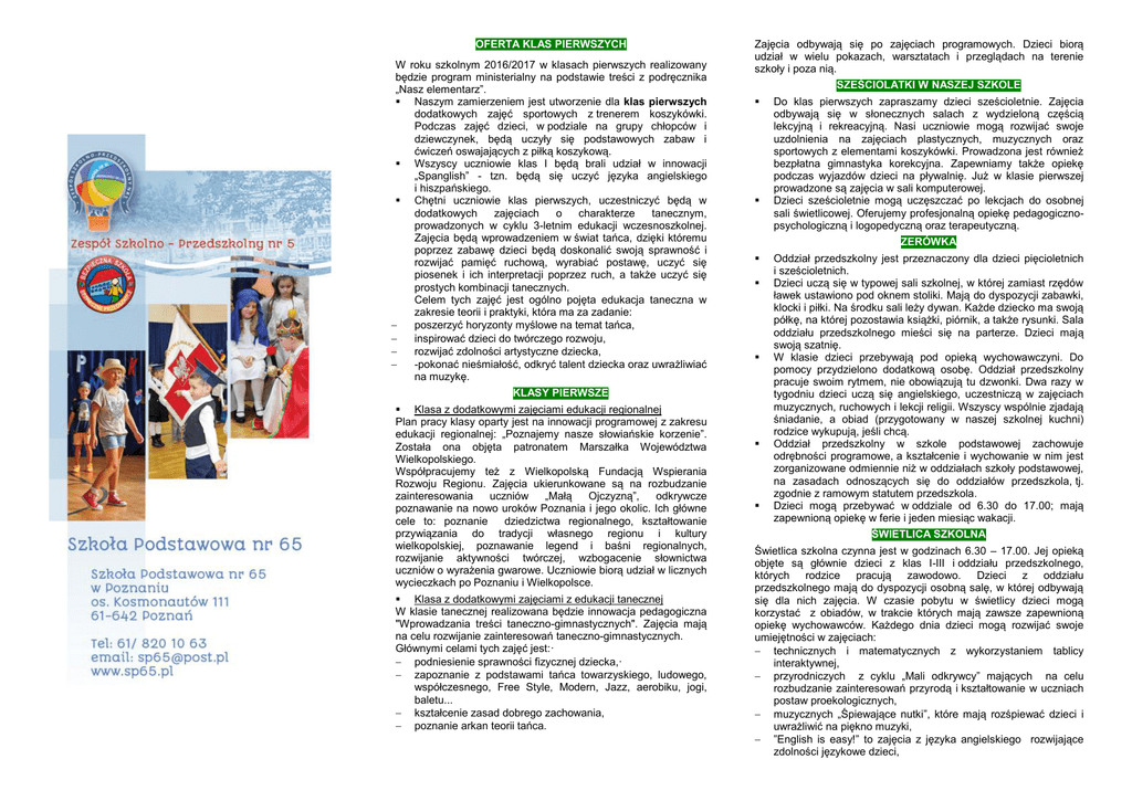 OFERTA KLAS PIERWSZYCH W roku szkolnym 2016/2017 w klasach pierwszych realizowany będzie program ministerialny na podstawie treści z podręcznika „Nasz elementarz”. Naszym zamierzeniem jest utworzenie dla klas pierwszych dodatkowych zajęć sportowych z trenerem koszykówki. Podczas zajęć dzieci, w podziale na grupy chłopców i dziewczynek, będą uczyły się podstawowych zabaw i ćwiczeń oswajających z piłką koszykową. Wszyscy uczniowie klas I będą brali udział w innowacji „Spanglish” - tzn. będą się uczyć języka angielskiego i hiszpańskiego. Chętni uczniowie klas pierwszych, uczestniczyć będą w dodatkowych zajęciach o charakterze tanecznym, prowadzonych w cyklu 3-letnim edukacji wczesnoszkolnej. Zajęcia będą wprowadzeniem w świat tańca, dzięki któremu poprzez zabawę dzieci będą doskonalić swoją sprawność i rozwijać pamięć ruchową, wyrabiać postawę, uczyć się piosenek i ich interpretacji poprzez ruch, a także uczyć się prostych kombinacji tanecznych. Celem tych zajęć jest ogólno pojęta edukacja taneczna w zakresie teorii i praktyki, która ma za zadanie: poszerzyć horyzonty myślowe na temat tańca, inspirować dzieci do twórczego rozwoju, rozwijać zdolności artystyczne dziecka, -pokonać nieśmiałość, odkryć talent dziecka oraz uwrażliwiać na muzykę. Zajęcia odbywają się po zajęciach programowych. Dzieci biorą udział w wielu pokazach, warsztatach i przeglądach na terenie szkoły i poza nią. SZEŚCIOLATKI W NASZEJ SZKOLE ZERÓWKA KLASY PIERWSZE Klasa z dodatkowymi zajęciami edukacji regionalnej Plan pracy klasy oparty jest na innowacji programowej z zakresu edukacji regionalnej: „Poznajemy nasze słowiańskie korzenie”. Została ona objęta patronatem Marszałka Województwa Wielkopolskiego. Współpracujemy też z Wielkopolską Fundacją Wspierania Rozwoju Regionu. Zajęcia ukierunkowane są na rozbudzanie zainteresowania uczniów „Małą Ojczyzną”, odkrywcze poznawanie na nowo uroków Poznania i jego okolic. Ich główne cele to: poznanie dziedzictwa regionalnego, kształtowanie przywiązania do tradycji własnego regionu i kultury wielkopolskiej, poznawanie legend i baśni regionalnych, rozwijanie aktywności twórczej, wzbogacenie słownictwa uczniów o wyrażenia gwarowe. Uczniowie biorą udział w licznych wycieczkach po Poznaniu i Wielkopolsce. Klasa z dodatkowymi zajęciami z edukacji tanecznej W klasie tanecznej realizowana będzie innowacja pedagogiczna "Wprowadzania treści taneczno-gimnastycznych". Zajęcia mają na celu rozwijanie zainteresowań taneczno-gimnastycznych. Głównymi celami tych zajęć jest:· podniesienie sprawności fizycznej dziecka,· zapoznanie z podstawami tańca towarzyskiego, ludowego, współczesnego, Free Style, Modern, Jazz, aerobiku, jogi, baletu... kształcenie zasad dobrego zachowania, poznanie arkan teorii tańca. Do klas pierwszych zapraszamy dzieci sześcioletnie. Zajęcia odbywają się w słonecznych salach z wydzieloną częścią lekcyjną i rekreacyjną. Nasi uczniowie mogą rozwijać swoje uzdolnienia na zajęciach plastycznych, muzycznych oraz sportowych z elementami koszykówki. Prowadzona jest również bezpłatna gimnastyka korekcyjna. Zapewniamy także opiekę podczas wyjazdów dzieci na pływalnię. Już w klasie pierwszej prowadzone są zajęcia w sali komputerowej. Dzieci sześcioletnie mogą uczęszczać po lekcjach do osobnej sali świetlicowej. Oferujemy profesjonalną opiekę pedagogicznopsychologiczną i logopedyczną oraz terapeutyczną. Oddział przedszkolny jest przeznaczony dla dzieci pięcioletnich i sześcioletnich. Dzieci uczą się w typowej sali szkolnej, w której zamiast rzędów ławek ustawiono pod oknem stoliki. Mają do dyspozycji zabawki, klocki i piłki. Na środku sali leży dywan. Każde dziecko ma swoją półkę, na której pozostawia książki, piórnik, a także rysunki. Sala oddziału przedszkolnego mieści się na parterze. Dzieci mają swoją szatnię. W klasie dzieci przebywają pod opieką wychowawczyni. Do pomocy przydzielono dodatkową osobę. Oddział przedszkolny pracuje swoim rytmem, nie obowiązują tu dzwonki. Dwa razy w tygodniu dzieci uczą się angielskiego, uczestniczą w zajęciach muzycznych, ruchowych i lekcji religii. Wszyscy wspólnie zjadają śniadanie, a obiad (przygotowany w naszej szkolnej kuchni) rodzice wykupują, jeśli chcą. Oddział przedszkolny w szkole podstawowej zachowuje odrębności programowe, a kształcenie i wychowanie w nim jest zorganizowane odmiennie niż w oddziałach szkoły podstawowej, na zasadach odnoszących się do oddziałów przedszkola, tj. zgodnie z ramowym statutem przedszkola. Dzieci mogą przebywać w oddziale od 6.30 do 17.00; mają zapewnioną opiekę w ferie i jeden miesiąc wakacji. ŚWIETLICA SZKOLNA Świetlica szkolna czynna jest w godzinach 6.30 – 17.00. Jej opieką objęte są głównie dzieci z klas I-III i oddziału przedszkolnego, których rodzice pracują zawodowo. Dzieci z oddziału przedszkolnego mają do dyspozycji osobną salę, w której odbywają się dla nich zajęcia. W czasie pobytu w świetlicy dzieci mogą korzystać z obiadów, w trakcie których mają zawsze zapewnioną opiekę wychowawców. Każdego dnia dzieci mogą rozwijać swoje umiejętności w zajęciach: technicznych i matematycznych z wykorzystaniem tablicy interaktywnej, przyrodniczych z cyklu „Mali odkrywcy” mających na celu rozbudzanie zainteresowań przyrodą i kształtowanie w uczniach postaw proekologicznych, muzycznych „Śpiewające nutki”, które mają rozśpiewać dzieci i uwrażliwić na piękno muzyki, ”English is easy!” to zajęcia z języka angielskiego rozwijające zdolności językowe dzieci, sportowych doskonalących motorykę i wspierające rozwój ruchowy dzieci poprzez gry i zabawy, warsztaty plastyczne rozwijające zdolności manualne i umożliwiające poznawanie różnych technik plastycznych, zabawy z chustą animacyjną integrujące g