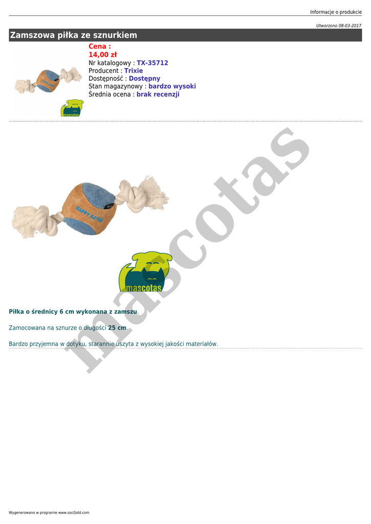 Informacje o produkcie Utworzono 08-03-2017 Zamszowa piłka ze sznurkiem Cena : 14,00 zł m as co ta s Nr katalogowy : TX-35712 Producent : Trixie Dostępność : Dostępny Stan magazynowy : bardzo wysoki Średnia ocena : brak recenzji Piłka o średnicy 6 cm wykonana z zamszu. Zamocowana na sznurze o długości 25 cm. Bardzo przyjemna w dotyku, starannie uszyta z wysokiej jakości materiałów. Wygenerowano w programie www.oscGold.com