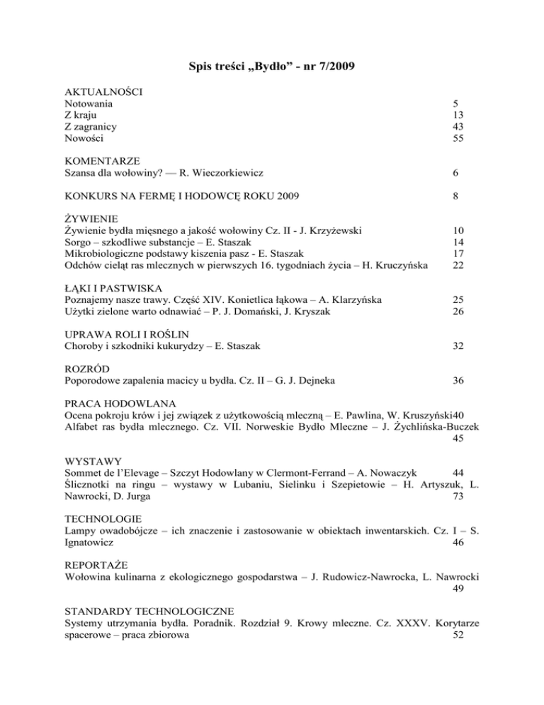 Spis treści „Bydło” - nr 7/2009 AKTUALNOŚCI Notowania Z kraju Z zagranicy Nowości 5 13 43 55 KOMENTARZE Szansa dla wołowiny? –– R. Wieczorkiewicz 6 KONKURS NA FERMĘ I HODOWCĘ ROKU 2009 8 śYWIENIE śywienie bydła mięsnego a jakość wołowiny Cz. II - J. KrzyŜewski Sorgo – szkodliwe substancje – E. Staszak Mikrobiologiczne podstawy kiszenia pasz - E. Staszak Odchów cieląt ras mlecznych w pierwszych 16. tygodniach Ŝycia – H. Kruczyńska 10 14 17 22 ŁĄKI I PASTWISKA Poznajemy nasze trawy. Część XIV. Konietlica łąkowa – A. Klarzyńska UŜytki zielone warto odnawiać – P. J. Domański, J. Kryszak 25 26 UPRAWA ROLI I ROŚLIN Choroby i szkodniki kukurydzy – E. Staszak 32 ROZRÓD Poporodowe zapalenia macicy u bydła. Cz. II – G. J. Dejneka 36 PRACA HODOWLANA Ocena pokroju krów i jej związek z uŜytkowością mleczną – E. Pawlina, W. Kruszyński40 Alfabet ras bydła mlecznego. Cz. VII. Norweskie Bydło Mleczne – J. śychlińska-Buczek 45 WYSTAWY Sommet de l’Elevage – Szczyt Hodowlany w Clermont-Ferrand – A. Nowaczyk 44 Ślicznotki na ringu – wystawy w Lubaniu, Sielinku i Szepietowie – H. Artyszuk, L. Nawrocki, D. Jurga 73 TECHNOLOGIE Lampy owadobójcze – ich znaczenie i zastosowanie w obiektach inwentarskich. Cz. I – S. Ignatowicz 46 REPORTAśE Wołowina kulinarna z ekologicznego gospodarstwa – J. Rudowicz-Nawrocka, L. Nawrocki 49 STANDARDY TECHNOLOGICZNE Systemy utrzymania bydła. Poradnik. Rozdział 9. Krowy mleczne. Cz. XXXV. Korytarze spacerowe – praca zbiorowa 52 BUDOWNICTWO INWENTARSKIE Budujemy nowoczesną oborę. Cz. 9c. Sposoby realizacji doświetlenia obór – R. Hübner 56 PRZEPISY PRAWNE Cross compliance – zwierzęta takŜe „pod lupą” – D. Rogoźnicki, P. Guliński 59 MECHANIZACJA Rozstrząsacz firmy RECK – to jest to? – M. Piotrkowski Opryskiwacze polowe. Cz. V. Belki opryskowe – B. Sobkowiak 62 64 DOBROSTAN Zachowanie się krów na pastwisku – W. Empel Zapobieganie stresowi cieplnemu krów – A. M. Marciniak 67 70 WETERYNARIA PoraŜenie poporodowe – P. Brodzki Słońce moŜe być groźne takŜe dla krów – K. Chmielecka 76 79 PRZEPISY KULINARNE Cannelloni z nadzieniem mięsno-serowym – R. Chojnacka 82 DODATEK WETERYNARYJNY Czynniki wpływające na liczbę komórek somatycznych – S. Winnicki Choroba niebieskiego języka - H. Frąckowiak II V Na okładce: Byk „Felix” rasy uckermärker z Gospodarstwa Ekologicznego „Talhaus” Państwa GraŜyny i Klausa Wallefeld – Rakowo, woj. zachodniopomorskie Projekt okładki: Katarzyna DroŜdŜyńska Fot. Lech Nawrocki