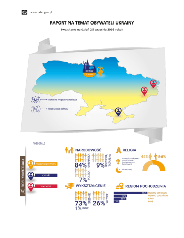 www.udsc.gov.pl RAPORT NA TEMAT OBYWATELI UKRAINY (wg stanu na dzień 25 września 2016 roku) www.udsc.gov.pl OCHRONA MIĘDZYNARODOWA 1. Wnioski (dane aktualizowane raz w tygodniu) Tabela 1: Liczba obywateli Ukrainy, którzy w latach 2003-2016 złożyli wniosek o udzielenie ochrony międzynarodowej w RP oraz wznowienia postępowania. OBYWATELSTWO POZOSTAŁE 2003 86 6820 2004 72 8007 2005 84 6776 2006 60 7033 2007 55 9993 2008 40 8477 2009 36 10551 2010 45 6489 2011 67 6820 2012 72 10681 2013 46 15104 2014 2318 5877 2015 2305 10020 2016 998 8618 suma 6284 121266 SUMA 6906 8079 6860 7093 10048 8517 10587 6534 6887 10753 15150 8195 12325 9616 127550 UKRAINA 16000 15104 14000 12000 9993 10000 8000 8007 6820 67767033 10551 10681 10020 8477 8618 6489 6820 6000 5877 4000 2000 0 86 72 84 60 55 40 20032004 2005 2006 2007 2008 2318 2305 36 45 2009 2010 Ukraina 67 72 46 998 2011 2012 2013 2014 2015 2016 pozostałe Pod względem liczby składanych wniosków o ochronę w 2016 roku, Ukraina znajduje się obecnie na drugim miejscu, za Rosją. W 2014 r., liczba obywateli Ukrainy ubiegających się o nadanie statusu uchodźcy w 2014 roku stanowiła 34% ogólnej liczby ubiegających się o nadanie tego statusu, a w 2015 r. - 19% ogólnej liczby osób objętych tymi wnioskami. Wg stanu na dzień 25 września 2016 r., liczba obywateli Ukrainy ubiegających się o udzielenie ochrony międzynarodowej w 2016 stanowiła 10% ogólnej liczby wnioskodawców. Według stanu na 25 września 2016 r., Szef Urzędu do Spraw Cudzoziemców prowadzi 505 postępowań w sprawie o udzielenie ochrony wobec obywateli Ukrainy. www.udsc.gov.pl Według stanu na dzień 25 września 2016 r., pomocą socjalną Szefa Urzędu do Spraw Cudzoziemców objętych jest 1 472 obywatela Ukrainy. Liczba obywateli Ukrainy, którzy w latch 2012 - 2016 złożyli wniosek o udzielenie ochrony międzynarodowej w RP (w okresie do 25.09.2016). 350 308 300 275 269 246 242 250 234 109 120 138 129 0 11 9 1.I. 2 132 4 3 II. 45 III. 11 4 2 IV. 2012 V. 3 2013 VI. 6 47 2 2 3 VII. 2014 188 6 3 VIII. 2015 153 144 115 137 112 88 11 3 220 181 97 100 50 133 231 188 161 150 251 219 205 200 275 62 IX. 12 3 3 0 6 X. 6 XI. 4 XII. 10 2016 *od 2015 r. do wartości miesięcznych wliczone są także wznowienia postępowań 2. Decyzje (dane aktualizowane raz w tygodniu) 2013 r. W 2013 r. w sprawach o nadanie statusu uchodźcy na terytorium Rzeczypospolitej Polskiej wobec obywateli Ukrainy wydano: 2 decyzje o nadaniu statusu uchodźcy, 5 decyzji o udzieleniu ochrony uzupełniającej, 8 decyzji o udzieleniu zgody na pobyt tolerowany, 39 decyzji negatywnych, 26 decyzji o umorzeniu postępowania lub pozostawieniu wniosku bez rozpoznania. 2014 r. W stosunku do osób, które złożyły wniosek w 2013 roku w sprawach o nadanie statusu uchodźcy na terytorium Rzeczypospolitej Polskiej, wobec obywateli Ukrainy, Szef UdSC wydał: 1 decyzję o umorzeniu postępowania, 7 decyzji negatywnych. W stosunku do osób, które złożyły wniosek w sprawach o nadanie statusu uchodźcy na terytorium Rzeczypospolitej Polskiej, wobec obywateli Ukrainy, Szef UdSC wydał: 372 decyzje o umorzeniu postępowania, 645 decyzji negatywnych, www.udsc.gov.pl 6 decyzji o udzieleniu ochrony uzupełniającej, 11 decyzji o udzieleniu zgody na pobyt tolerowany. 2015 r. W stosunku do osób, które złożyły wniosek w sprawach o udzielenie ochrony międzynarodowej na terytorium Rzeczypospolitej Polskiej, wobec obywateli Ukrainy, Szef UdSC wydał: 764 decyzje o umorzeniu postępowania, 1 775 decyzji negatywnych, 6 decyzji o udzieleniu zgody na pobyt tolerowany, 6 decyzji o udzieleniu ochrony uzupełniającej. W stosunku do osób, które złożyły wniosek w sprawach o udzielenie ochrony międzynarodowej na terytorium Rzeczypospolitej Polskiej, wobec obywateli Ukrainy, Rada do Spraw Uchodźców wydała (decyzje pozytywne): 2 decyzje o nadaniu statusu uchodźcy w RP, 18 decyzji o udzieleniu ochrony uzupełniającej. 2016 r. (od 1.01.2016 r. do 25.09.2016 r.) W stosunku do osób, które złożyły wniosek w sprawach, o udzielenie ochrony międzynarodowej na terytorium Rzeczypospolitej Polskiej, wobec obywateli Ukrainy, Szef UdSC wydał: 357 decyzji o umorzeniu postępowania, 548 decyzji negatywnych, 31 decyzji o udzieleniu ochrony uzupełniającej, 1 decyzja o udzieleniu zgody na pobyt tolerowany. W stosunku do osób, które złożyły wniosek w sprawach o udzielenie ochrony międzynarodowej na terytorium Rzeczypospolitej Polskiej, wobec obywateli Ukrainy, Rada do Spraw Uchodźców wydała (decyzje pozytywne): 6 decyzji o udzieleniu ochrony uzupełniającej, 16 decyzji o nadaniu statusu uchodźcy. 3. Profil wnioskodawców (dane aktualizowane raz w miesiącu) Profil obywateli wnioskodawców opracowano w oparciu o informacje uzyskane od obywateli Ukrainy ubiegających się o udzielenie ochrony międzynarodowej (wg stanu spraw będących w toku na dzień 01.08.2016 r. zebrano informacje dot. 102 wniosków) Narodowość: ukraińska (ok. 84%) www.udsc.gov.pl pozostałe – tj. rosyjska, tatarska (ok. 9%), polska (ok. 7%). Religia - większość osób jako wyznanie podaje chrześcijaństwo (prawosławie, protestantyzm, katolicyzm) lub islam (11%). Region pochodzenia Osoby ubiegające się o ochronę międzynarodową w Polsce pochodzą głównie z obwodów: donieckiego (ok. 56%) i ługańskiego (ok. 19%), a także z Krymu (ok. 18%). O udzielenie ochrony międzynarodowej ubiegają się również osoby z obwodów: dniepropietrowskiego, czerkaskiego, kijowskiego, lwowskiego, iwano-frankowskiego, sumskiego, zaporoskiego. Charakterystyka demograficzna Obecnie z przedmiotowymi wnioskami występuje więcej mężczyzn (ok. 56%), niż kobiet (44%), jednakże należy wskazać, iż ww. wnioski (w więcej niż w połowie przypadków) są składane również w imieniu pozostałych członków rodziny (współmałżonka, dzieci). Stan cywilny oraz status rodzinny wnioskodawców kształtują się różnie. Wiek zainteresowanych to od 19 d