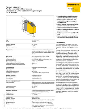 Kontrola przepływu For the connection of flow sensors Urządzenie IO-Link z wyjściami tranzystorowymi FM-IM-3UP63X ■ Wyjścia tranzystorowe sygnalizujące stan przepływu, temperatury i błędy ■ Nastawa punktu przełączania, brak możliwości nauki granic przepływu (szybka nauka) ■ Bargraf diodowy wskazujący prędkość przepływu i temperaturę medium ■ Kontrola zakresu pracy i wyświetlania ■ Detekcja przerwy w obwodzie i zwarcia po stronie czujnika ■ Tryb pracy ze standardowym IO lub IOLink ■ Parametryzacja za pomocą przycisku lub software'u obsługującego IO-Link Typ Nr kat. FM-IM-3UP63X 7525100 Napięcie zasilania Pobór mocy Prąd bez obciążenia I0 20… 30VDC < 4.5 W ð 63 mA Tryby nauki Szybka nauka, nastawa min/maks. Tryby nauki z funkcją monitoring DeltaFlow (tryby nauki są opuszczane automatycznie przy zmianie prędkości przepływu). Flow speed Prędkość przepływu Temperatura medium Repeatability flow rate Repeatability media temperature Measuring accuracy media temperature Switchpoint hysteresis media temperature [%] po nastawach min. i maks. (stałych) % po szybkiej nauce (stałe) [°C] z czasowo załączanym przyciskiem SET typical ± 1 % (pełnej skali) typical ± 1 K typical ± 7 K 2K Funkcja wejścia Napięcie czujnika Prąd czujnika Ograniczenie prądu czujnika Częstotliwość pomiarowa Podłączenie czujników przepływu ð 15 VDC ð 35 mA ok. 110 mA 5 Hz (200 ms z filtrem software'owym) Kontrola przepływu Kontrola temperatury Kontrola błędu wyjście tranzystorowe wyjście tranzystorowe wyjście tranzystorowe Charakterystyka przełączania Stan przełączania PNP Parametryzacja stanu aktywnego niskiego/wysokiego (tranzystorowe wyjście błędu monitoruje jedynie stan aktywny niski) 20…30 VDC 100 mA Napięcie przełączania Prąd przełączania Edition • 2016-11-10T05:13:58+01:00 Połączenia elektryczne Tryb połączenia Przekrój zacisku Komunikacja Prędkość transmisji Fizyka transmisji Kanał komunikacja Tryby komunikacji 1/4 5-pinowy zdejmowalny terminal zaciskowy zabezpieczony przed odwrotną polaryzacją połączenie śrubowe 1.5…2.5mm² Zasada działania Czujniki przepływu nie Ex serii FCS (zanurzeniowe) i FCI (inline) mogą pracować z zewnętrznym przetwornikiem sygnałowym FMIM. Kontroler przepływu posiada cztery diody LED stanu, jak również 10-segmentowy bargraf. Użytkownik ma dostęp do software'owych opcji diagnostycznych (np. kontrola przerwy w obwodzie i zwarcia po stronie czujnika). Ponadto możliwe jest monitorowanie przepływu i temperatury medium we wcześniej określonym zakresie pracy i wyświetlania. Funkcja szybkiej nauki pomaga ustawić punkt przełączania bez programowania dolnej i górnej granicy przełączania. Dzięki pracy w oparciu o zasadę kalorymetryczną czujniki nie tylko prowadzą detekcję przepływu, ale również temperatury medium. Kontroler przepływu mogą pracować zarówno w trybie IO-Link (IOL), jak również standardowym IO (SIO) ze zintegrowanym interfejsem IO-Link. W trybie SIO wyjścia dwustanowe pracują w tradycyjny sposób. W trybie IOL prądowy sygnał procesowy jest przesyłany cyklicznie w postaci 10-bitowej wartości. Parametryzacja jest inicjowana za pomocą przycisku lub oprogramowania obsługującego interfejs IO-Link Istotna część parametryzacji realizowana jest za pomocą narzędzi opartych o pliki DTM lub IODD w ramach FDT środowiska PACTware lub za pomocą acyklicznego sterowania za pomocą ORDO (On-Request Data Objects). Sepc. IO-Link 1,0 38.4 kbps (COM 2) Transmisja za pomocą przewodu 3-żyłowego (PHY 2) Clamp 12 and via front panel jack COM (PC) Narzędzie inżynierskie bazujące na FDT / DTM, IODD. Acykliczna komunikacja za pomocą ORDO (On-Request Data Objects) Hans Turck GmbH & Co.KG ñ D-45472 Mülheim an der Ruhr ñ Witzlebenstraße 7 ñ Tel. 0208 4952-0 ñ Fax 0208 4952-264 ñ [email protected] ñ www.turck.com Kontrola przepływu For the connection of flow sensors Urządzenie IO-Link z wyjściami tranzystorowymi FM-IM-3UP63X CE, C-UL U.S. przedłożone zgodnie z NE21 Obudowa Wymiary Materiał obudowy Temperatura pracy Typ montażu Klasa ochrony terminal zaciskowy 89 x 110 x 27 mm poliwęglan/ABS -25 …+70 °C Instalacja na szynie DIN i płycie montażowej IP20 Edition • 2016-11-10T05:13:58+01:00 Certyfikaty Kompatybilność elektromagnetyczna (EMC) 2/4 Hans Turck GmbH & Co.KG ñ D-45472 Mülheim an der Ruhr ñ Witzlebenstraße 7 ñ Tel. 0208 4952-0 ñ Fax 0208 4952-264 ñ [email protected] ñ www.turck.com Kontrola przepływu For the connection of flow sensors Urządzenie IO-Link z wyjściami tranzystorowymi FM-IM-3UP63X Uwaga Schemat podłączenia kontroler przepływu FM-IM-3UP63X Nr katalogowy 7525100 Uwaga Schemat podłączenia Dostępne opcjonalnie: Linia komunikacyjna IO-Link IOL-COM/3M Połączenie między FM-IM (port PC) i urządzeniem nadrzędnym IO-Link Edition • 2016-11-10T05:13:58+01:00 Nr katalogowy 7525110 3/4 Hans Turck GmbH & Co.KG ñ D-45472 Mülheim an der Ruhr ñ Witzlebenstraße 7 ñ Tel. 0208 4952-0 ñ Fax 0208 4952-264 ñ [email protected] ñ www.turck.com Kontrola przepływu For the connection of flow sensors Urządzenie IO-Link z wyjściami tranzystorowymi FM-IM-3UP63X Wskaźniki LED LED Kolor Stan Opis Pwr zielone zał. Zał. napięcie zasilania Urządzenie gotowe do pracy miganie Zał. napięcie zasilania aktywne łącze IO-Link (odwrócone miganie; T zał. 900 ms i T wył. 100 ms) Przepływ żółty wył. Wyjście dwustanowe przepływu [niski] zał. Wyjście dwustanowe przepływu [wysoki] miganie Tryb Teach / wyświetlacz danych diagnostycznych specyfikacja znajduje się w instrukcji Temp żółty wył. Wyjście dwustanowe temperatury medium [niski] zał. Wyjście dwustanowe temperatury medium [wysoki] miganie Tryb Teach / wyświetlacz danych diagnostycznych specyfikacja znajduje się w instrukcji Błąd czerwony wył. Wyjście dwustanowe błędu [wysoki] zał. Wyjście dwustanowe przepływu [niski] (sposób sygna