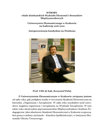 WYBORY władz dziekańskich Wydziału Ekonomii i Stosunków Międzynarodowych Uniwersytetu Ekonomicznego w Krakowie na kadencję 2016-2020 Autoprezentacja kandydata na Dziekana Prof. UEK dr hab. Krzysztof Firlej Z Uniwersytetem Ekonomicznym w Krakowie związany jestem od 1980 roku, gdy podjąłem studia w ówczesnej Akademii Ekonomicznej na kierunku „Organizacja i Zarządzanie. W 1985 roku uzyskałem tytuł zawodowy magistra organizacji i zarządzania na Wydziale Zarządzania. W tym także roku ukończyłem pięciosemestralne Międzywydziałowe Studium Pedagogiczne. Jako absolwent Akademii Ekonomicznej w Krakowie rozpocząłem pracę w jednej z jej katedr – Katedrze Spółdzielczości, w Instytucie Ekonomiki Obrotu Towarowego. Moje badania naukowe rozpocząłem z dniem zatrudnienia na stanowisku asystenta stażysty pracami na temat funkcjonowania ruchu spółdzielczego. Jako młody adept nauki byłem wprowadzany w arkana wiedzy z zakresu ewolucji przedsiębiorstw spółdzielczych, ich funkcjonowania oraz możliwości rozwojowych. Praktyczne poznawanie przedsiębiorstw spółdzielczych skłoniło mnie do przeprowadzenia badań w zakresie ich koncepcji rozwojowych, czego efektem stały się publikacje związane z tematyką spółdzielczą. Z początkiem lat dziewięćdziesiątych zostałem włączony do grupy osób zespołu badawczego opracowującego raporty o stanie funkcjonowania polskiej gospodarki. /Raport o stanie rolnictwa polskiego – 1989 r.; Przemiany rolnictwa polskiego w 1990 r.,/. Moja działalność naukowa skoncentrowana była na dwóch obszarach tematycznych: agrobiznesie i funkcjonowaniu przemysłu spożywczego. Interesowały mnie zagadnienia spółdzielczości zarówno od strony teoretycznej i praktycznej, czego wymiernym efektem było powierzenie mi w 1995 roku funkcji Vice - przewodniczącego Rady Nadzorczej Gastronomiczno – Turystycznej Spółdzielni Spożywców w Krakowie. W latach 2003 -2010 pełniłem funkcję przewodniczącego Rady Nadzorczej tejże spółdzielni, która w międzyczasie została przekształcona w Krakowską Spółdzielnię Gastronomiczną. Starając się przyczynić do wzrostu pozycji rynkowej tejże spółdzielni opracowałem strategię jej rozwoju gospodarczego, którą podpierałem kolejnymi publikacjami /Elementy marketingowe spółdzielni, Uwarunkowania polskiej spółdzielczości produkcyjno - handlowej w procesie przekształcania gospodarki/. Moje zainteresowania wykorzystałem w kierunku poprawy sfery zarządzania przedsiębiorstwem i wdrażania jego nowoczesnych technik, warunkujących poprawę konkurencyjności przedsiębiorstwa i permanentny rozwój /Controlling menedżerski w zarządzaniu przedsiębiorstwem spółdzielczym w kontekście integracji z Unią Europejską/. Moja wiedza w obszarze informatyczno-finansowym umożliwiła interesujące, a przede wszystkim rzeczywiste skonfrontowanie zagadnień teoretycznych z praktyką życia gospodarczego. Podczas pobytu na stypendium przyznanym przez Deutscher Akademischer Austauschdienst na Uniwersytecie Chrystiana Albrechta w Kilonii, w Niemczech, zainteresowałem się problematyką zatrudnienia, którą zgłębiłem zarówno w sposób praktyczny, jak i teoretyczny przeprowadzając badania do pracy doktorskiej na temat funkcjonowania systemu nakładczego i jego wykorzystania w aktywizacji obszarów wiejskich /System nakładczy, jako forma aktywizacji zatrudnienia w środowiskach lokalnych w Polsce i Niemczech/. Podjęcie badań nad ekonomicznymi zagadnieniami systemu nakładczego w warunkach przemian polskiej gospodarki uznałem za bardzo potrzebne i merytorycznie uzasadnione. Przedstawiona przeze mnie dysertacja zawierała syntetyczne zestawienie przeprowadzonych badań i analizę porównawczą stanu systemu nakładczego w regionie południowo – wschodnim Polski i na terenie Landu Bawaria w Niemczech. Badania dotyczące funkcjonowania systemu nakładczego w Niemczech zostały przeprowadzone wraz z profesorem Klausem Hesse w Institut für Ernährungswirtschaft und Verbrauchslehre, profesorem Reimarem von Alvenslebenem w Institut für Agrarökonomie na Chrystian Albrechts Universität w Kiel oraz we współpracy z Bundesministerium für die Arbeit und Sozialordnung w Bonn. Z końcem lat dziewięćdziesiątych dokonałem wdrożenia systemu informatyczno-fiskalnego do wszystkich zakładów Krakowskiej Spółdzielni Gastronomiczno-Turystycznej, a na początku XXI wieku dokonałem pełnej informatyzacji tego przedsiębiorstwa, co uważam za jedno z ważniejszych osiągnięć w moim życiu zawodowym. Opracowałem też dla tego przedsiębiorstwa metodę list kontrolnych, która posłużyła do zdiagnozowania jego stanu /Wykorzystanie metody list kontrolnych w diagnozowaniu rozwoju przedsiębiorstwa na przykładzie Krakowskiej Spółdzielni Gastronomicznej/. Następnie zbadałem rolę systemu informacji w zarządzaniu marketingowym spółdzielnią, której wyniki potwierdziły jego priorytetowe znaczenie zarówno w bieżącym funkcjonowaniu przedsiębiorstwa, jak i strategicznym /Wykorzystanie badań i systemu informacji w zarządzaniu marketingowym na przykładzie Krakowskiej Spółdzielni Gastronomicznej/. Przeprowadzone badania były wstępem do opracowania determinant doskonalenia systemów zarządzania przedsiębiorstw spółdzielczych w warunkach gospodarki rynkowej /Determinanty doskonalenia systemów zarządzania przedsiębiorstw spółdzielczych w warunkach gospodarki rynkowej/. Moje zainteresowania i kompetencje teoretyczne pozwoliły mi na członkostwo w Radzie Nadzorczej w latach 1995-2010 oraz pełnienie przez wiele lat funkcji najpierw v-ice przewodniczącego, a później przewodniczącego Rady Nadzorczej Krakowskiej Spółdzielni Gastronomicznej, co miało wymierne przełożenie na osiągane w tym okresie przez przedsiębiorstwo wyniki finansowe. W 2002 roku rozpocząłem badania dotyczące identyfikacji jednostek organizacyjnych prowadzących działalność w polskim agrobizne