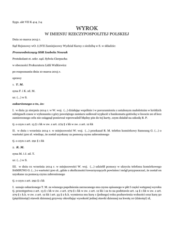 Sygn. akt VII K 414 /14 WYROK W IMIENIU RZECZYPOSPOLITEJ POLSKIEJ Dnia 10 marca 2015 r. Sąd Rejonowy wO. (1)VII Zamiejscowy Wydział Karny z siedzibą w S. w składzie: Przewodniczący SSR Izabela Nowak Protokolant st. sekr. sąd. Sylwia Cierpucha w obecności Prokuratora Lidii Walkiewicz po rozpoznaniu dnia 10 marca 2015 r. sprawy 1. T. M. syna F. i K. zd. M. ur. (...) w S. oskarżonego o to, że: I. w dniu 31 sierpnia 2014 r. w W. woj. (...) działając wspólnie i w porozumieniu z ustalonym małoletnim w krótkich odstępach czasu w wykonaniu z góry powziętego zamiaru usiłował wypłacić z bankomatu gotówkę w kwocie 20 zł lecz zamierzonego celu nie osiągnął ponieważ wprowadził błędny pin do tej karty, czym działał na szkodę B. P. tj. o czyn z art. 13 § 1 kk w zw. z art. 279 § 1 kk w zw. z art. 12 kk II. w dniu 1 września 2014 r. w miejscowości W. woj. (...) przekazał R. M. telefon komórkowy Samsung G. (...) o wartości 500 zł. wiedząc, że został uzyskany za pomocą czynu zabronionego tj. o czyn z art. 291 § 1 kk 2. R. M. syna M. i J. zd. T. ur. (...) w S. III. w dniu 01 września 2014 r. w miejscowości W. woj. (...) udzielił pomocy w ukryciu telefonu komórkowego SAMSUNG G. (...) o wartości 500 zł., gdzie z okoliczności towarzyszących powinien i mógł przypuszczać, że został on uzyskane za pomocą czynu zabronionego tj. o czyn z art. 292 § 1 kk I. uznaje oskarżonego T. M. za winnego popełnienia zarzucanego mu czynu opisanego w pkt I części wstępnej wyroku tj. przestępstwa z art. 13 § 1 kk w zw. z art. 279 § 1 kk w zw. z art. 12 kk i za to na podstawie art. 14 § 1 kk w zw. z art. 279 § 1 k.k. w zw. z art. 12 kk i art. 33 § 2 k.k. wymierza mu karę 1 (jednego) roku pozbawienia wolności oraz karę 50 (pięćdziesiąt) stawek dziennej grzywny określając wysokość jednej stawki dziennej na kwotę 10 (dziesięć) zł, II. uniewinnia T. M. od popełnienia zarzucanego mu czynu opisanego w pkt II części wstępnej wyroku, III. uznaje oskarżonego R. M. za winnego popełnienia zarzucanego mu czynu opisanego w pkt III części wstępnej wyroku z tym, że przyjmuje, iż wartość telefonu wynosi 22 (dwadzieścia dwa) złote tj. wykroczenia z art. 122 § 2 kw i za to na podstawie art. art. 122 § 2 kw. wymierza mu karę 600 (sześćset) złotych grzywny, IV. na podstawie art. 69 § 1 i 2 k.k. i art. 70 § 2 k.k. wykonanie orzeczonej w pkt. I kary pozbawienia wolności zawiesza oskarżonemu T. M. warunkowo na okres próby 3 (trzech) lat, V. na podstawie art. 73 § 2 k.k. w okresie próby oddaje oskarżonego T. M. pod dozór kuratora sądowego, VI. na podstawie art. 63 § 1 k.k. na poczet orzeczonej w pkt. I kary grzywny zalicza oskarżonemu T. M. okres jego zatrzymania od dnia 08 września 2014 roku do dnia 09 września 2014 roku, przyjmując, iż jeden dzień rzeczywistego pozbawienia wolności jest równoważny dwóm dziennym stawkom grzywny, VII. na podstawie art. 624 § 1 k.p.k. i art. 17 ustawy z dnia 23 czerwca 1973 roku o opłatach w sprawach karnych zwalnia oskarżonych od kosztów sądowych w sprawie, w tym opłaty zaliczając je na rachunek Skarbu Państwa. Sygn. akt. VII K 414/14 UZASADNIENIE Na podstawie wyników rozprawy głównej Sąd ustalił następujący stan faktyczny: W dniu 31 sierpnia 2014 r. ok. godz. 23.00 B. P. przebywała na boisku miejskim Świteź w W. na zabawie tanecznej. B. P. zostawiła swoją torebkę koloru czarnego na jednej z ławek, torebkę przykryła kurtką. W torebce znajdowały się: dowód osobisty, dowód rejestracyjny na motorower marki R., dwie karty płatnicze (...) i B.’s, karta biblioteczna wraz z kartką i pinem do tej karty, dwa telefony komórkowe, jeden marki S. (...), drugi marki H.. Kiedy B. P. wróciła okazało się, że na ławce nie ma już jej torebki. /Dowód: zeznania świadka B. P. – k.8, 16-17, 55; Na stadionie miejskim w W. w dniu 31 sierpnia 2014. Przebywał także T. M.. W pewnej chwili do stojącego pod sceną T. M. podszedł D. R. (1) i powiedział, żeby T. M. poszedł z nim do bankomatu. D. R. (1) i T. M. poszli razem do bankomatu przy ul. (...) w W.. T. M. zapytał się D. R. (1) skąd on ma karty. Dowiedział się wtedy, że D. R. (1) ukradł komuś torebkę. T. M. widział wtedy, że D. R. (1) miał przy sobie dwa telefony komórkowe, jeden marki S. (...) i drugi marki H.. D. R. (1) dał T. M. jedną kartę do bankomatu. T. M. podszedł do bankomatu włożył do niego kartę, która dał mu D. R. (1) i chciał wypłacić kwotę 20 złotych. D. R. (1) podał mu pin do karty. T. M. trzykrotnie wpisywał równe piny do karty. Kody pin były błędne i karta została zatrzymana przez bankomat. D. R. (1) następnie dał T. M. telefon komórkowy marki S. (...). /Dowód: wyjaśnienia oskarżonego T. M. (częściowo) – k. 41, 71-73, 84, 113v; zeznania świadka D. R. (1) (częściowo) – k. 30, 33, 114; zeznania świadka D. R. (2) – k. 44-45, 114v; zeznania świadka T. B. – k. 75, 114v-115/ W dniu 1 września 2014 r., w godzinach popołudniowych T. M. poszedł do swojego kuzyna R. M.. T. M. dał R. M. telefon komórkowy marki S. (...). Telefon miał pęknięty wyświetlacz oraz uszkodzoną tylną klapkę. R. M. ze swojego telefonu przełożył klapkę do telefonu, który otrzymał od T. M.. R. M. domyślał, się, że telefon jest kradziony. R. M. miał przechować ten telefon u siebie i w tym czasie mógł z niego korzystać. /Dowód: wyjaśnienia oskarżonego T. M. (częściowo) – k. 41, 71-73, 84, 113v; wyjaśnienia oskarżonego R. M. – k. 67, 71-73, 113v/ Telefon komórkowy marki H. (...) został zatrzymany w miejscu zamieszkania D. R. (1), a telefon komórkowy marki S. (...) numer (...) został zatrzymany w miejscu zamieszkania R. M.. B. P. odebrała oba telefony. Telefon komórkowy marki S. (...) numer (...) miał uszkodzony wyświetlacz. /Dowód: protokoły przeszukania – k. 24-26, 49-51; pokwitowanie – k. 56/ Zgodnie z opinią biegłego sądowego z zakre