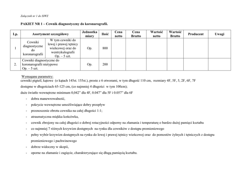 Załącznik nr 1 do SIWZ PAKIET NR 1 – Cewnik diagnostyczny do koronarografii. Lp. 1 2. Asortyment szczegółowy W tym cewniki do lewej i prawej tętnicy wieńcowej oraz do wentrykulografii Op. – 5 szt. Cewniki diagnostyczne do koronarografii nietypowe Op. – 5 szt. Cewniki diagnostyczne do koronarografii Jednostka miary Ilość Op. 800 Op. 200 Cena netto Cena Brutto Wartość netto Wartość Brutto Producent Wymagane parametry: cewniki pigteil, kątowe (o kątach 145st. 155st.), proste z 6 otworami, w tym długość 110 cm, rozmiary 4F, 5F, 5, 2F, 6F, 7F dostępne w długościach 65-125 cm, (co najmniej 4 długości w tym 100cm); duŜe światło wewnętrzne minimum 0,042” dla 4F, 0.047” dla 5F i 0.057” dla 6F - dobra manewrowalność, - pokrycie wewnętrzne umoŜliwiające dobry przepływ - przenoszenie obrotu cewnika na całej długości 1:1; - atraumatyczna miękka końcówka, - cewnik zbrojony na całej długości o dobrej rotacyjności odporny na złamania i temperaturę o bardzo duŜej pamięci kształtu - co najmniej 7 róŜnych krzywizn dostępnych na rynku dla cewników z dostępu promieniowego - pełny wybór krzywizn dostępnych na rynku do lewej i prawej tętnicy wieńcowej oraz do pomostów Ŝylnych i tętniczych z dostępu promieniowego i pachwinowego - dobrze widoczny w skopii, - oporne na złamanie i zagięcie, charakteryzujące się długą pamięcią kształtu. Uwagi PAKIET NR 2 – Cewnik prowadzący do koronaroplastyki. Lp. Asortyment szczegółowy Jednostka miary Ilość 1 Cewnik prowadzący do koronaroplastyki wieńcowej Op. – 1 szt OP. 1500 Cena netto Cena Brutto Wartość netto Wartość Brutto Producent Uwagi Wymagane parametry: - cewniki o duŜej średnicy wewnętrznej min. 0,071” dla 6F, 0,058” dla 5F,0,081” dla 7F, 0,090”dla 8F –przy zachowaniu zbrojenia metalowego - cewniki zbrojone metalowym oplotem, zapewniające bardzo dobre podparcie - oporne na złamanie i zagięcie, charakteryzujące się długą pamięcią kształtu, zachowujący niezmienne światło na całej długości łącznie z końcówką - dostępne w rozmiarach 5F – 8F, - końcówka atraumatyczna, dobrze widoczna w skopii, - pełna gama kształtów i krzywizn (dla dojścia z tętnicy promieniowej, ramiennej; do angioplastyki przęseł aortalno-wieńcowych); - instrukcja obsługi w języku polskim PAKIET NR 3 – Introducer Lp. 1 2. Asortyment szczegółowy Jednostka miary Ilość OP. 500 2000 40 40 OP. 2000 5F Zestaw do kaniulacji tętnicy: introducer z zastawką i portem 6F bocznym, igła, prowadnik 7F Op. 1 szt 8F Introduktory do tętnicy promieniowej Op. 1 szt. Cena netto Cena Brutto Wartość netto Wartość Brutto Producent Wymagane parametry: - zróŜnicowane profile 5F – 10F, - długości 11 - 23 cm; - atraumatyczne, odporne na złamanie, - zastawka zapewniająca optymalną hemostazę i niskie opory, - atraumatyczne przejście pomiędzy końcówką a poszerzaczem, - w asortymencie zestawy do kaniulacji t. promieniowej 5 - 7F długości 11 - 23cm (igła21G dł. 38 mm oraz prowadnik o średnicy 0,018” - dostępnego w dwóch wersjach roboczych o prostej końcówce i wygiętej pod kątem 45 stopni, prowadnik, rozszerzacz, koszulka) Uwagi PAKIET NR 4 – Introducer zbrojony długi Lp. 1 Jednostka miary Asortyment szczegółowy Introducery - zbrojne o długości 11 – 35 cm (koszulki wprowadzające) Op. – 1 szt 11 cm 24 cm Ilość Cena netto Cena Brutto Wartość netto Wartość Brutto 30 OP. 35 cm 20 20 Wymagane parametry: - zróŜnicowane profile 6F – 7F, - odporne na załamanie i zagięcia, - zastawka hemostatyczna zapewniająca optymalną hemostazę i niskie opory przy wprowadzaniu cewnika, - atraumatyczne przejście pomiędzy końcówką a poszerzaczem, - dające dobre podparcie dla cewnika prowadzącego przy krętym przebiegu tętnic biodrowych, - zestawy o duŜej średnicy wewnętrznej - pokrycie powłoką o właściwościach hydrofilnych Producent Uwagi PAKIET NR 5 – Prowadnik do koronarografii Lp. Asortyment szczegółowy Jednostka miary Ilość 1 Prowadniki do koronarografii OP. 1000 Cena netto Cena Brutto Wymagane parametry: - dostępne zakresy średnic zewnętrznych 0,018” - 0,038” - dostępne długości 150 - 260 cm - zakończone prosto lub w kształcie litery „J” - ciągłość materiału zapewniająca bezpieczeństwo zabiegu - giętki, dobrze widoczny w skopii - sztywna część proksymalna prowadnika zapewniająca dobrą manewrowalność Wartość netto Wartość Brutto Producent Uwagi PAKIET NR 6 – Prowadnik hydrofilny Lp. 1 2 Asortyment szczegółowy Prowadnik hydrofilny dł. do 180 cm Op. – 1 szt Prowadnik hydrofilny dł. 180 – 300 cm Op. – 1 szt Jednostka miary Ilość OP. 1500 OP 1000 Cena netto Cena Brutto Wartość netto Wartość Brutto Producent Wymagane parametry: • Średnice: 0,018”; 0,020”; 0,025”; 0,032” 0,035”; 0.038” • dostępne róŜne długości ściętej końcówki rdzenia (taper) short = 1 cm, regular = 3 cm oraz long = 5 cm • końcówka prosta, zagięta 45 stopni, typu J, krzywizna Bolia • rdzeń nitinolowy zatopiony w poliuretanie, wykonany z jednego kawałka, z bardzo dobrą kontrola trakcji 1:1, odporny na odkształcenia i na załamanie struktury podłuŜnej • w poliuretanie dodatkowo zatopione nitki wolframowe • trwała powłoka hydrofilna na całej długości • atraumatyczna, miękka końcówka, z pamięcią kształtu • dostępne w wersji o standardowej sztywności, półsztywnej i sztywnej • dostępne w opcji z kształtowalną końcówką a) długości 50, 80, 120 ,150, 180 cm b) długości 220, 260, 300 cm Uwagi PAKIET NR 7 – Prowadnik do koronaroplastyk Lp. Asortyment szczegółowy Jednostka miary Ilość 1 Prowadniki angioplastyczne Op. – 1 szt. OP. 1500 Cena netto Cena Brutto Wartość netto Wartość Brutto Producent Uwagi Wymagane parametry: - średnica 0.014” - dostępna końcówka prosta i J - dostępny w długości 190 - 300 cm bez stosowania przedłuŜacza