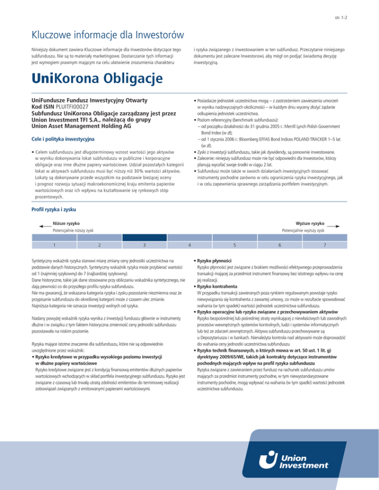str. 1-2 Kluczowe informacje dla Inwestorów Niniejszy dokument zawiera Kluczowe informacje dla Inwestorów dotyczące tego subfunduszu. Nie są to materiały marketingowe. Dostarczanie tych informacji jest wymogiem prawnym mającym na celu ułatwienie zrozumienia charakteru i ryzyka związanego z inwestowaniem w ten subfundusz. Przeczytanie niniejszego dokumentu jest zalecane Inwestorowi, aby mógł on podjąć świadomą decyzję inwestycyjną. UniKorona Obligacje UniFundusze Fundusz Inwestycyjny Otwarty Kod ISIN PLUITFI00027 Subfundusz UniKorona Obligacje zarządzany jest przez Union Investment TFI S.A., należącą do grupy Union Asset Management Holding AG • Posiadacze jednostek uczestnictwa mogą – z zastrzeżeniem zawieszenia umorzeń w wyniku nadzwyczajnych okoliczności – w każdym dniu wyceny złożyć żądanie odkupienia jednostek uczestnictwa. • Poziom referencyjny (benchmark subfunduszu): – od początku działalności do 31 grudnia 2005 r.: Merrill Lynch Polish Government Bond Index (w zł); – od 1 stycznia 2006 r.: Bloomberg EFFAS Bond Indices POLAND TRACKER 1–5 lat (w zł). • Zyski z inwestycji subfunduszu, takie jak dywidendy, są ponownie inwestowane. • Zalecenie: niniejszy subfundusz może nie być odpowiedni dla Inwestorów, którzy planują wycofać swoje środki w ciągu 2 lat. • Subfundusz może także w swoich działaniach inwestycyjnych stosować instrumenty pochodne zarówno w celu ograniczenia ryzyka inwestycyjnego, jak i w celu zapewnienia sprawnego zarządzania portfelem inwestycyjnym. Cele i polityka inwestycyjna • Celem subfunduszu jest długoterminowy wzrost wartości jego aktywów w wyniku dokonywania lokat subfunduszu w publiczne i korporacyjne obligacje oraz inne dłużne papiery wartościowe. Udział pozostałych kategorii lokat w aktywach subfunduszu musi być niższy niż 30% wartości aktywów. Lokaty są dokonywane przede wszystkim na podstawie bieżącej oceny i prognoz rozwoju sytuacji makroekonomicznej kraju emitenta papierów wartościowych oraz ich wpływu na kształtowanie się rynkowych stóp procentowych. Profil ryzyka i zysku Niższe ryzyko Wyższe ryzyko Potencjalnie niższy zysk Potencjalnie wyższy zysk 1 2 3 Syntetyczny wskaźnik ryzyka stanowi miarę zmiany ceny jednostki uczestnictwa na podstawie danych historycznych. Syntetyczny wskaźnik ryzyka może przybierać wartości od 1 (najmniej ryzykowny) do 7 (najbardziej ryzykowny). Dane historyczne, takie jak dane stosowane przy obliczaniu wskaźnika syntetycznego, nie dają pewności co do przyszłego profilu ryzyka subfunduszu. Nie ma gwarancji, że wskazana kategoria ryzyka i zysku pozostanie niezmienna oraz że przypisanie subfunduszu do określonej kategorii może z czasem ulec zmianie. Najniższa kategoria nie oznacza inwestycji wolnych od ryzyka. Nadany powyżej wskaźnik ryzyka wynika z inwestycji funduszu głównie w instrumenty dłużne i w związku z tym faktem historyczna zmienność ceny jednostki subfunduszu pozostawała na niskim poziomie. Ryzyka mające istotne znaczenie dla subfunduszu, które nie są odpowiednio uwzględnione przez wskaźnik: • Ryzyko kredytowe w przypadku wysokiego poziomu inwestycji w dłużne papiery wartościowe Ryzyko kredytowe związane jest z kondycją finansową emitentów dłużnych papierów wartościowych wchodzących w skład portfela inwestycyjnego subfunduszu. Ryzyko jest związane z czasową lub trwałą utratą zdolności emitentów do terminowej realizacji zobowiązań związanych z emitowanymi papierami wartościowymi. 4 5 6 7 • Ryzyko płynności Ryzyko płynności jest związane z brakiem możliwości efektywnego przeprowadzenia transakcji mającej za przedmiot instrument finansowy bez istotnego wpływu na cenę jej realizacji. • Ryzyko kontrahenta W przypadku transakcji zawieranych poza rynkiem regulowanym powstaje ryzyko niewywiązania się kontrahenta z zawartej umowy, co może w rezultacie spowodować wahania (w tym spadek) wartości jednostek uczestnictwa subfunduszu. • Ryzyko operacyjne lub ryzyko związane z przechowywaniem aktywów Ryzyko bezpośredniej lub pośredniej straty wynikającej z niewłaściwych lub zawodnych procesów wewnętrznych systemów kontrolnych, ludzi i systemów informatycznych lub też ze zdarzeń zewnętrznych. Aktywa subfunduszu przechowywane są u Depozytariusza i w bankach. Nienależyta kontrola nad aktywami może doprowadzić do wahania ceny jednostki uczestnictwa subfunduszu. • Ryzyko technik finansowych, o których mowa w art. 50 ust. 1 lit. g) dyrektywy 2009/65/WE, takich jak kontrakty dotyczące instrumentów pochodnych mających wpływ na profil ryzyka subfunduszu Ryzyka związane z zawieraniem przez fundusz na rachunek subfunduszu umów mających za przedmiot instrumenty pochodne, w tym niewystandaryzowane instrumenty pochodne, mogą wpływać na wahania (w tym spadki) wartości jednostek uczestnictwa subfunduszu. str. 2-2 Kluczowe informacje dla Inwestorów UniKorona Obligacje Opłaty • Opłaty ponoszone przez Inwestora służą pokryciu kosztów związanych z działalnością subfunduszu, w tym kosztów dystrybucji i kosztów wprowadzenia do obrotu. • Opłaty te zmniejszają potencjalny wzrost inwestycji. • Wszystkie opłaty podawane są w wysokości maksymalnej. W niektórych przypadkach Inwestor może płacić niższą opłatę. Informacje dotyczące bieżącej wysokości opłat można uzyskać w placówkach dystrybutorów oraz w Punkcie Obsługi Klienta TFI. • Wartość liczbowa określająca wysokość opłat bieżących opiera się na wydatkach z roku 2012, w związku z czym wysokość opłat bieżących może co roku ulegać zmianie. • Szczegółowe zasady dotyczące opłat znajdują się w prospekcie informacyjnym UniFunduszeFIO w pkt. 20. Prospekt informacyjny jest dostępny na stronie internetowej www.union-investment.pl. • W przypadku tego subfunduszu opłata za wyniki nie jest pobierana. Opłaty jednorazowe pobierane przed lub po dokon