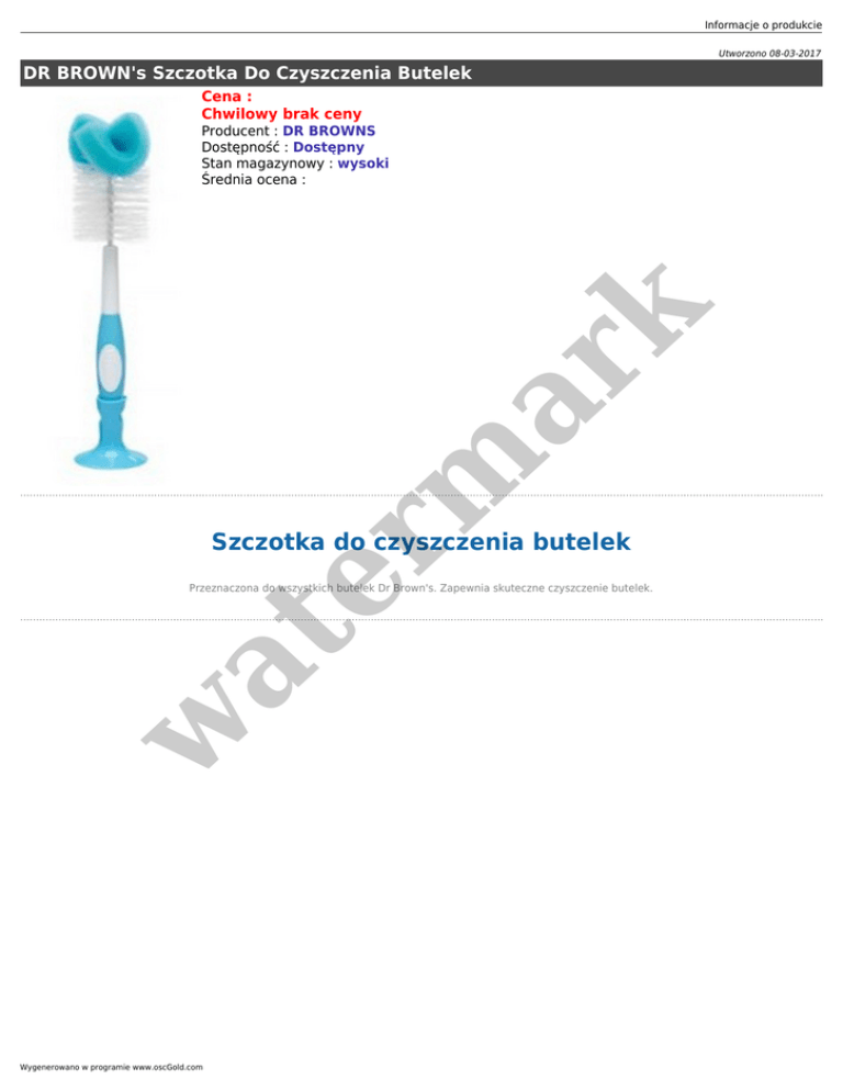 Informacje o produkcie Utworzono 08-03-2017 DR BROWN's Szczotka Do Czyszczenia Butelek Cena : Chwilowy brak ceny er m ar k Producent : DR BROWNS Dostępność : Dostępny Stan magazynowy : wysoki Średnia ocena : Szczotka do czyszczenia butelek w at Przeznaczona do wszystkich butelek Dr Brown's. Zapewnia skuteczne czyszczenie butelek. Wygenerowano w programie www.oscGold.com