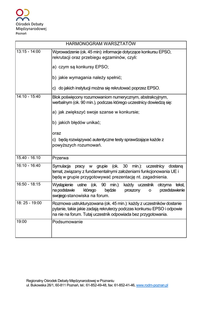 HARMONOGRAM WARSZTATÓW 13:15 - 14:00 Wprowadzenie (ok. 45 min): informacje dotyczące konkursu EPSO, rekrutacji oraz przebiegu egzaminów, czyli: a) czym są konkursy EPSO; b) jakie wymagania należy spełnić; c) do jakich instytucji można się rekrutować poprzez EPSO. 14:10 - 15:40 Blok poświęcony rozumowaniom numerycznym, abstrakcyjnym, werbalnym (ok. 90 min.), podczas którego uczestnicy dowiedzą się: a) jak zwiększyć swoje szanse w konkursie; b) jakich błędów unikać; oraz c) będą rozwiązywać autentyczne testy sprawdzające każde z powyższych rozumowań. 15.40 - 16.10 Przerwa 16:10 - 16:40 Symulacja pracy w grupie (ok. 30 min.): uczestnicy dostaną temat, związany z fundamentalnymi założeniami funkcjonowania UE i będą w grupie przygotowywać prezentację nt. zagadnienia. 16:50 - 18:15 Wystąpienie ustne (ok. 90 min.): każdy uczestnik otrzyma tekst, na podstawie którego będzie proszony o przedstawienie swojego stanowiska na forum. 18: 25 - 19:00 Rozmowa ustrukturyzowana (ok. 45 min.): każdy z uczestników dostanie pytanie, takie jakie zadają rekruterzy podczas konkursu EPSO i odpowie na nie na forum. Tutaj uczestnik odpowiada bez przygotowania. 19:00 Podsumowanie Regionalny Ośrodek Debaty Międzynarodowej w Poznaniu ul. Bukowska 26/1, 60-811 Poznań, tel.: 61-852-49-48, fax: 61-852-41-46, www.rodm-poznan.pl