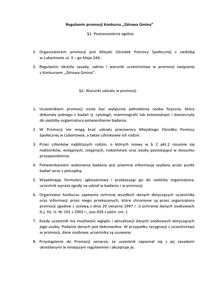 Regulamin promocji Konkursu „Zdrowa Gmina” §1. Postanowienia ogólne 1. Organizatorem promocji jest Miejski Ośrodek Pomocy Społecznej z siedzibą w Lubartowie ul. 3 – go Maja 24A. 2. Regulamin określa zasady, zakres i warunki uczestnictwa w promocji związanej z Konkursem ,,Zdrowa Gmina''. §2. Warunki udziału w promocji 1. Uczestnikiem promocji może być wyłącznie pełnoletnia osoba fizyczna, która dokonała jednego z badań tj. cytologii, mammografii lub kolonoskopii i dostarczyła do siedziby organizatora potwierdzenie badania. 2. W Promocji nie mogą brać udziału pracownicy Miejskiego Ośrodka Pomocy Społecznej w Lubartowie, a także członkowie ich rodzin. 3. Przez członków najbliższych rodzin, o których mowa w § 2 pkt.2 rozumie się małżonków, wstępnych, zstępnych, rodzeństwo oraz osoby pozostające w stosunku przysposobienia. 4. Potwierdzeniem wykonania badania jest pisemna informacja wydana przez punkt badań wraz z pieczątką. 5. Wypełniając formularz zgłoszeniowy i przekazując go do siedziby organizatora, uczestnik wyraża zgodę na udział w badaniu i w promocji. 6. Organizator konkursu zapewnia ochronę wszelkich danych dotyczących uczestnika oraz informacji przez niego przekazanych, które chronione są przez organizatora promocji zgodnie z ustawą z dnia 29 sierpnia 1997 r. o ochronie danych osobowych (t.j. Dz. U. Nr 101 z 2002 r., poz.926 z późn. zm. ). 7. Każdy uczestnik ma możliwość wglądu i aktualizacji danych osobowych dotyczących jego osoby. Podanie danych jest dobrowolne. W przypadku rezygnacji z uczestnictwa w promocji, dane osobowe uczestnika są usuwane. 8. Przystąpienie do Promocji oznacza, że uczestnik zapoznał się z jej zasadami określonymi w niniejszym regulaminie i akceptuje je. §3. Przebieg promocji 1. Promocja odbywa się w okresie od 01.06.2013 r. do 31.10.2013 r. 2. Uczestnik promocji powinien złożyć w siedzibie organizatora pisemne potwierdzenie wykonania badania z punktu je realizującego wraz z pieczątką. 3. Każdego miesiąca istnieje możliwość skorzystania przez uczestników promocji z 6 bonusów promocyjnych. Bonusem jest możliwość wykonania w lokalnym salonie urody usługi fryzjersko-kosmetycznej o wartości 100,00 złotych każda. 4. Uprawnionymi osobami do otrzymania bonusu promocyjnego są osoby, które w danym miesiącu złożą potwierdzenie wykonania badania i zostaną zarejestrowane kolejno pod numerami: 1, 5, 10, 15, 20 i 25, w danym miesiącu. 5. Uczestnik składa potwierdzenie wykonania badania każdego miesiąca trwania promocji, nie później niż do ostatniego dnia każdego miesiąca w okresie od czerwca do października 2013 r. 6. Informacje o fakcie wybrania danej osoby do wykorzystania bonusu promocyjnego zostaną przekazane drogą telefoniczną. 7. Wybór osób otrzymujących bonusy promocyjne będzie dokonany w miesiącach: lipcu (potwierdzenie badania złożone w czerwcu), sierpniu (potwierdzenie badania złożone w lipcu), wrześniu (potwierdzenie badania złożone w sierpniu), październiku (potwierdzenie badania złożone we wrześniu) i listopadzie (potwierdzenie badania złożone w październiku) 2013 r. 8. Organizator Promocji uwzględnia prawdopodobieństwo nie zarejestrowania się wymaganej liczby osób określonych w §3 pkt.3 niniejszego regulaminu. W tym przypadku miesiąc listopad 2013r. będzie ostatecznym terminem wyłonienia końcowej listy osób spośród uczestniczących przez cały okres trwania Promocji Konkursu. Oznacza to, iż maksymalnie będzie to liczba do 30 osób wyłonionych spośród tych, o których mowa w § 3 pkt.2 . §4. Postanowienia końcowe 1. Regulamin Promocji obowiązuje od dnia 31 maja 2013 r. 2. Regulamin promocji znajduje się w siedzibie Miejskiego Ośrodka Pomocy Społecznej w Lubartowie ul. 3-go Maja 24A i będzie okazywany na prośbę uczestnika konkursu oraz dostępny na stronie www.mops-lubartow.pl